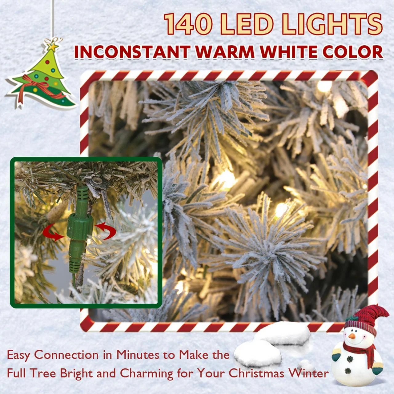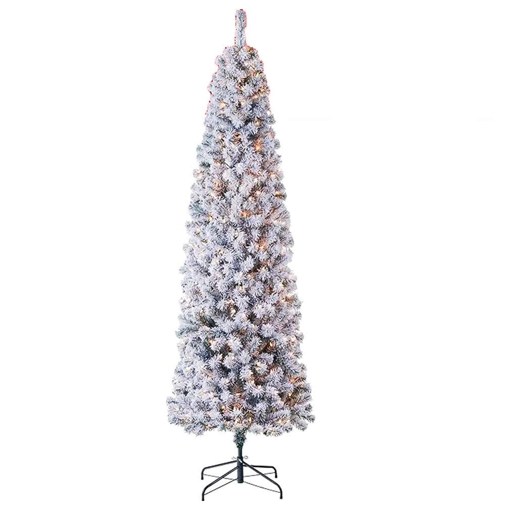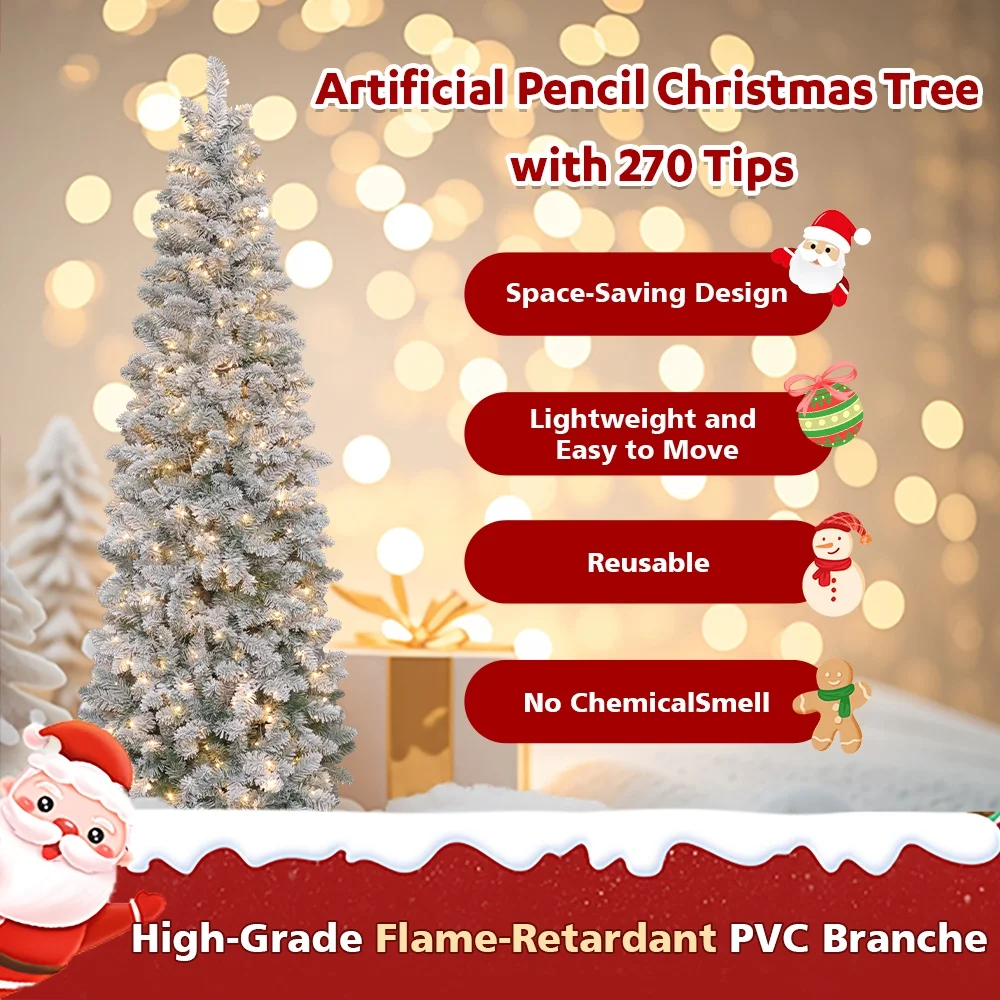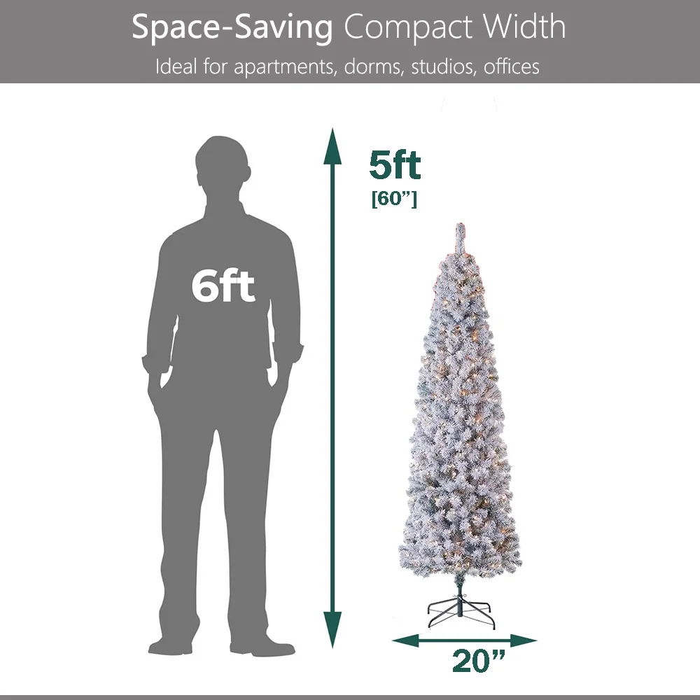 Abble 5FT Snow Flocked Artificial Slim Pencil Christmas Tree with LED Warm White Lights and Metal Stand