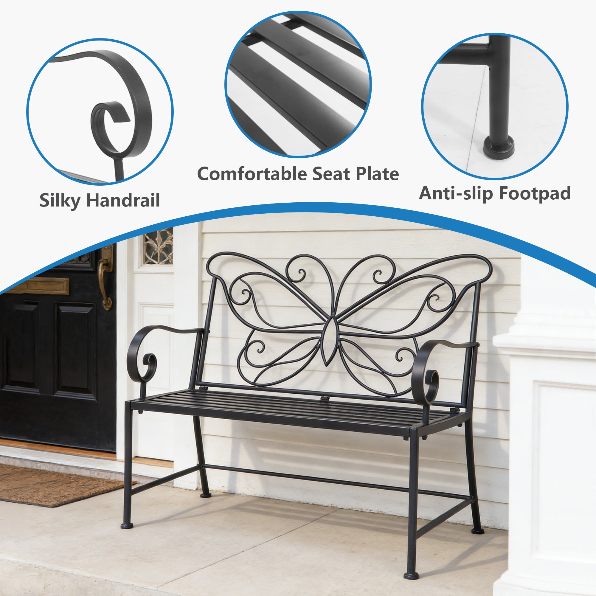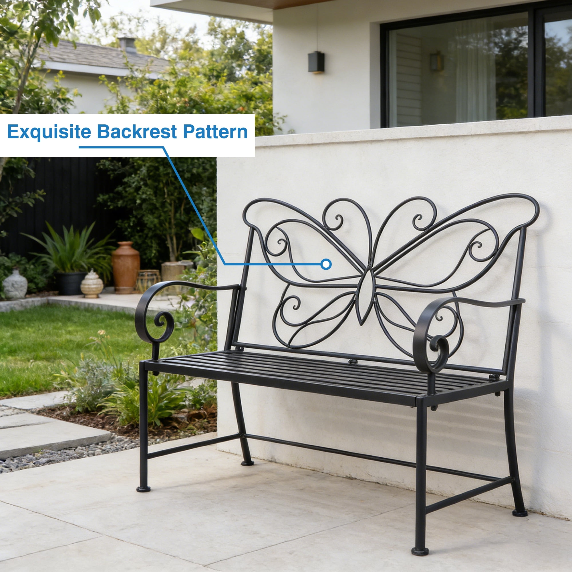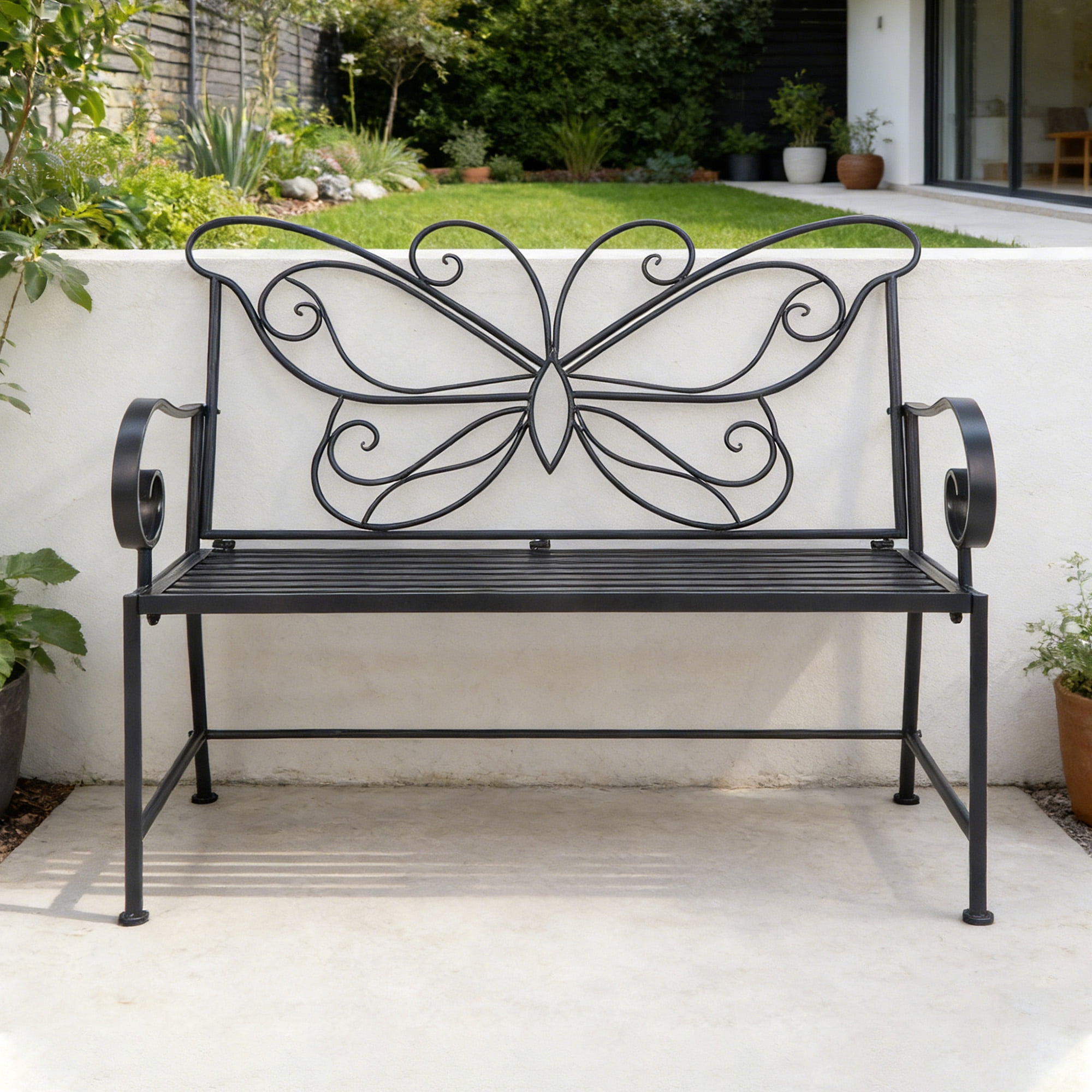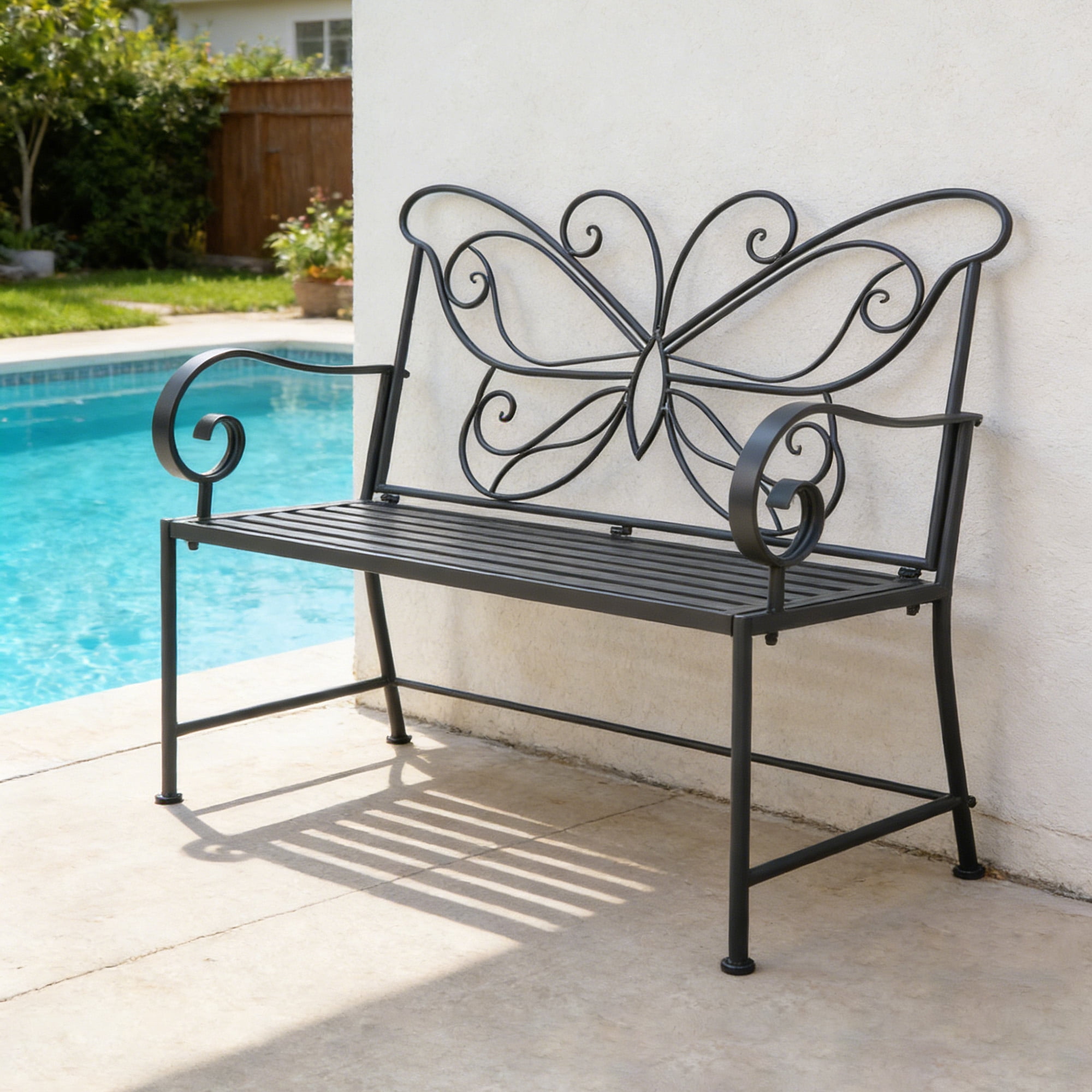 Kool 42″ Outdoor Bench Metal Butterfly Design Patio Garden Bench, Black