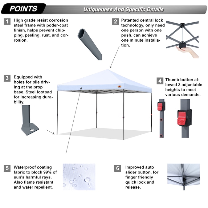 - 【EASY TO SET UP】One button setup system allows one person one minute easily to set up the pop-up canopy.