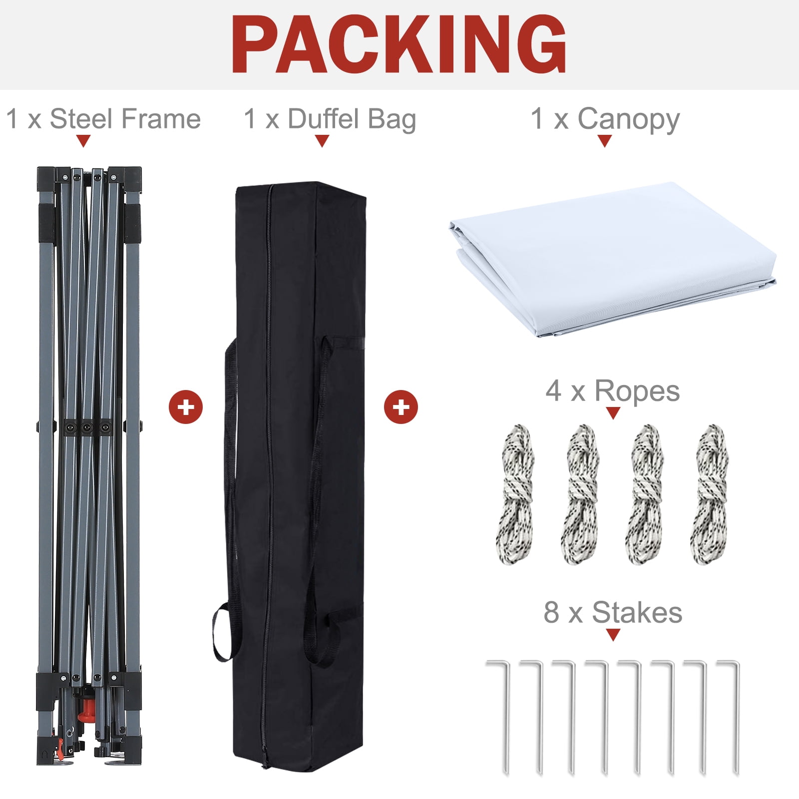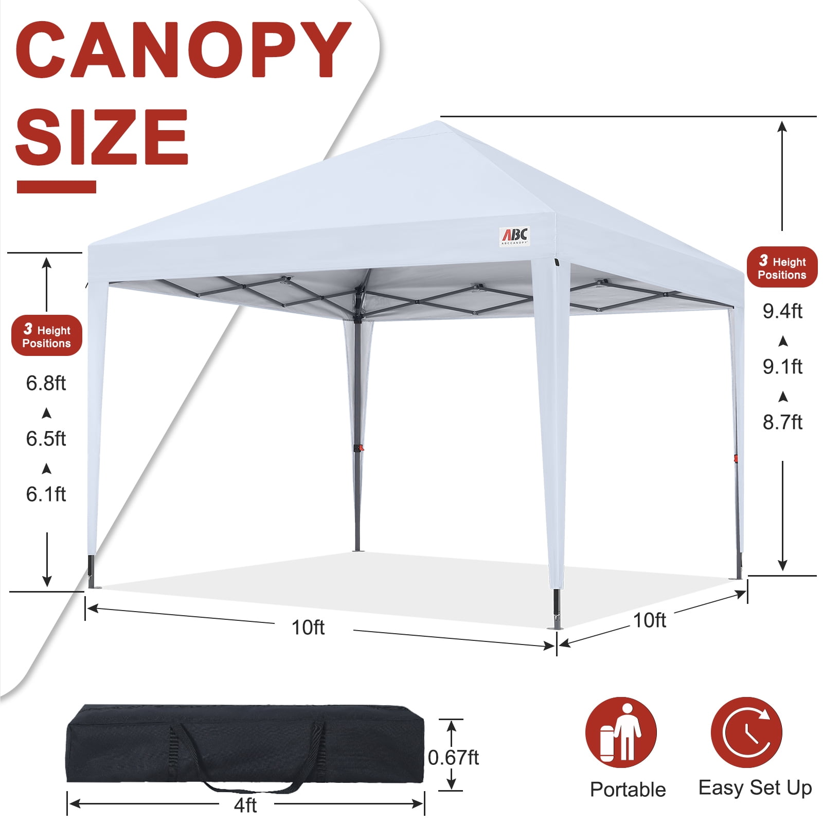 Customizable Coverage: Adjust the height to fit your needs, ensuring optimal shade and comfort for any activity. Built to Last: Constructed with a robust steel frame and water-resistant polyester fabric, this canopy is designed to withstand the elements. Sun and Rain Protection: The UV-protective fabric blocks harmful rays, while the water-resistant material keeps you dry during light rain. Quick and Easy Setup: The pop-up design allows for hassle-free assembly, so you can spend more time enjoying the outdoors. Portable and Convenient: Lightweight and compact, the canopy comes with a carry bag for easy transport and storage. Item Dimensions: 10 x 10 x 9.4 FT Water Resistance Level: Waterproof Upgrade Silver Coating Fabric: UV and Fade Resistant Adjustable:The height of legs have 3 height options. Portable Carry Bag:Carry your canopy tent to everywhere.