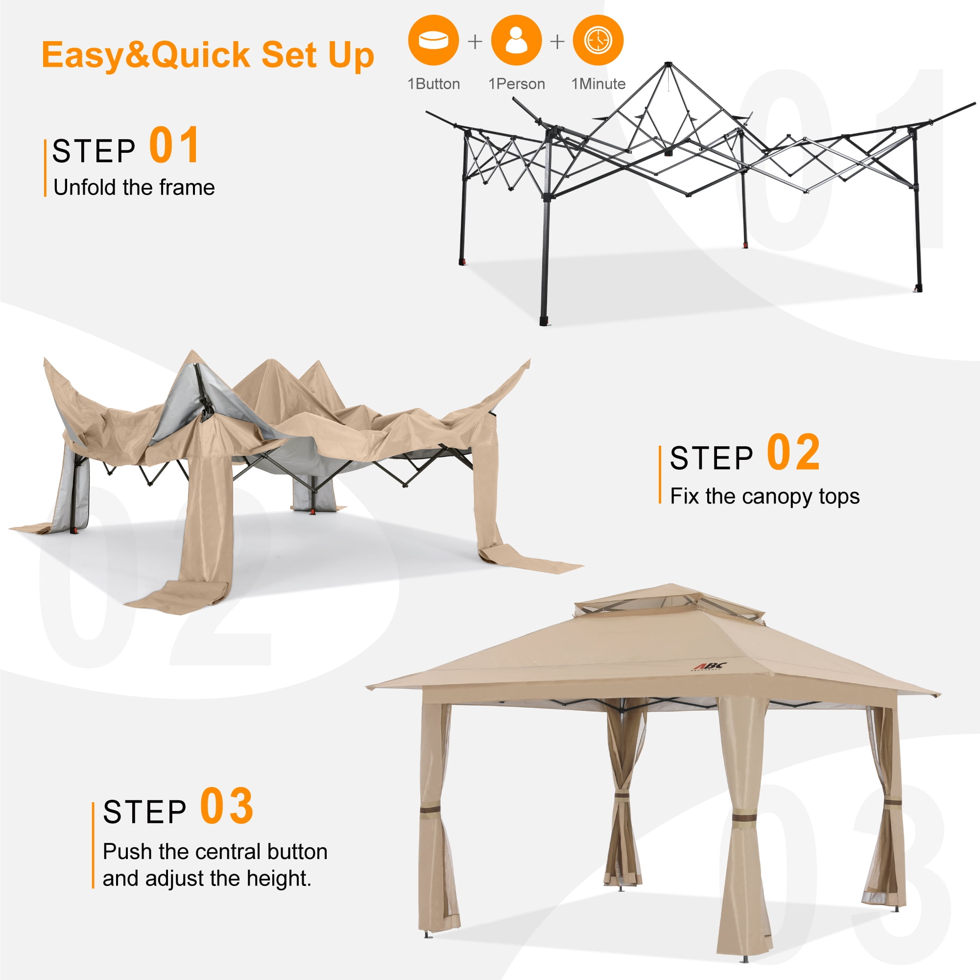 POP UP GAZEBO: The latest technology design enables ONE PERSON to easily SET UP and close the canopy in ONE MINUTE. Not only for sports, camping or trip, also for patio, backyard and screen house room. (Not suitable for lightning storm, rainstorm or snowing days use) MORE SHADE: This gazebo designed with EXTRA AWNING,10’x10′ straight leg frame and 13’x13′ coverage at the top, provides 169 square feet of coverage, roomy enough to accommodate 8-12 people and some chairs. Four removable zippered mesh walls services as a barrier to against small things, and provide MORE PRIVATE. SUN PROTECTION/WINDPROOF/WATER RESISTANCE: Each color of the top has silver coating inside, blocking 99.99% of the sun’s harmful UV rays. Stay comfortable and protected. Also this fabric is water resistance, protecting you in rainy day(not lightning storm or rainstorm).DO NOT FORGET TO USE THE ROPES AND STAKES. They will help a lot in windy days. Double top design, wind vented, It helps to ventilate the interior of the canopy helping to release trapped heat and also provides increased stability in windy conditions by allowing the wind to pass through the vent. Several drain holes are unique, keep this shelter always dry for a longer service. A compact carry bag for storage gazebo and perfect for your trunk. 4 ropes and 4 stakes bonus to secure the canopy into the ground and withstand the wind. One year after-sale protection for frame, six months after-sale protection for fabrics and accessories. If you have anything about our products, We are ready to help. 1 x Carry Bag & Frame 2 x Canopy Top 4 x Netting Wall 8 x Stake 8 x rope + 32 x curtain ring Exclusive technology provides no-fuss setup Fold-up design is lightweight and portable Automatically extending eaves provides extra shadow Water, flame and UV ray resistant Double Vented Top: Provides better air circulation and helps to improve stability in windy conditions. Large Shadow Area: Designed with expanded awning on both 4 sides, provide a bigger shade for you. Drainage Hole: There are drainage holes on each side to make sure water will not collect on the top, can extent the service of the canopy. Perfect for your backyard, patio,deck, garden, lawn or pool side. Bring you a comfortable cool space for relaxing or work. It can be used with sectionals, daybeds, and recliners at hotels, restaurants, and poolside spaces. It’s the perfect shade addition to any outdoor space and can easily be combined with any outdoor dining tables and dining chairs for maximum shade.