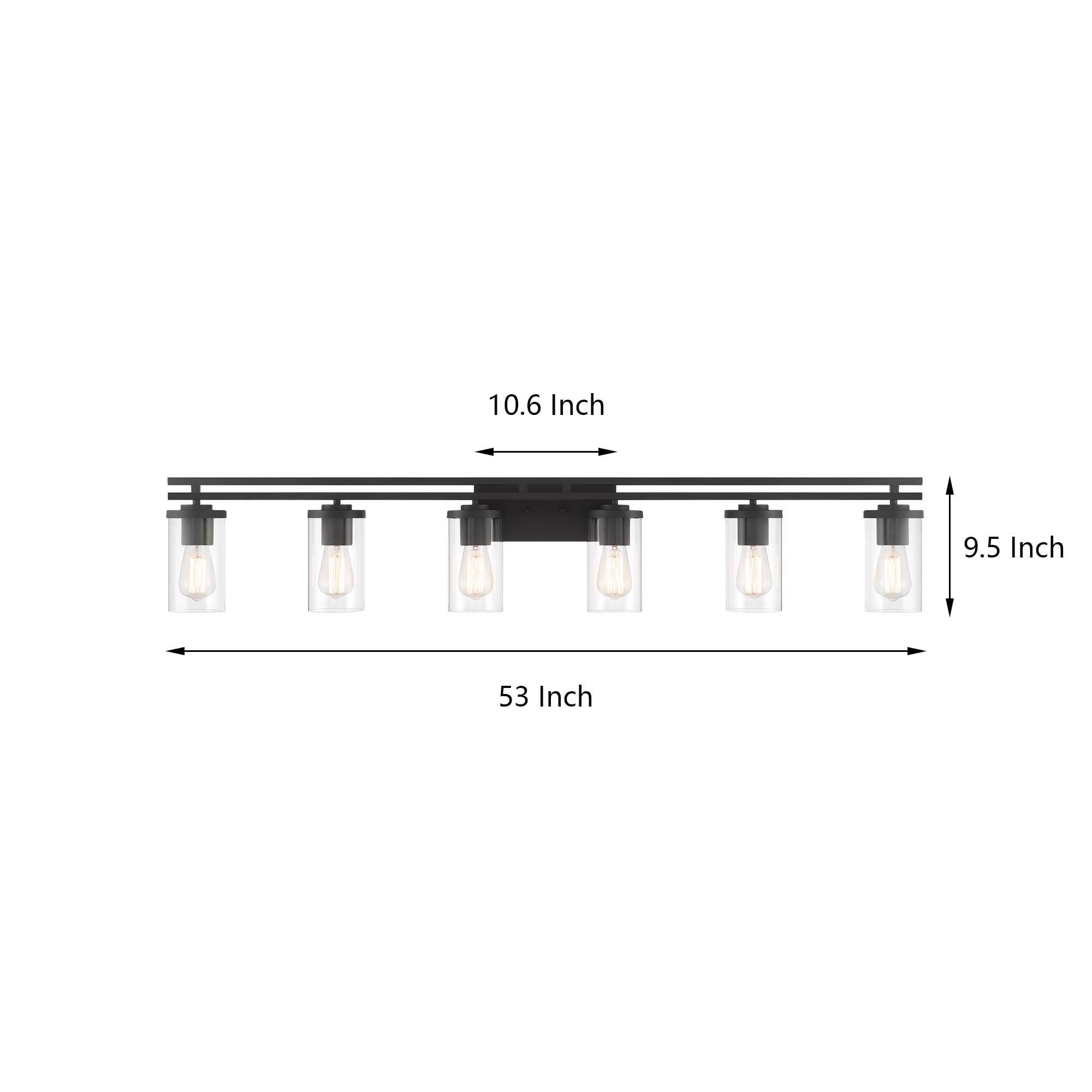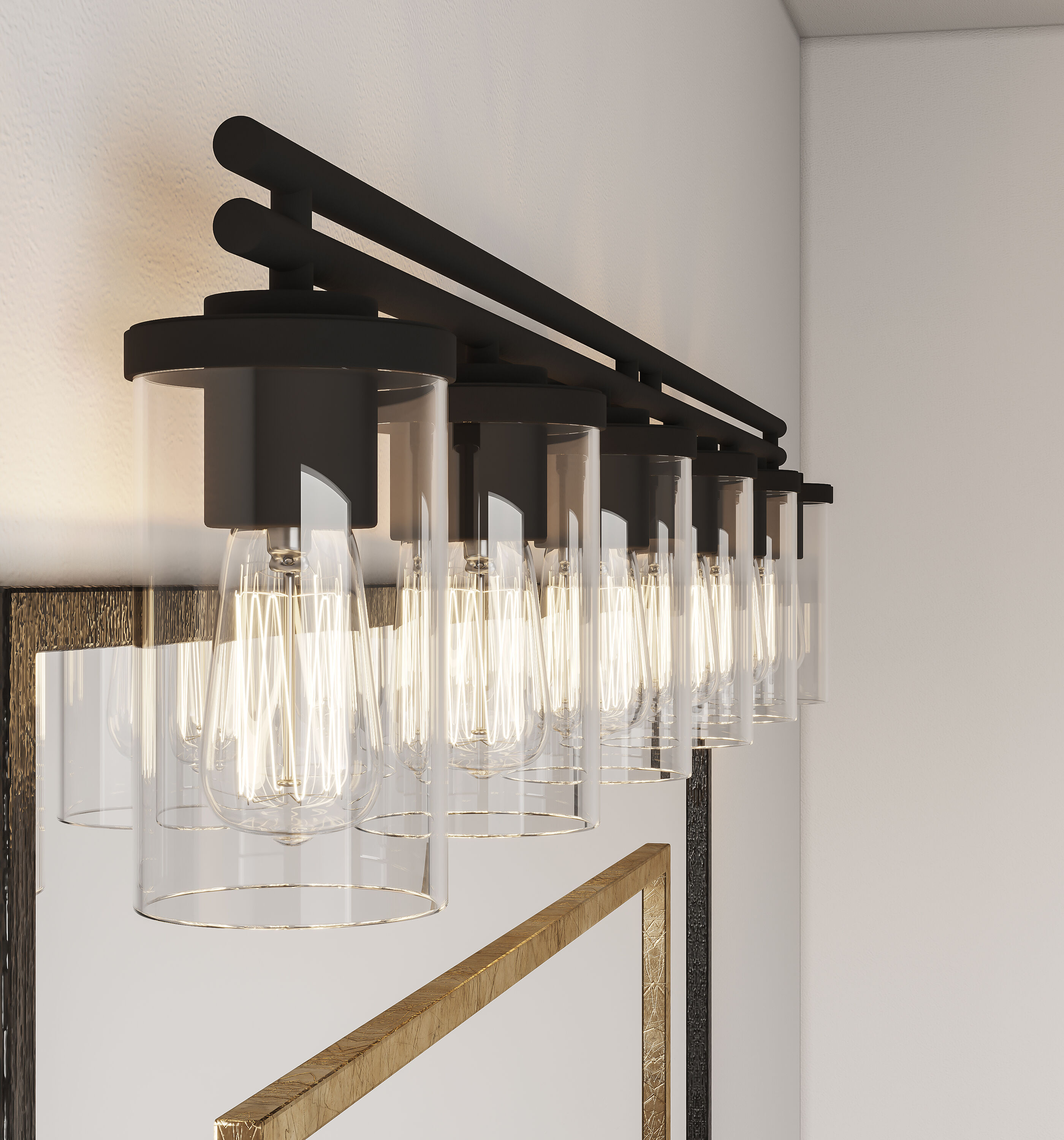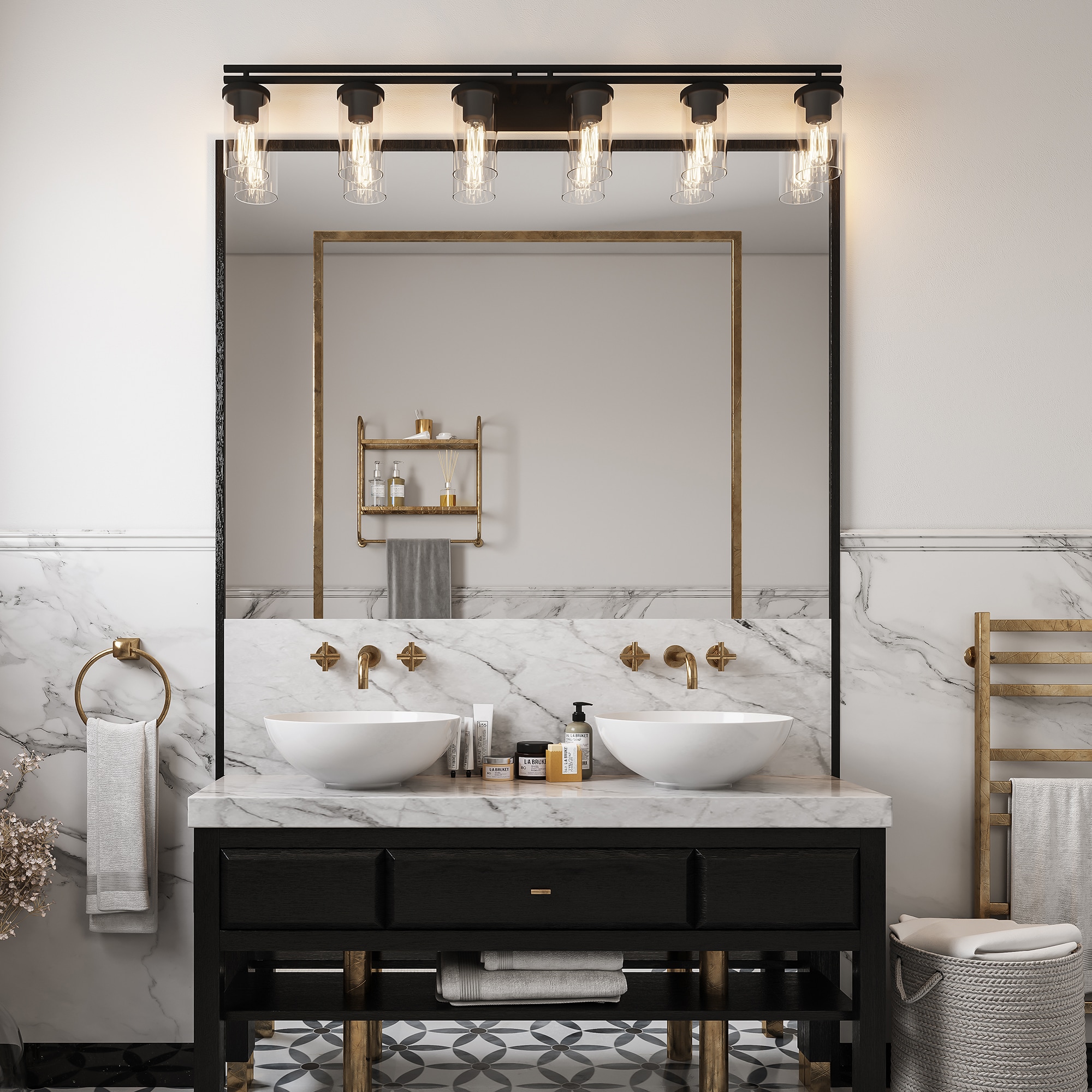This 6-light vanity light adds an ultra modern look and a boost of brightness to your main bathroom or guest bath. It features a rectangular wall-mounting plate with double linear support bars in a sleek black finish. Made from steel, this fixture includes six clear glass, drum-shaped shades that house standard bulbs up to 60 watts each (not included). This light can be installed facing up or down, depending on your preference, and it’s dimmable for customizable ambiance. Plus, the switch type is a dimmer, allowing you to easily adjust the brightness to your liking.