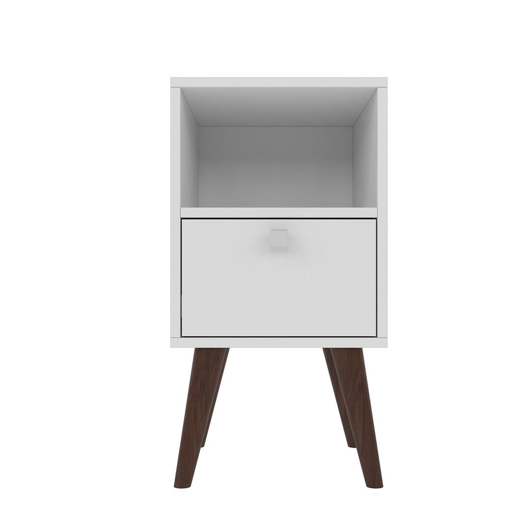 Mid-Century – Modern End Table and Nightstand for Bedroom and Living Room Use. * Upon Assembly, Measures: 12.99 in. Length, 24.8in. Height, 13.78 in. Depth. * Splayed Legs Made of Solid Wood for Fashion and Durability. * Unique Square Knob Design * Includes 1 Cubby and 1 Drawer * Perfect Piece to enhance your Living and Bedroom environment * Fashion Furniture * Home Assembly Required. All Hardware Included