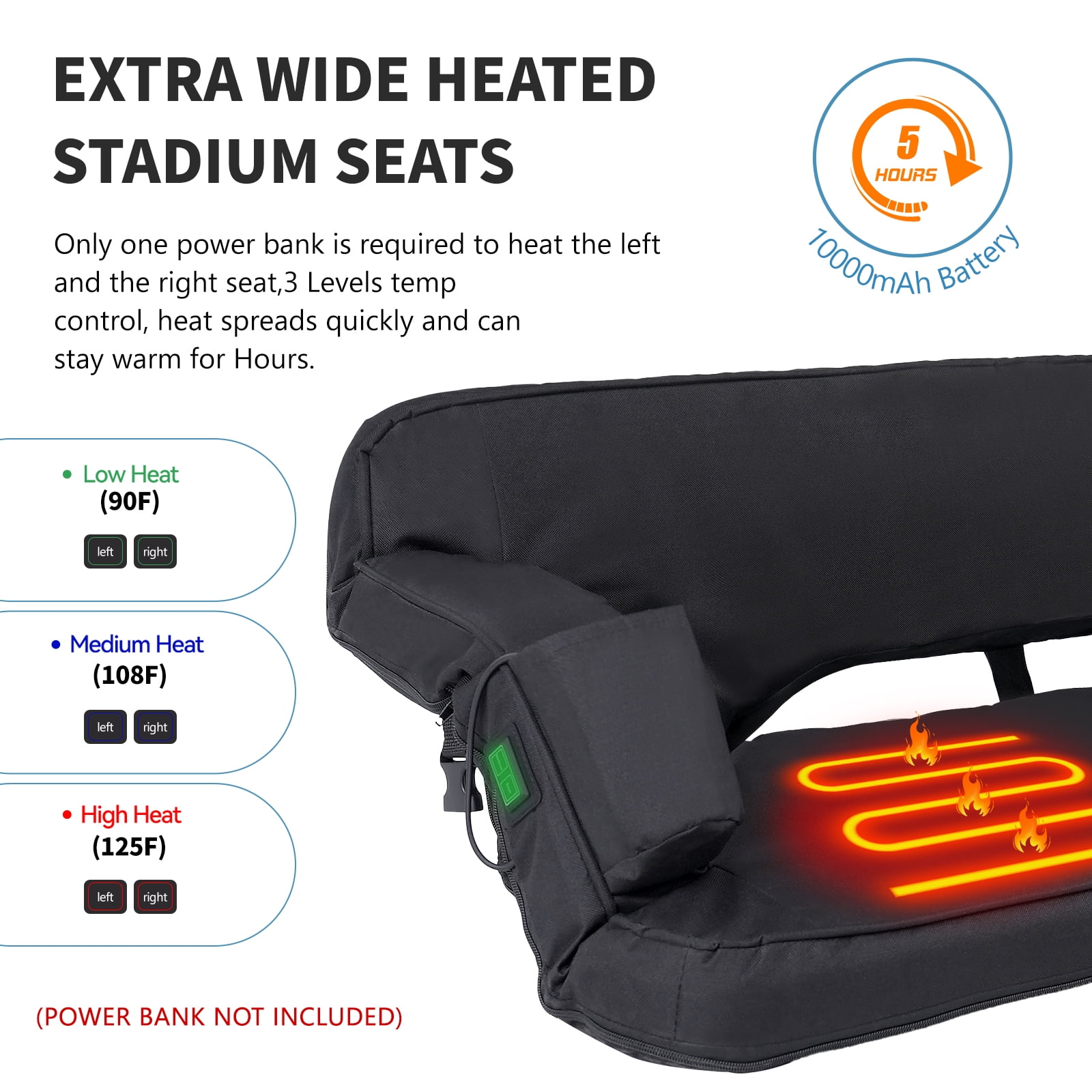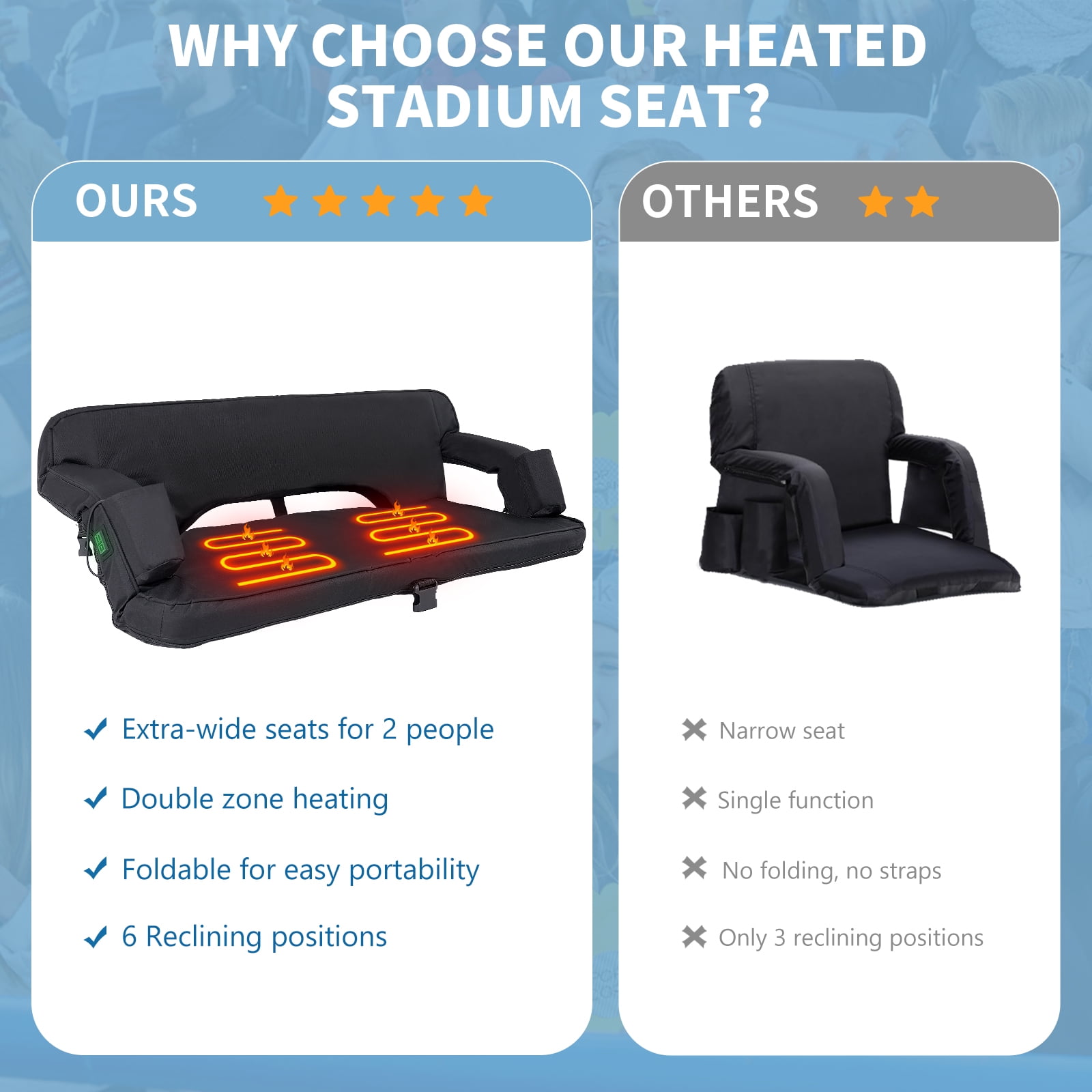 ABORON 2 Packs Heated Double Stadium Seats for Bleachers with Back Support Extra Wide Couple Bleacher Seat Portable Padded Stadium Chair, USB 3 Levels of Heat, 6 Reclining Positions