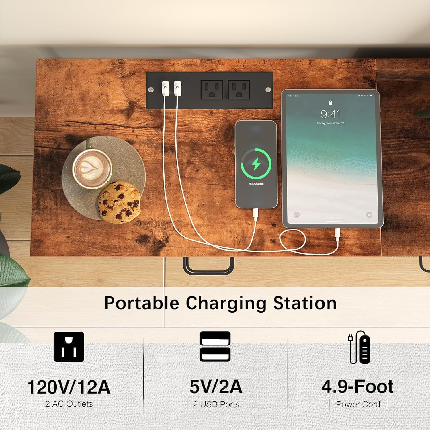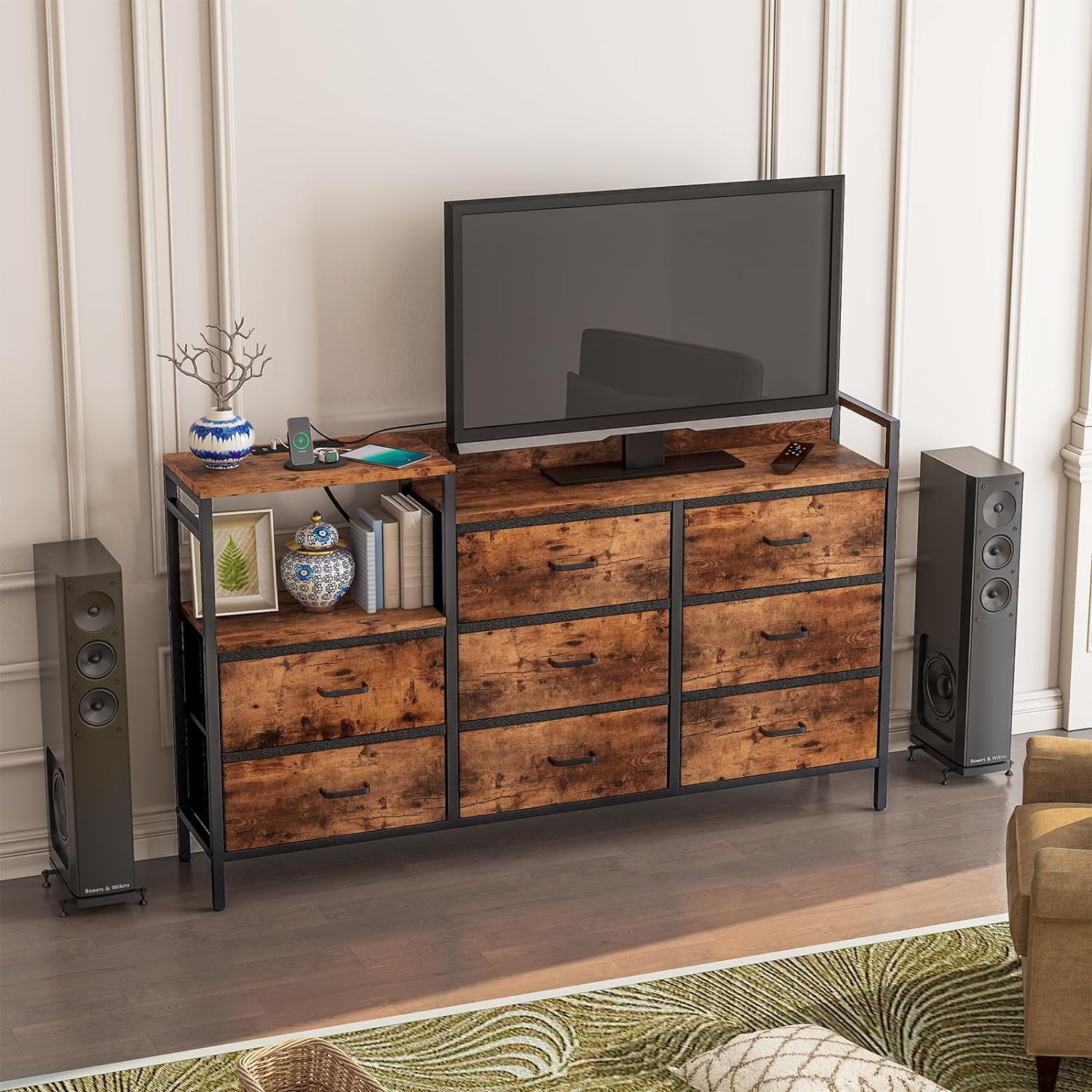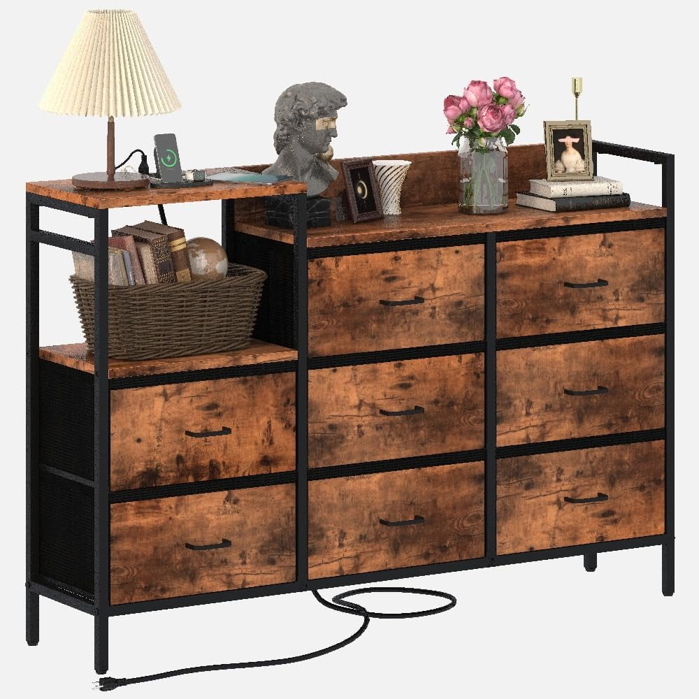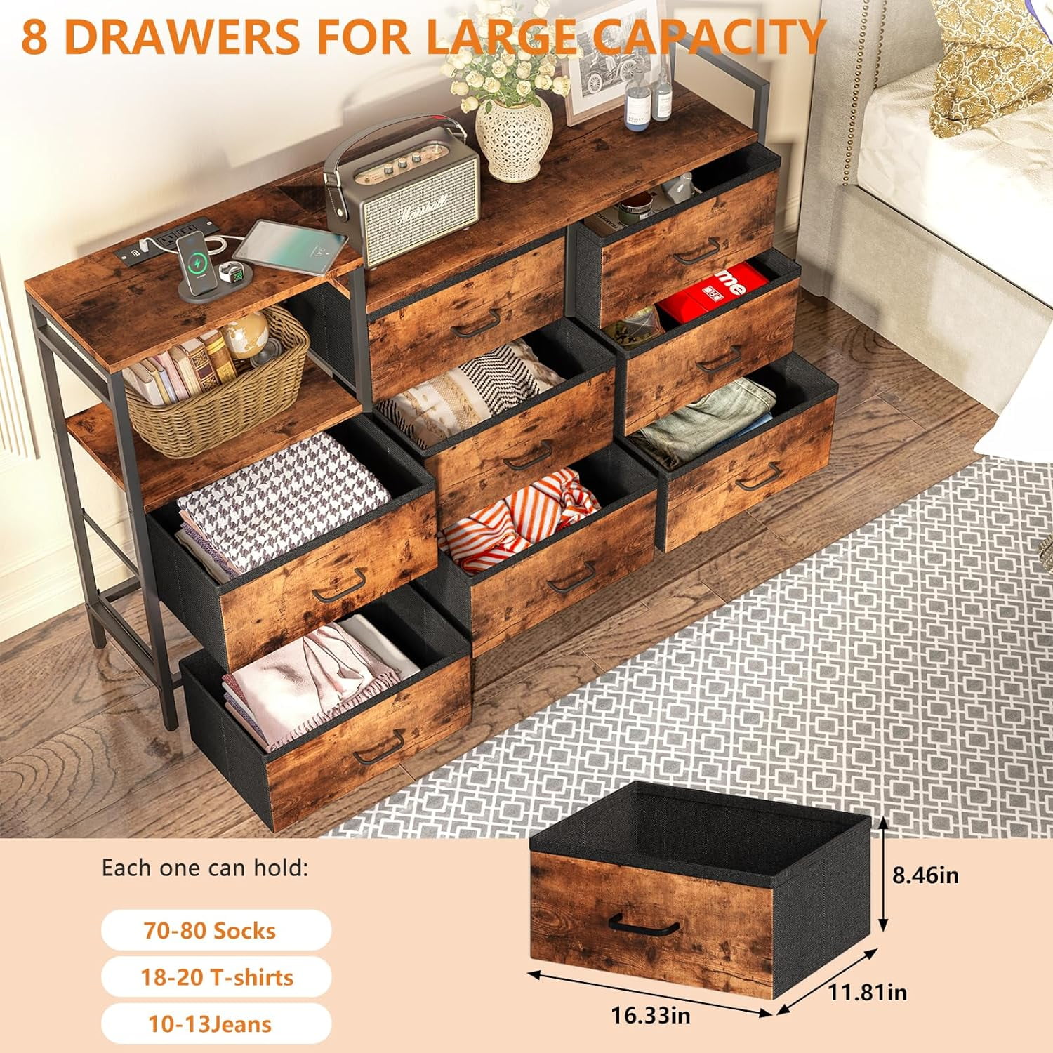 Aboxoo 8 Drawer Dresser for Bedroom with Charging Station, Rustic Brown Multi-functional 8 drawers provide ample storage space for organizing clothes and daily necessities Built-in charging station with 2 standard outlets and 2 USB ports for convenient device charging Constructed with a sturdy metal frame and MDF shelves for enhanced durability and stability Retro industrial style with classic wood grain and fabric drawers, suitable for various home decors Easy to install with included instructions and tools; measures 52″ L x 118″ W x 346″ H