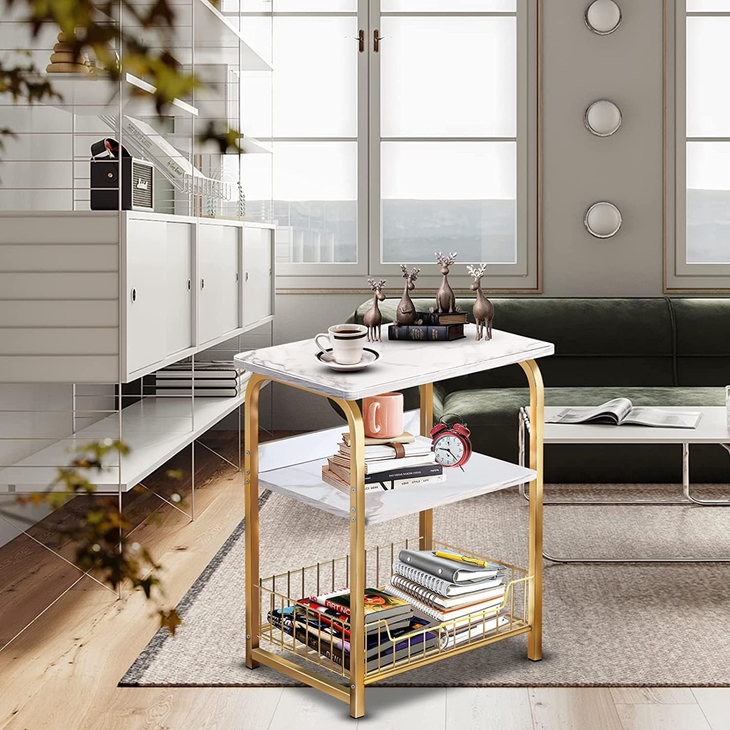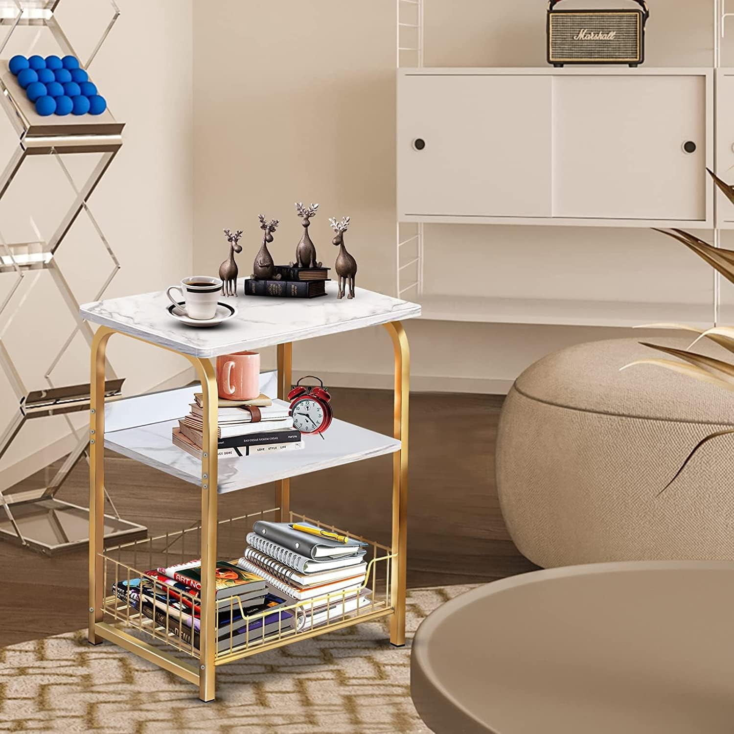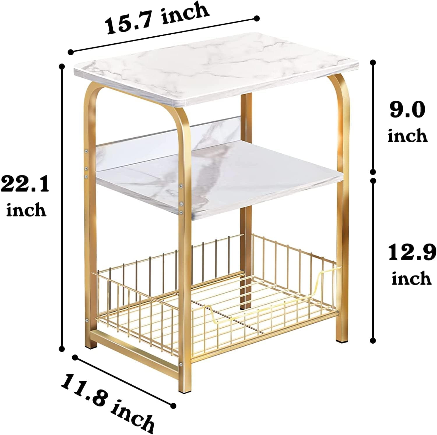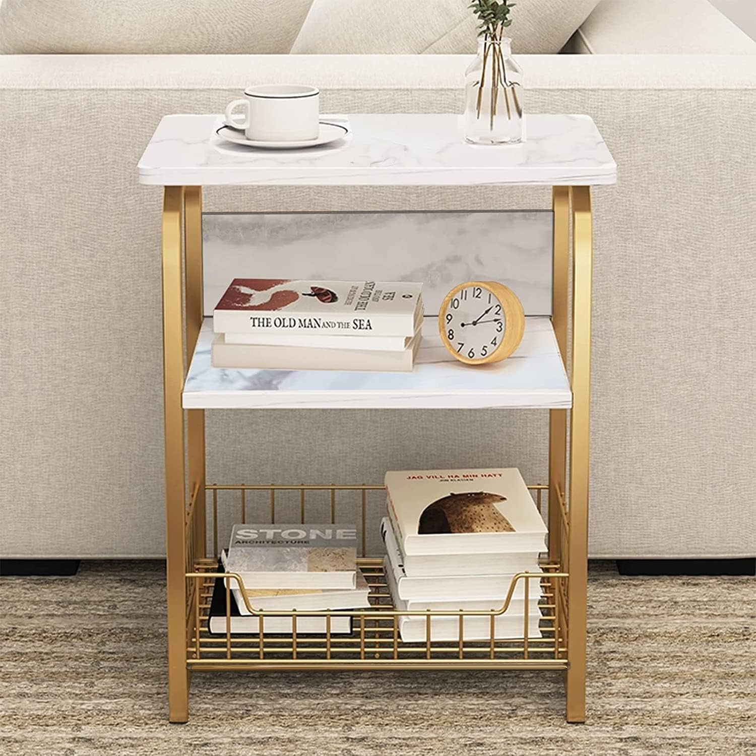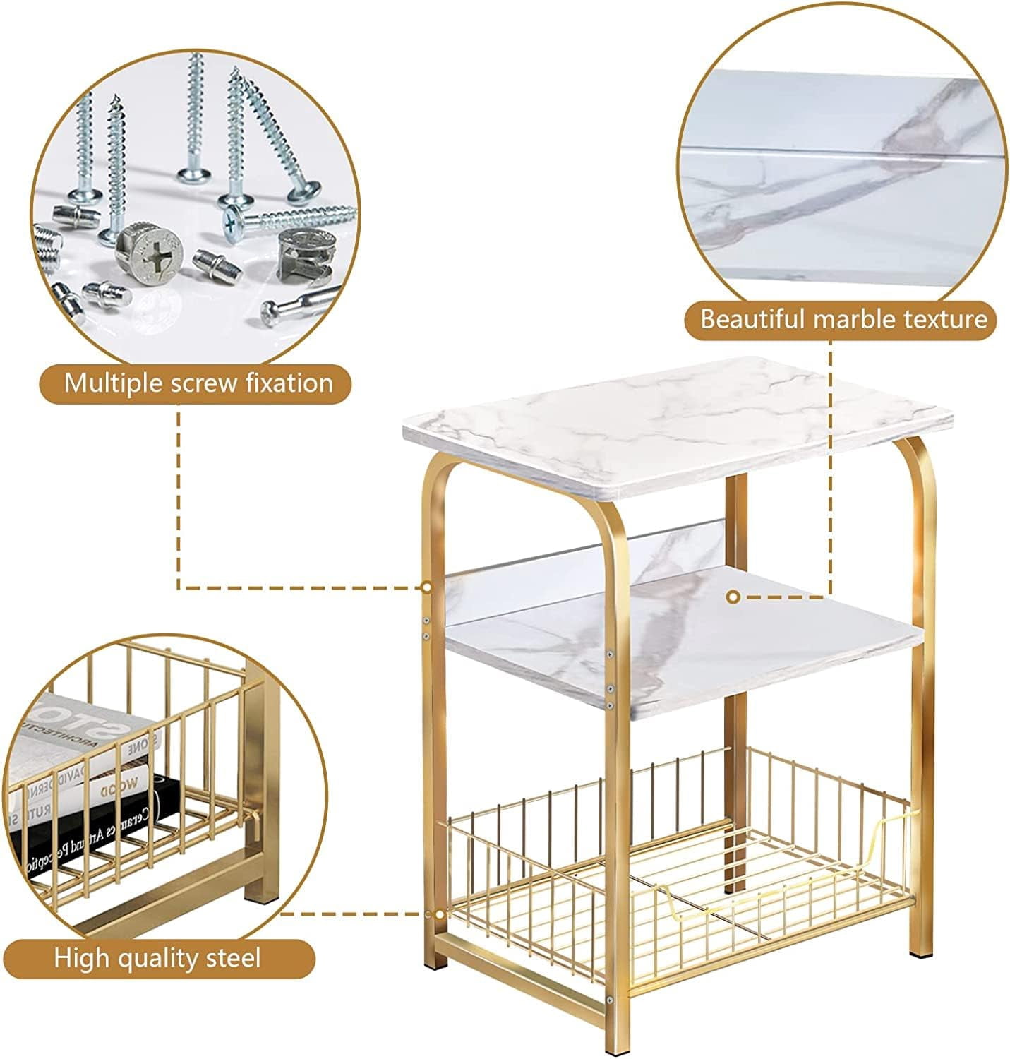 aboxoo End Table 2PC Side Table 3 Tiers White Marble Nightstand Industrial Retro Storage Shelf for Living Room Bedroom Kitchen Family and Office,Stable Wood and Metal Frame