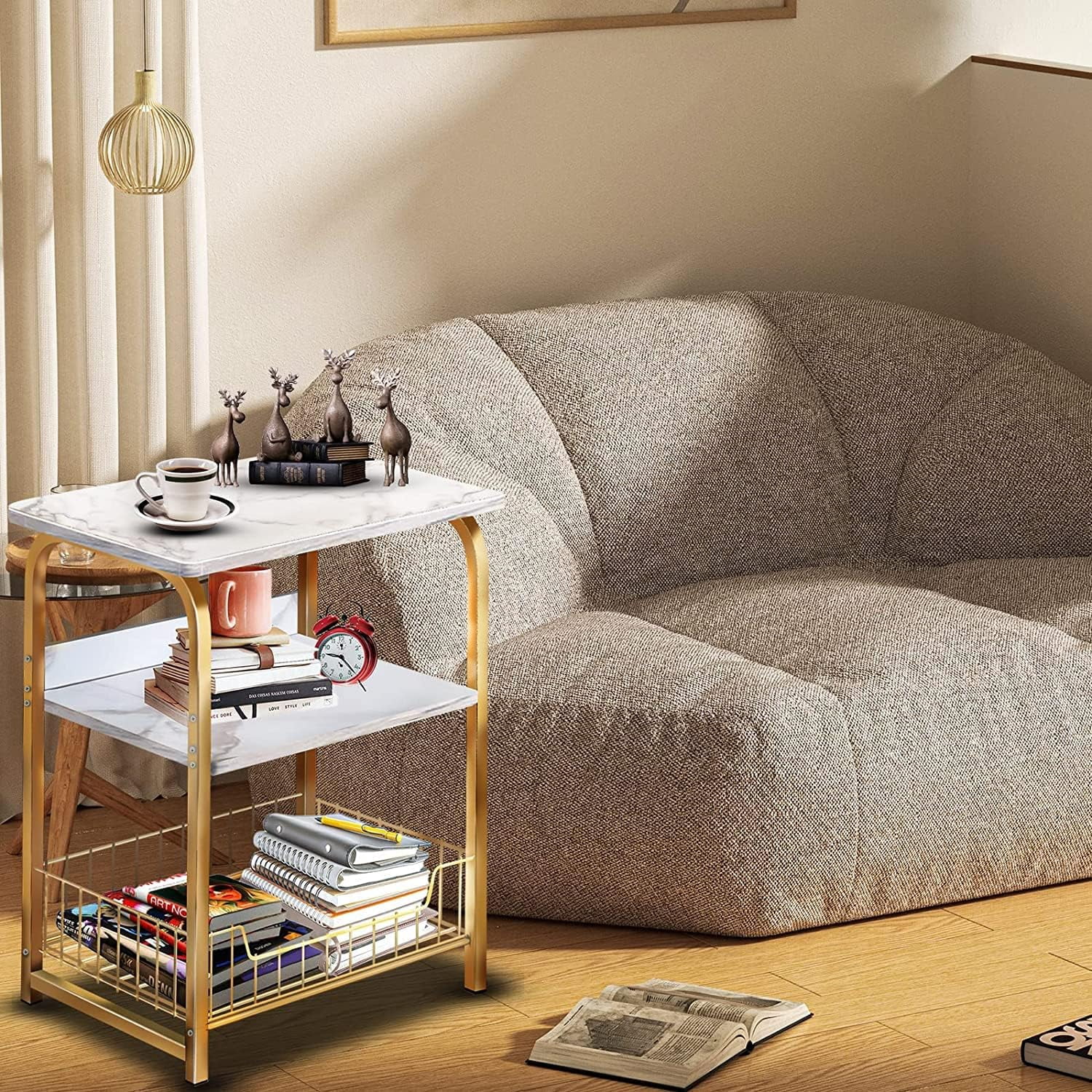 ✔3 TIERS WITH STORAGE SHELF: The Size is 15.7 x 11.8 x 22.1 inches. 3-Tier end table for additional storage meet all of your different needs. And the bottom wide U-shape steel wire basket for easy access and storage snacks,cans or other stuff. ✔MULTI-FUNCTIONAL: The end table could be used as side table, nightstand, bedside table and narrow sofa table, etc. 2 tier open shelves provide extra space for storing books, plants, decorations and so on. ✔STYLISH VINTAGE: Simple but stylish and fashionable, bringing charm to your living room and giving your visitors a good impression of your home. ✔SIMPLE ASSEMBLY & EASY MAINTENANCE: It’s easy to assemble with the installation instructions and accessories in the package, you can make it quickly. ✔Strong & Durable: Made in denser and uniform particle board with a retro and elegant appearance. The surface is scratch-resistant and waterproof, which is very strong and durable.