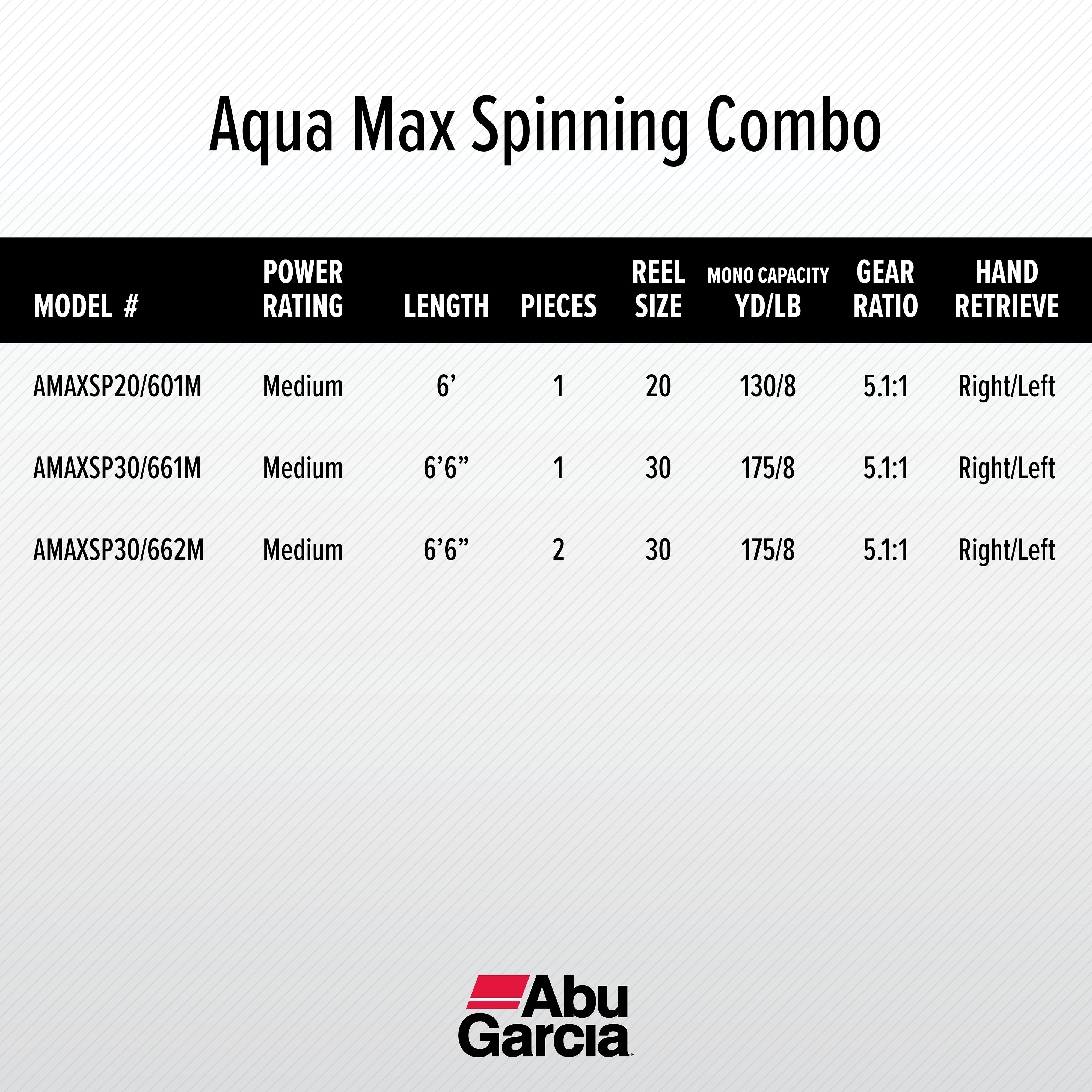 ABU GARCIA AQUA MAX 6’6” FISHING ROD AND REEL SPINNING COMBO: Rocket Line Management system extends casting distance while the Rocket Spool Lip Design increases accuracy. Slow oscillation provides an even lay line for all types of line. SUPERIOR CONSTRUCTION: Lightweight and durable, graphite body and rotor with a machined aluminum spool. 2 piece, 24-ton graphite rod for a lightweight design and increased sensitivity. Extra Durable Everlast bail system. RECOVERY RATE: Recover 29” | 74cm of line for every turn of the crank. Gear ratio of 5.1:1. OIL FELT FRONT DRAG DRAG: Max: 14lb | 6.3kg. Mono Capacity yd/lb: 225/6 175/8 140/10. Braid Capacity 180/10. 4 TOTAL BEARINGS: 3 ball bearings plus 1 instant anti-reverse bearing provides smooth operation for any fishing experience. 6-12LB LINE RATING, MEDIUM POWER, MODERATE FAST ACTION: The Aqua Max Spinning Combo is up for the next challenge. Lure rating of 1/4-5/8. 8 DURABLE GUIDES: Stainless steel guides are built to withstand tough fights and rough treatment without fraying the line. WINN ADVANCED POLYMER DRI-TRAC GRIPS paired with a Split handle for Split handed anglers.