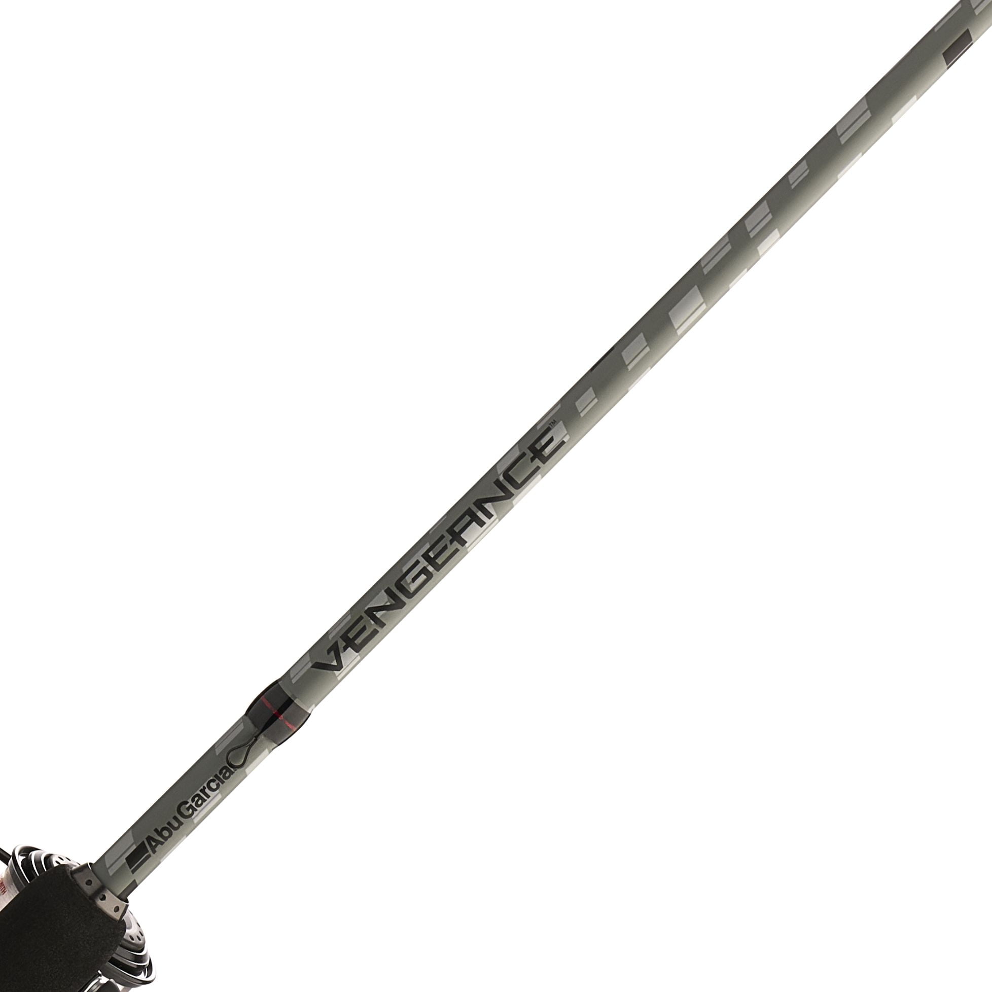 ABU GARCIA 7’ VENGEANCE SPINNING COMBO: This rod and reel fishing kit comes pre-spooled with 10lb Berkley clear line, plus a bait pack that includes a bait claim with three Berkley PowerBait 3.3”Power Swimmers and three Fusion19 1/4 oz. 2/0 Swimbait Jigheads. SUPERIOR CONSTRUCTION: A one-piece, 24 Ton graphite rod for a balanced and lightweight design. Features Everlast bail system for improved durability. RECOVERY RATE: Recover 29″ | 74cm of line for every turn of the crank. Gear ratio of 5.1:1. Rocket line management system provides better control of all types of fishing lines. OIL FELT FRONT DRAG provides smooth drag performance. Max drag of 14lb | 6.4kg. Mono Capacity yd/lb: 225/6 175/8 140/10. Braid Capacity yd/lb: 180/10. 4 TOTAL BEARINGS: 3 stainless steel ball bearings plus 1 instant anti-reverse bearing to provide smooth operation for every fishing experience. 12-20LB LINE RATING, MEDIUM POWER, MODERATE FAST ACTION: The Vengeance is up for the next challenge. Lure rating of 1/4-5/8. 8 DURABLE GUIDES: Stainless steel guides with titanium oxide inserts are built to withstand tough fights and rough treatment without fraying the line. ABU GARCIA HANDLE KNOBS: Co-Molded Abu Garcia Handle knobs provide excellent grip with extreme comfort for all fishing conditions.
