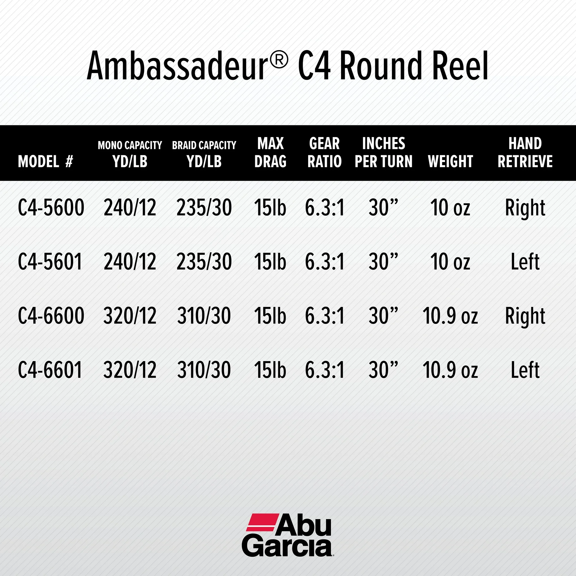 LIGHTWEIGHT CONSTRUCTION: The spool of the Abu Garcia Ambassadeur C4 Casting Reel is made from machined aluminum, which provides strength without adding excess weight. This Swedish made Casting reel is both durable and lightweight at 10 oz. RECOVERY RATE: Recover 30” | 76cm of line for every turn of the crank. Gear ratio of 6.3:1. Made with the Duragear 2 gear system to increase gear strength. SYNCHRONIZED LEVEL WIND SYSTEM: Provides even line lay and a smooth retrieve. DRAG SPECS:Carbon Fiber Star Drag, Max: 15lb | 6.8kg. The Carbon Matrix drag system provides smooth, consistent drag pressure across the entire drag range. LINE CAPACITY: Mono Capacity yd/lb: 240/12. Braid Capacity 235/30. RIGHT HANDLE POSITION: The ergonomically designed compact bent handle and star give you all-day comfort. PIN CENTRIFUGAL BRAKE: Gives you consistent brake pressure throughout your cast. 5 TOTAL BEARINGS: 4 stainless steel ball bearings plus 1 instant anti-reverse bearing provides smooth operation for any fishing experience.