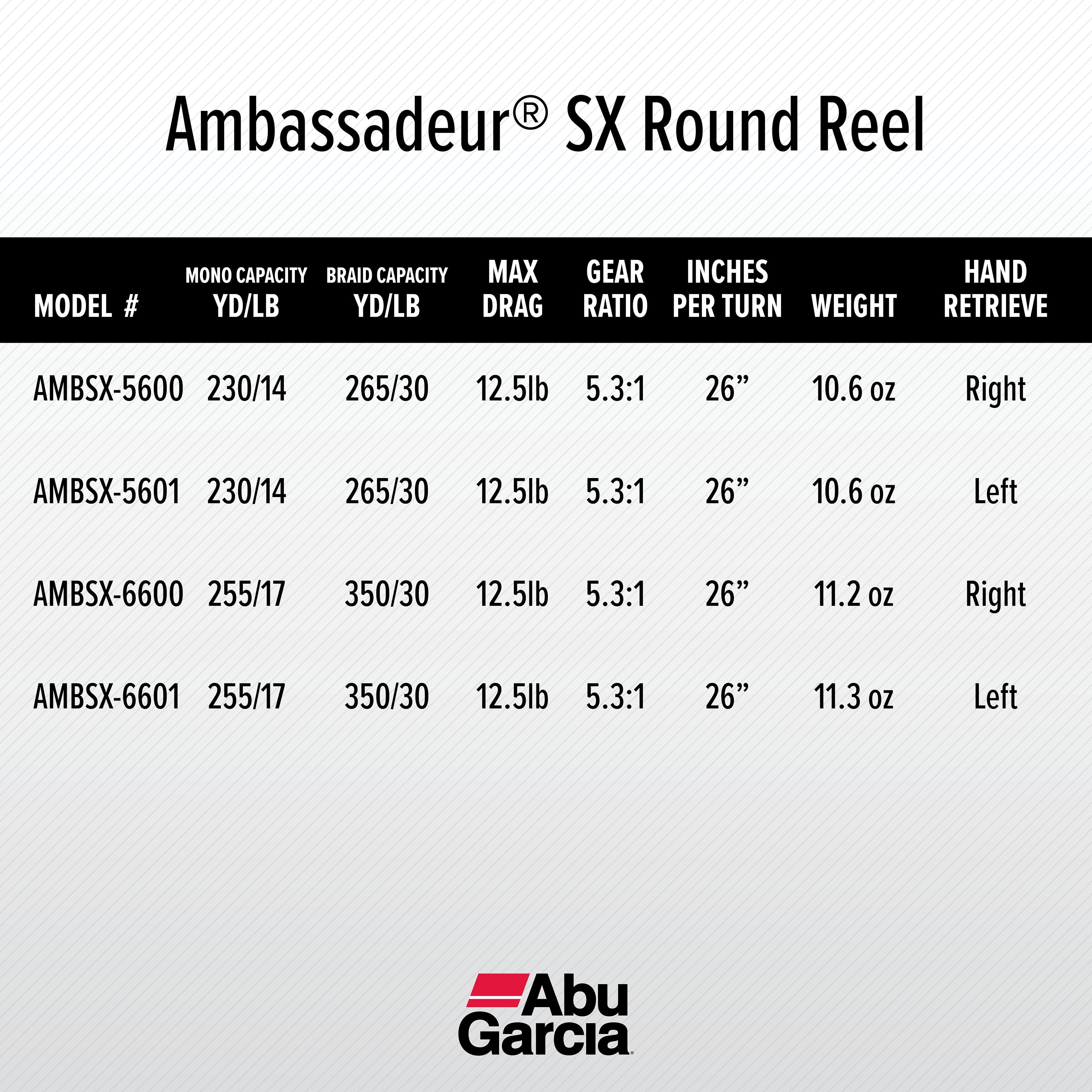 LIGHTWEIGHT CONSTRUCTION: The spool of the Abu Garcia Ambassadeur SX Casting Reel is made from machined aluminum, which provides strength without adding excess weight. This Casting reel is both durable and lightweight at 11.2 oz. RECOVERY RATE: Recover 26” | 66cm of line for every turn of the crank. Gear ratio of 5.3:1. SYNCHRONIZED LEVEL WIND SYSTEM: The Ambassadeur SX Conventional Reel provides even line lay and a smooth retrieve. DRAG SPECS: Synthetic Star Drag, Max: 12.5lb. The Multi Disc Drag System makes it easier for you to adjust during a fight. LINE CAPACITY: Mono Capacity yd/lb: 255/17. Braid Capacity 350/30. RIGHT HANDLE POSITION: The ergonomically designed compact bent handle and star give right handed anglers all-day comfort. 6 PIN CENTRIFUGAL BRAKE: Gives you consistent brake pressure throughout your cast. 4 TOTAL BEARINGS: 3 stainless steel ball bearings plus 1 instant anti-reverse bearing provides smooth operation for any fishing experience.
