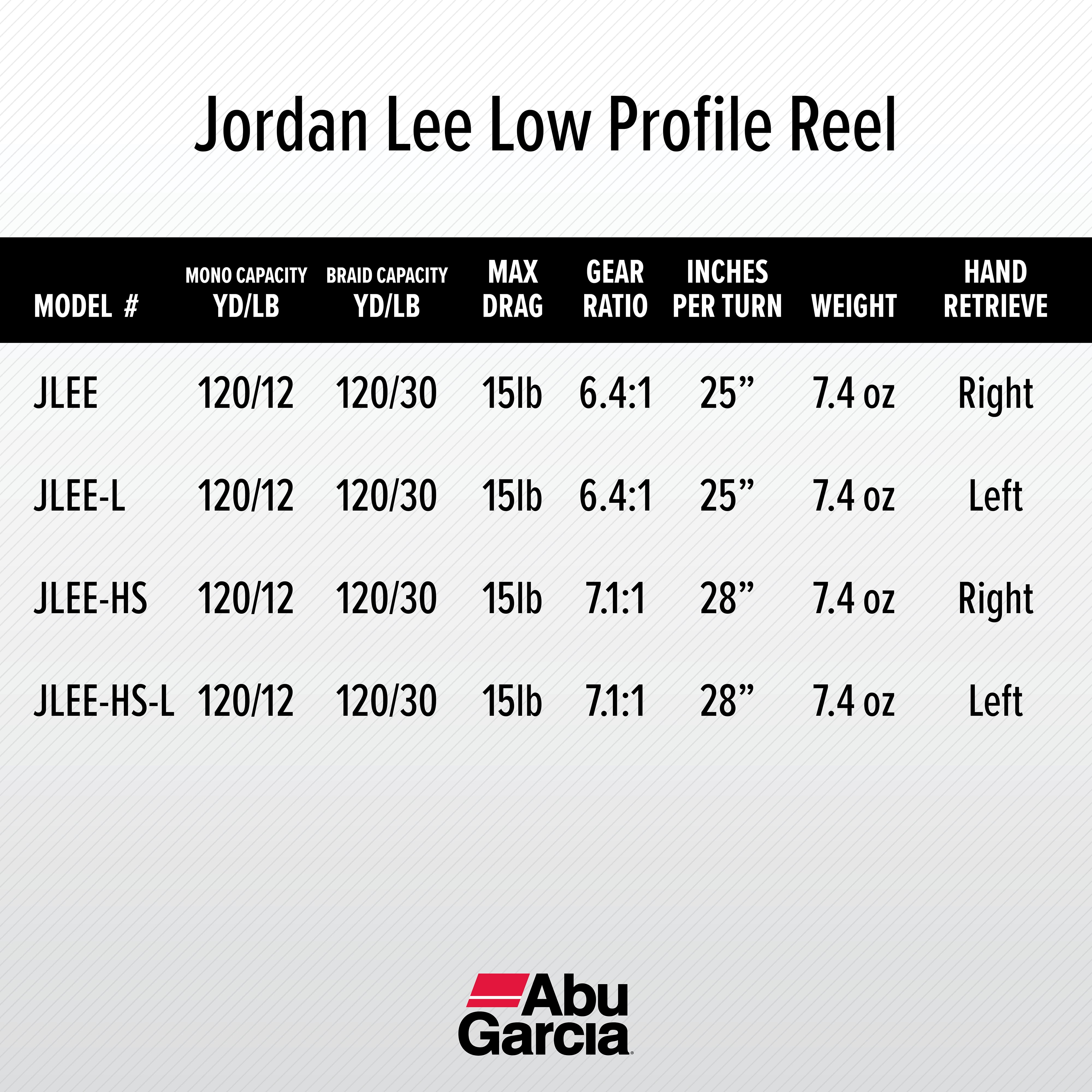 LIGHTWEIGHT CONSTRUCTION: The frame and sideplates of the Abu Garcia Jordan Lee Baitcast Reel are made from graphite and the spool is machined double anodized aluminum, keeping this Baitcast reel strong and lightweight at 7.4 oz. Design approved by Jordan Lee. RECOVERY RATE: Recover 28” | 71cm of line for every turn of the crank. Gear ratio of 7.1:1. Made with the Duragear brass gear to extend your reel’s life. BRAKE SYSTEM: The MagTrax brake system gives you consistent brake pressure throughout your cast. DRAG SPECS: Synthetic Star Drag, Max: 15lb | 6.8kg. The Power Disk drag system gives you smooth drag performance. LINE CAPACITY: Mono Capacity yd/lb: 150/10 120/12 85/17. Braid Capacity 155/20 120/30 80/50. LEFT HANDLE POSITION. The 90 mm carbon handle, large co-molded soft touch knobs, and recessed reel foot are ergonomically designed for all-day comfort. 11 TOTAL BEARINGS: 10 stainless steel ball bearings plus 1 instant anti-reverse bearing provides smooth operation for any fishing experience. Recessed reel foot One piece graphite frame