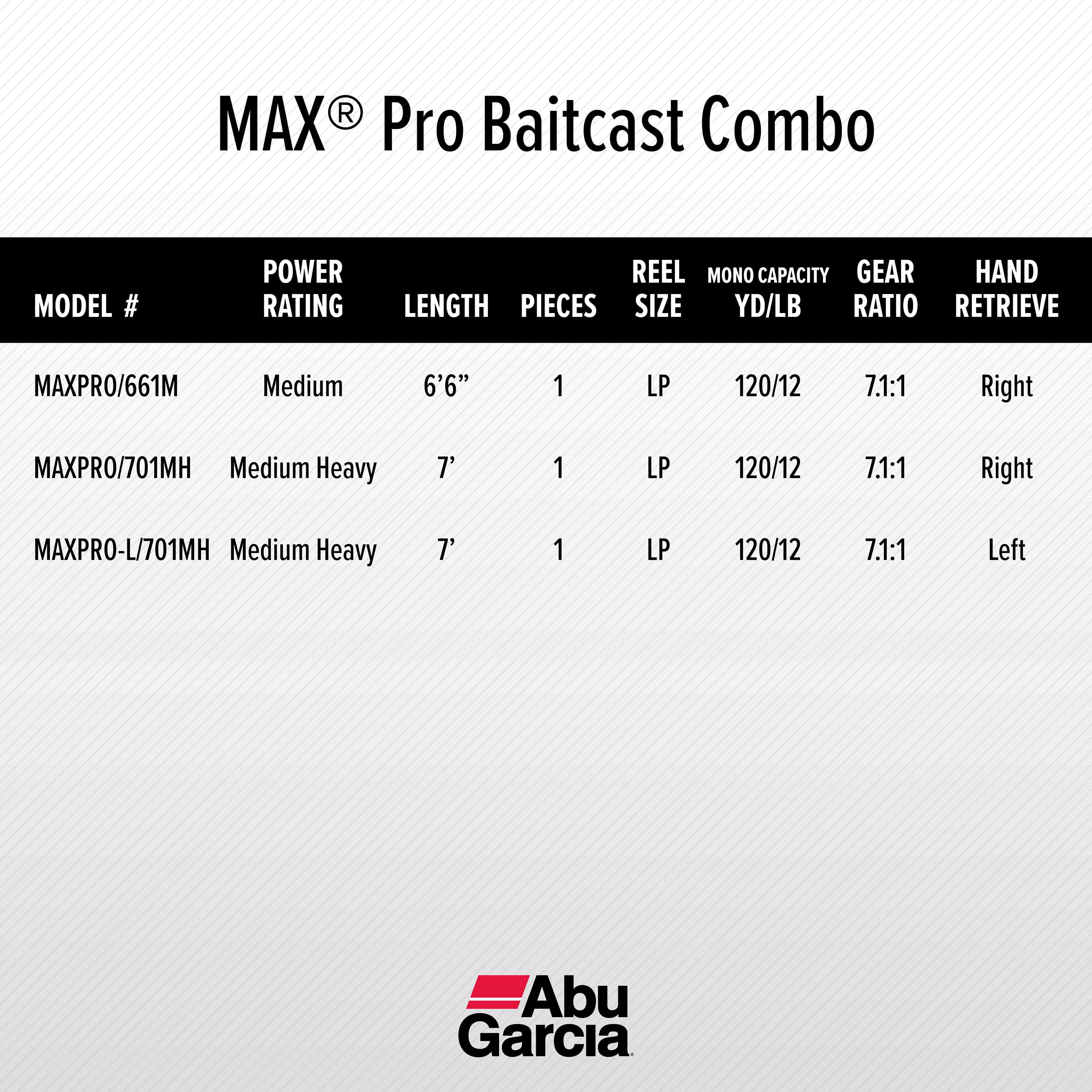 ABU GARCIA MAX PRO 7’ FISHING ROD AND REEL BAITCAST COMBO: Experience better-than-ever Abu Garcia engineering for MAXimum performance. SUPERIOR CONSTRUCTION: Lightweight and durable, graphite frame and sideplates with a machined aluminum spool. 1 piece, 24-ton graphite rod for a lightweight design and increased sensitivity. The MagTrax brake system gives you consistent brake pressure throughout your cast. RECOVERY RATE: Recover 28” | 71cm of line for every turn of the crank. Gear ratio of 7.1:1 SYNTHETIC STAR DRAG DRAG: Max: 15lb | 6.8kg. Mono Capacity yd/lb: 150/10 120/12 85/17. Braid Capacity 155/20 120/30 80/50. The Power Disk drag system gives you smooth drag performance 8 TOTAL BEARINGS: 7 stainless steel ball bearings plus 1 instant anti-reverse bearing provides smooth operation for any fishing experience. 10-20LB LINE RATING, MEDIUM HEAVY POWER: The Max Pro Baitcast Combo is up for the next challenge. Lure rating of 3/8-3/4. 8 DURABLE GUIDES: Stainless steel guides are built to withstand tough fights and rough treatment without fraying the line. ABU CUSTOM INTEGRATED REEL SEAT with molded polymer comfort grip paired with a Split handle made for Right handed anglers.