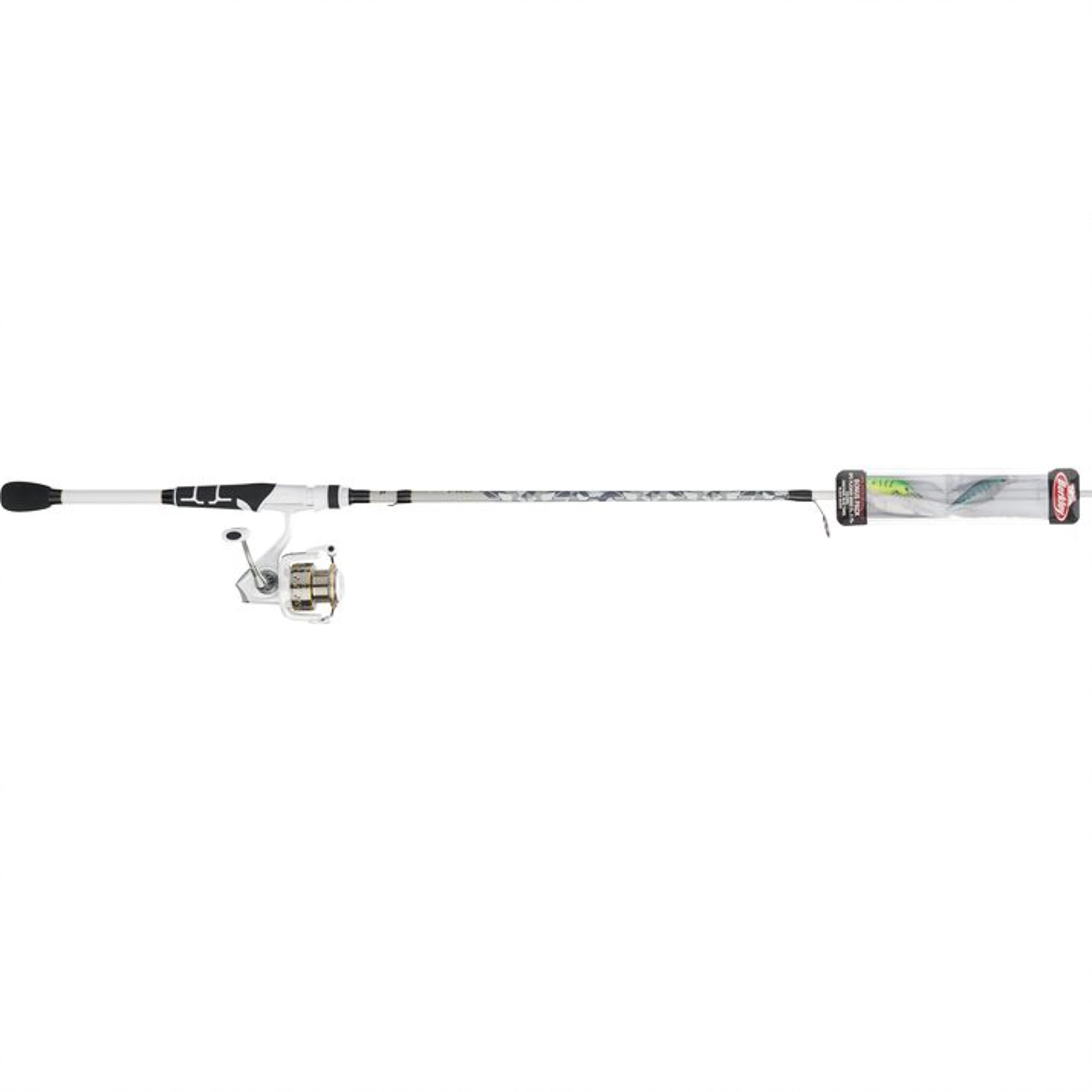 Abu Garcia Max Pro spinning rod and reel combo Features a custom designed reel seat Integrated polymer comfort grip for ultimate comfort 6+1 bearing system 24-Ton graphite construction 3ct Berkley Flicker Shad bait clam is attached to combo rod Bait Colors: Firetiger, Black Silver, Blue Tiger Adult and teen age approrpriate