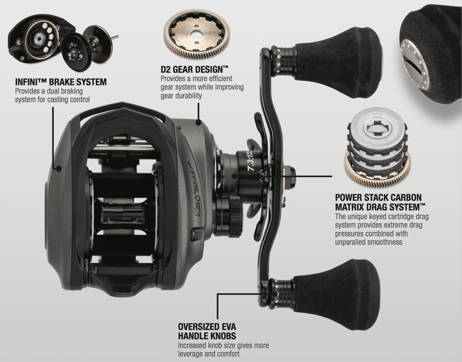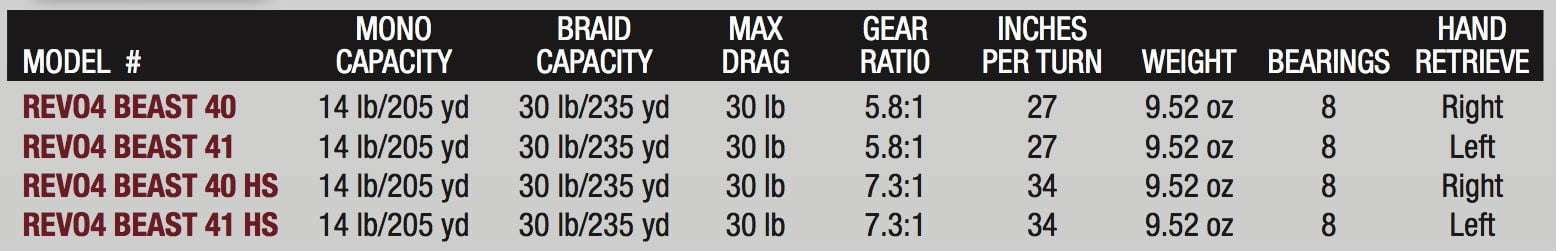 ABU GARCIA REVO BEAST FISHING REEL: Featuring an X2-Craftic alloy frame and sideplates for a lightweight and durable design, Revo Beast fishing reels are built to handle the toughest species in the water. RECOVERY RATE: Recover 27″ | 69cm of line for every turn of the crank. Gear ratio of 5.8:1. High-strength Duragear brass gear offers strength and capability during intense action. Right handle position. 8 STAINLESS STEEL BEARINGS, with 7 HPCR bearings and 1 roller bearing. Instant anti-reverse provides smooth operation for any fishing experience, protecting against losing tension once your hook is set. POWER STACK CARBON MATRIX DRAG SYSTEM: A premium drag, featuring a max drag of 30lb | 13.6kg. Magnetic/centrifugal Infini brake system allows almost limitless adjustability to handle any fishing situation. LINE CAPACITY: Mono Capacity yd/lb: 240/12 205/14 170/17. Braid Capacity yd/lb: 310/20 235/30 165/50. Infini II spool design allows for extended castability and the ability to handle extreme loads. DURACLUTCH DESIGN provides improved engagement and durability while an extended bent handle with power knobs gives you all the cranking power you need to fight the hardest-pulling fish. TITANIUM COATED LINE GUIDE reduces friction and extends the life of your line. DECADES OF EXPERIENCE. OBSESSION FOR DETAIL. We build equipment for anglers who pursue the sport with an unrelenting passion.