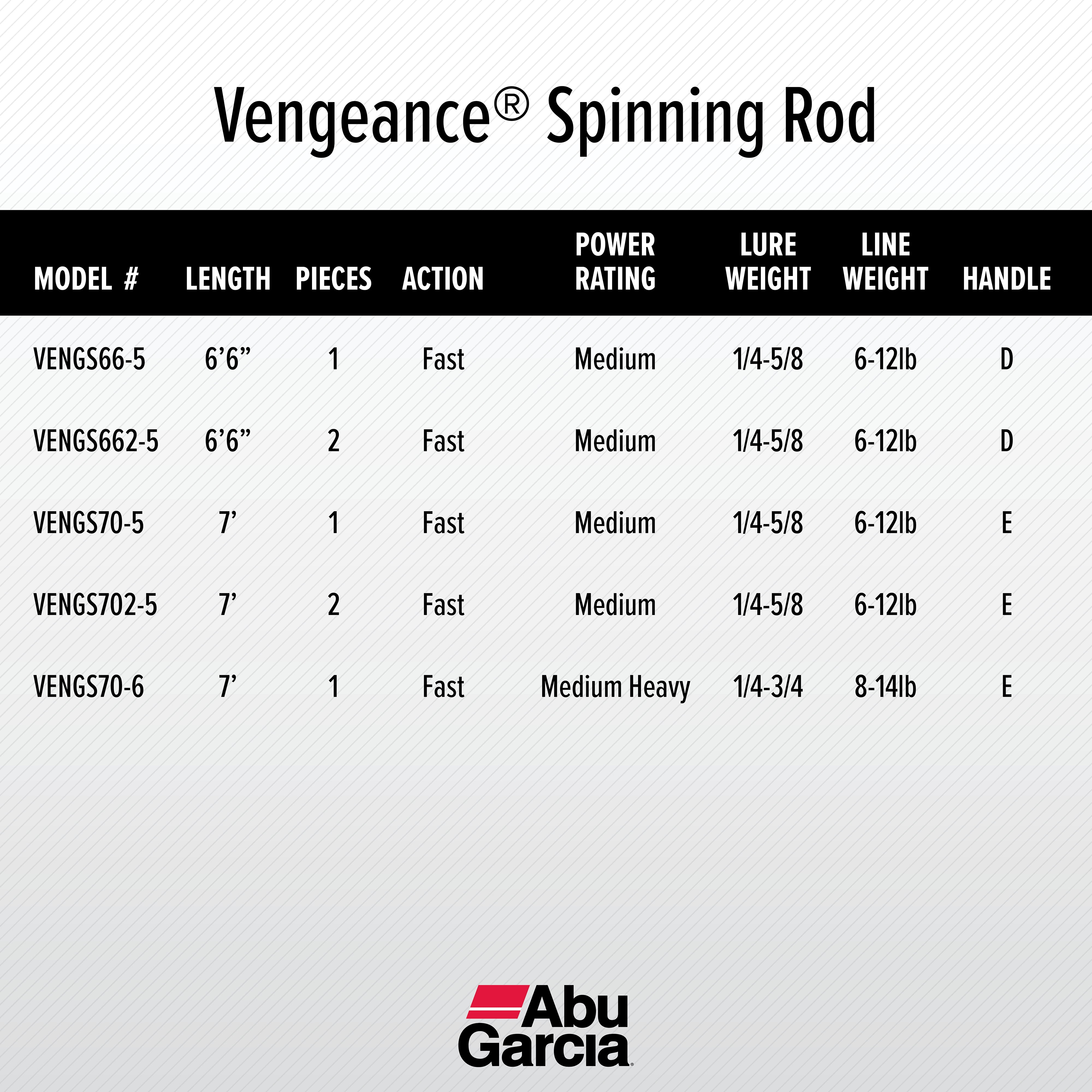 ABU GARCIA VENGEANCE6’6” SPINNING ROD: A balanced and lightweight rod designed for on-the-water technique and durability. 6-12LB LINE RATING, MEDIUM POWER, FAST ACTION: The VengeanceSpinning Fishing Rod is up for the next challenge. Lure rating of 1/4-5/8 oz. 24-TON GRAPHITE CONSTRUCTION for a lightweight balanced design. 8 STAINLESS STEEL GUIDES: built with titanium oxide inserts to allow for a lightweight balanced rod. DURABLE REEL SEAT will stand up to extreme exposure. Designed for increased blank contact and sensitivity. HIGH DENSITY EVA SPLIT GRIP HANDLE (D type) provides greater sensitivity and durability while remaining comfortable over the long haul. 1 PIECE FISHING ROD: Packing includes technique and pro-tip recommendations. HOOK KEEPER: The Texas-rigged hook keeper will work with all bait applications.