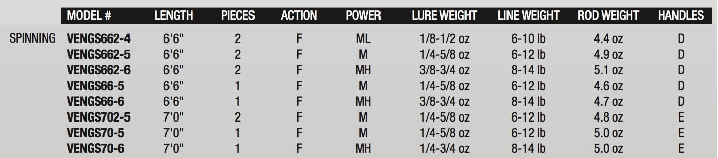ABU GARCIA VENGEANCE7’ SPINNING ROD: A balanced and lightweight rod designed for on-the-water technique and durability. 6-12LB LINE RATING, MEDIUM POWER, FAST ACTION: The VengeanceSpinning Fishing Rod is up for the next challenge. Lure rating of 1/4-5/8 oz. 24-TON GRAPHITE CONSTRUCTION for a lightweight balanced design. 8 STAINLESS STEEL GUIDES: built with titanium oxide inserts to allow for a lightweight balanced rod. DURABLE REEL SEAT will stand up to extreme exposure. Designed for increased blank contact and sensitivity. HIGH DENSITY EVA SPLIT GRIP HANDLE (E type) provides greater sensitivity and durability while remaining comfortable over the long haul. 1 PIECE FISHING ROD: Packing includes technique and pro-tip recommendations. HOOK KEEPER: The Texas-rigged hook keeper will work with all bait applications.