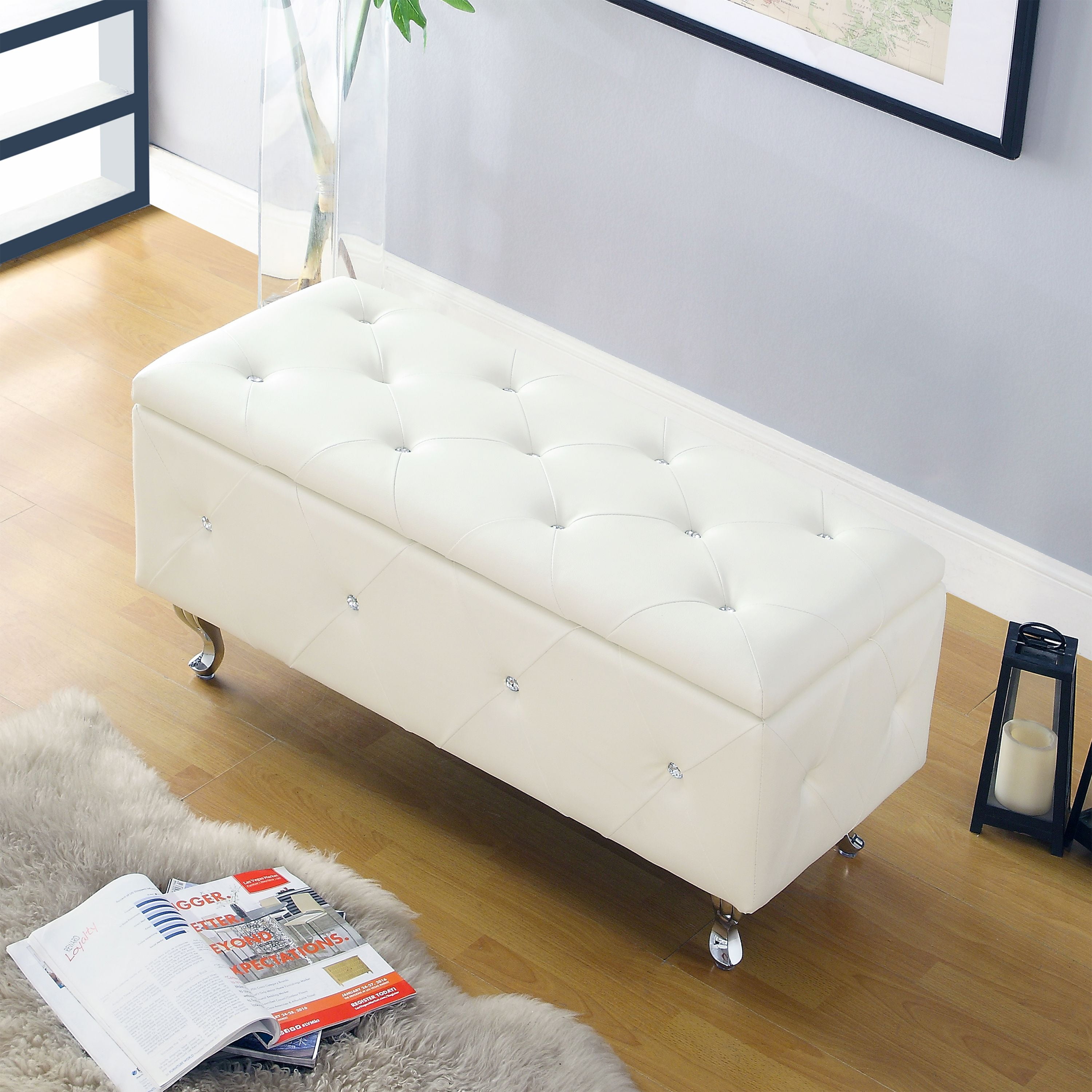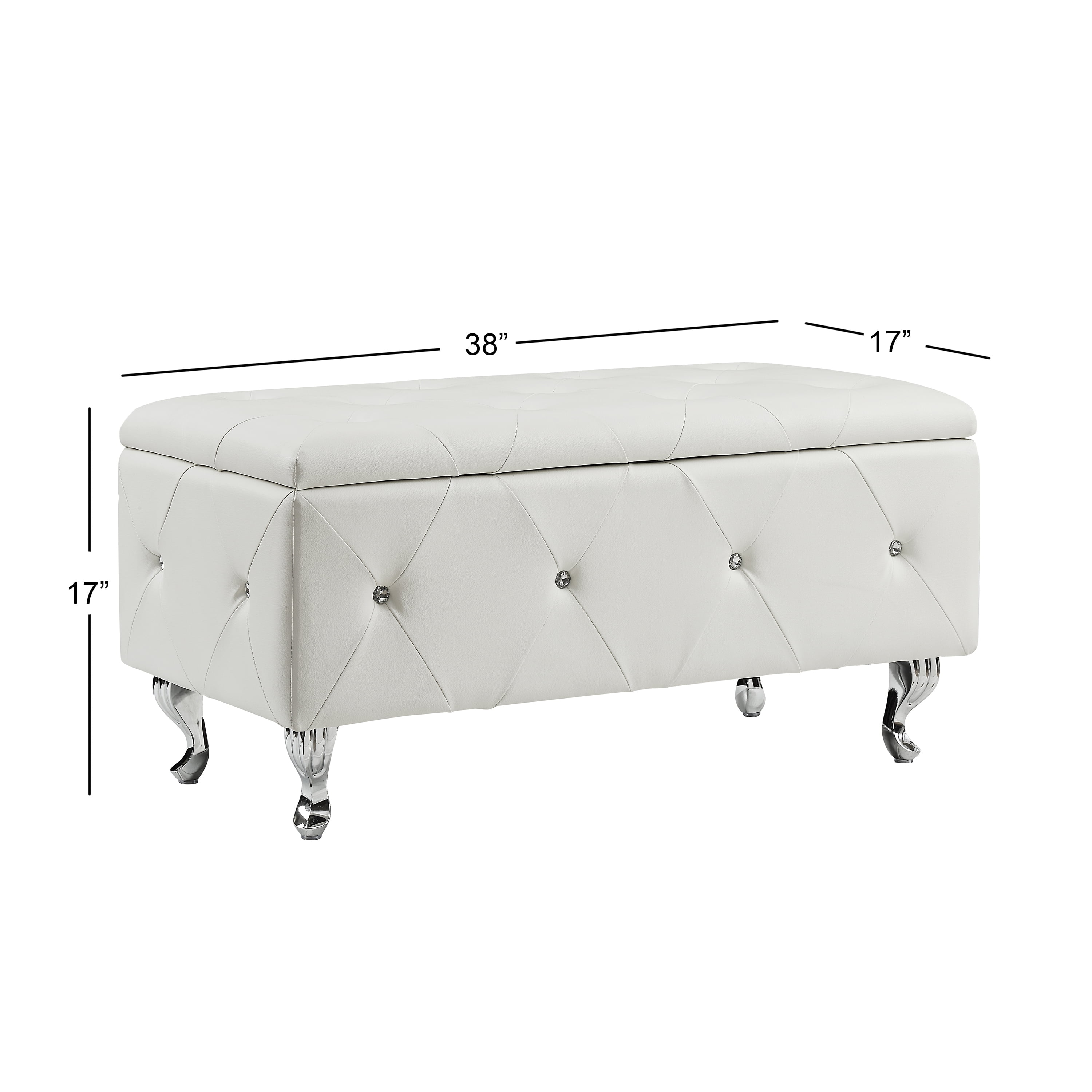 AC Pacific White Crystal Tufted Storage Bench: Measures 16.9″H x 15.75″W x 15.75″D and is the ideal addition to your living space Spacious interior can hold a multitude of items such as magazines, toys, crafts, throw blankets and so much more This suede-like storage ottoman features a plush, tufted lid, which makes a comfortable seat Designed to be durable and can hold up to 220 lbs Faux leather Tufted ottoman bench is ideal for the home, office, dorm or any place that requires additional seating