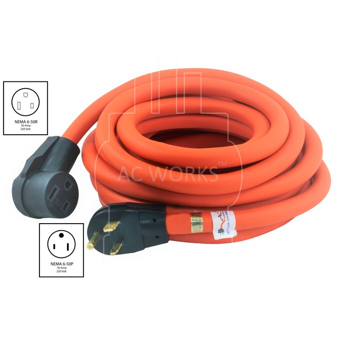 Introducing the AC WORKS® brand 10ft outdoor-rated extension cord, engineered for heavy-duty applications like EV charging and welding. This robust cord features a NEMA 6-50 male plug and a NEMA 6-50 female connector, providing reliable power transfer in outdoor environments. Built to withstand extreme temperatures, the cable boasts an STW, 8/3, 600 Volt anti-cold weather jacket, ensuring flexibility and durability even in harsh conditions. With its 40 Amp, 8 AWG copper wire construction, this cord delivers high-performance power transmission for demanding tasks. Backed by a 5-year limited warranty, you can trust the AC WORKS® extension cord to provide long-lasting durability and exceptional performance for all your outdoor power needs.