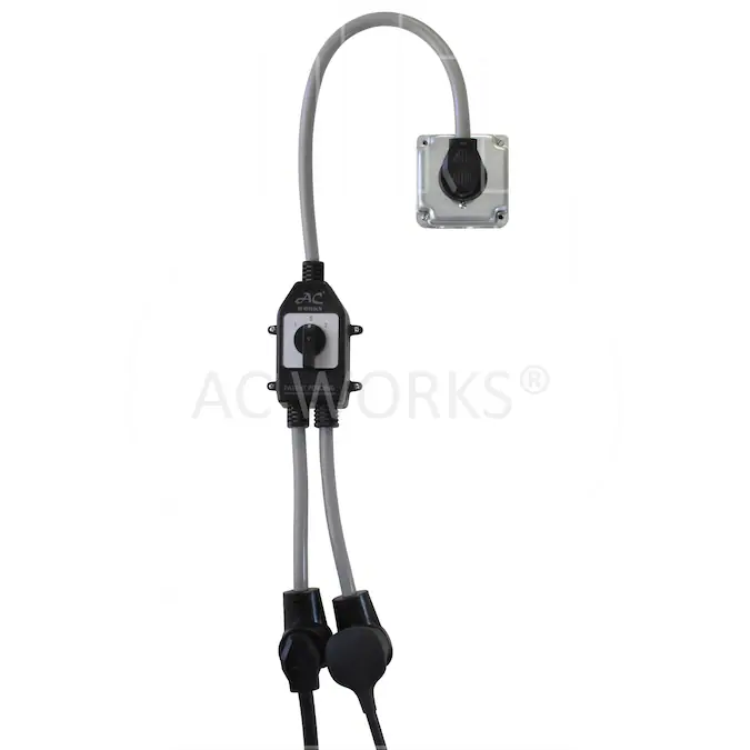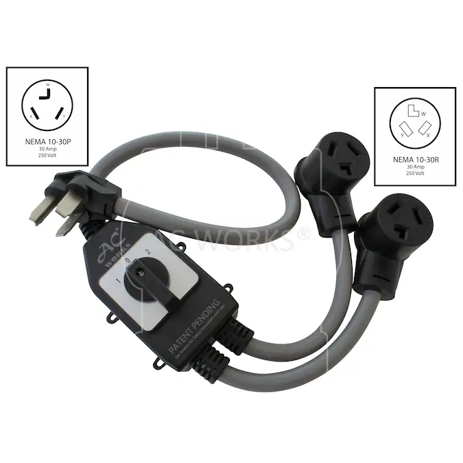 This AC WORKS® brand safety switch Y-cable is very durable with a length of 3 feet. It is a NEMA 10-30P to two NEMA 10-30R. This adapter is used to connect two different appliances, like a dryer and your EV charging cable, at once without having to plug and unplug cords all the time. By using this switch, you can plug two appliances in at once and power one appliance at a time, without tripping the breaker. A common use for this product is switching between powering your dryer and EV charger. Keep both items plugged in, one to each of the connectors, and then use the switch to power each one at different times. You can even label the switches for more convenience. This product includes a 5-year limited warranty.