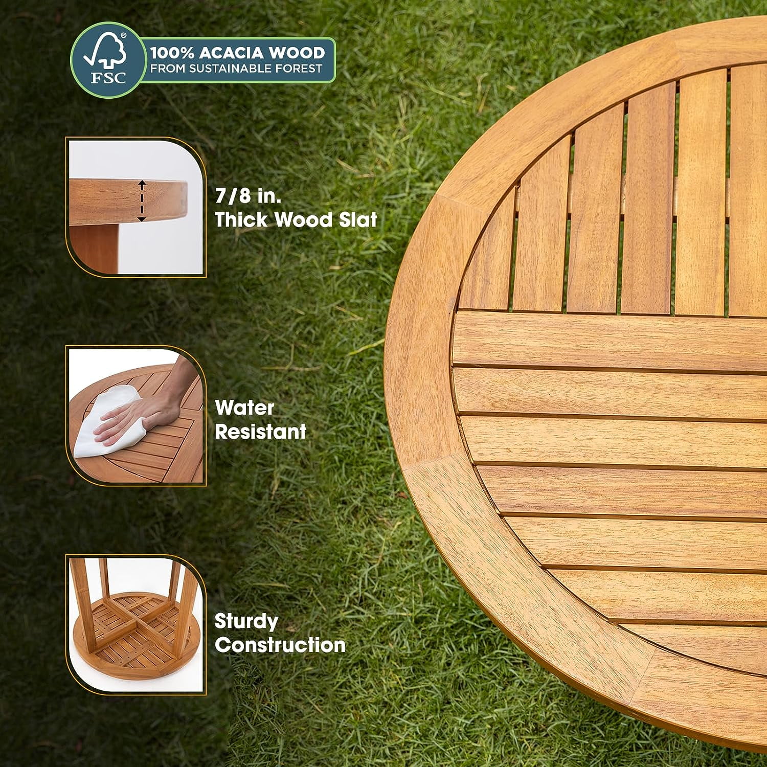Durable construction: Made from FSC-certified acacia wood with a teak wood top for long-lasting use. Weather-resistant finish: High-grade oil-based coating protects against UV rays and weather conditions. Elegant design: Inspired by rustic French charm, perfect for enhancing gardens, patios, and balconies. Heavy-duty capacity: Supports up to 270 pounds with stable and reliable performance. Quick assembly: Easy 5-minute setup with included tools and instructions. Dimensions: 30″ H x 27.75″ D x 27.75″ W, weighing 15.4 lbs. Warranty included: 1-year warranty, 30-day return policy, and 24/7 customer support.