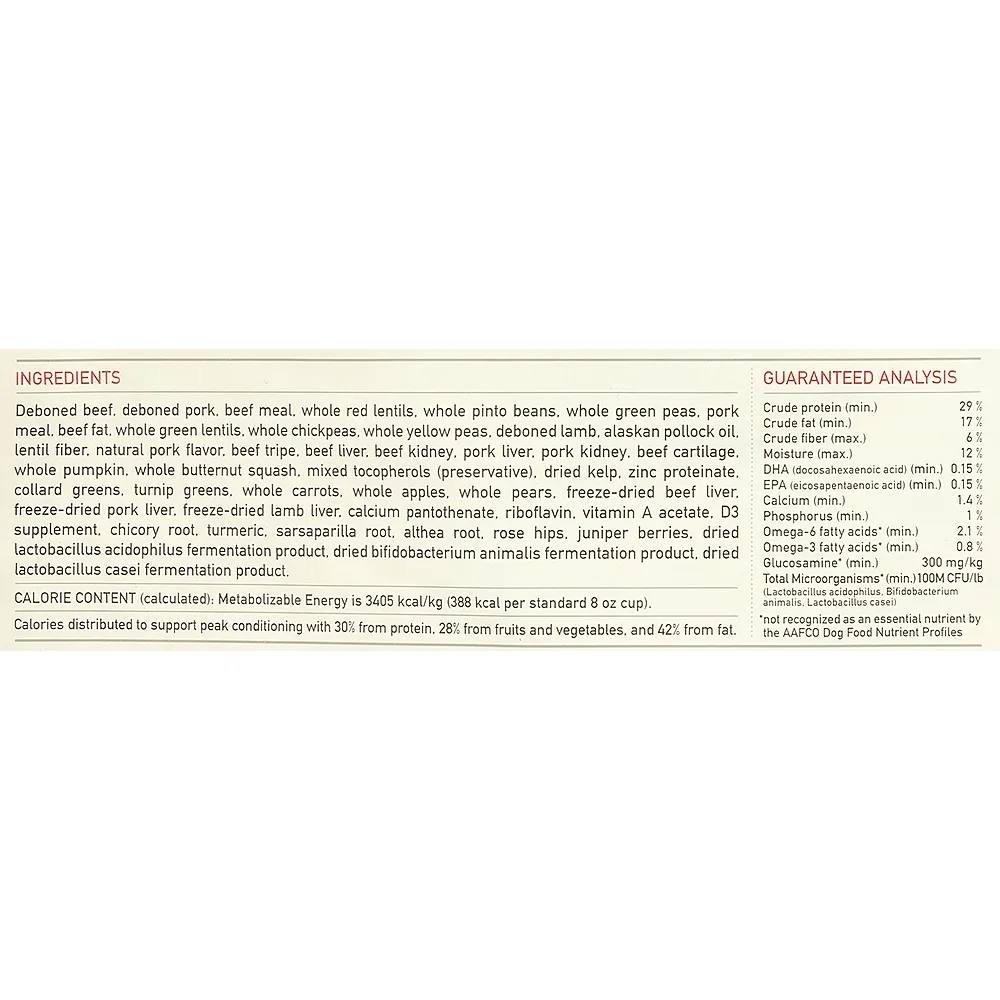 ACANA Heritage Red Meat Formula Dry Dog Food, 25 Lb A division of award-winning Champion Petfoods, ACANA produces dog food that mimics canines? natural diet in the wild. Its ?biologically appropriate” formula has a wide variety of fresh meats and limited carbohydrates. ACANA?s animal protein-rich recipes include meat, organs and cartilage but exclude high-glycemic carbohydrates (like rice and corn) and vegetable proteins. Made from fresh locally grown ingredients, ACANA dog food is free of preservatives and synthetics. ACANA Heritage Red Meat Formula Dry Dog Food contains deboned beef, deboned pork, beef meal, whole red lentils, whole pinto beans, whole green peas, pork meal, beef fat, whole green lentils, whole chickpeas, whole yellow peas, deboned lamb, pollock oil, lentil fiber, natural pork flavor, beef tripe, beef liver, beef kidney, pork liver, pork kidney, beef cartilage, and many other regional botanicals. This kibble is grain free.
