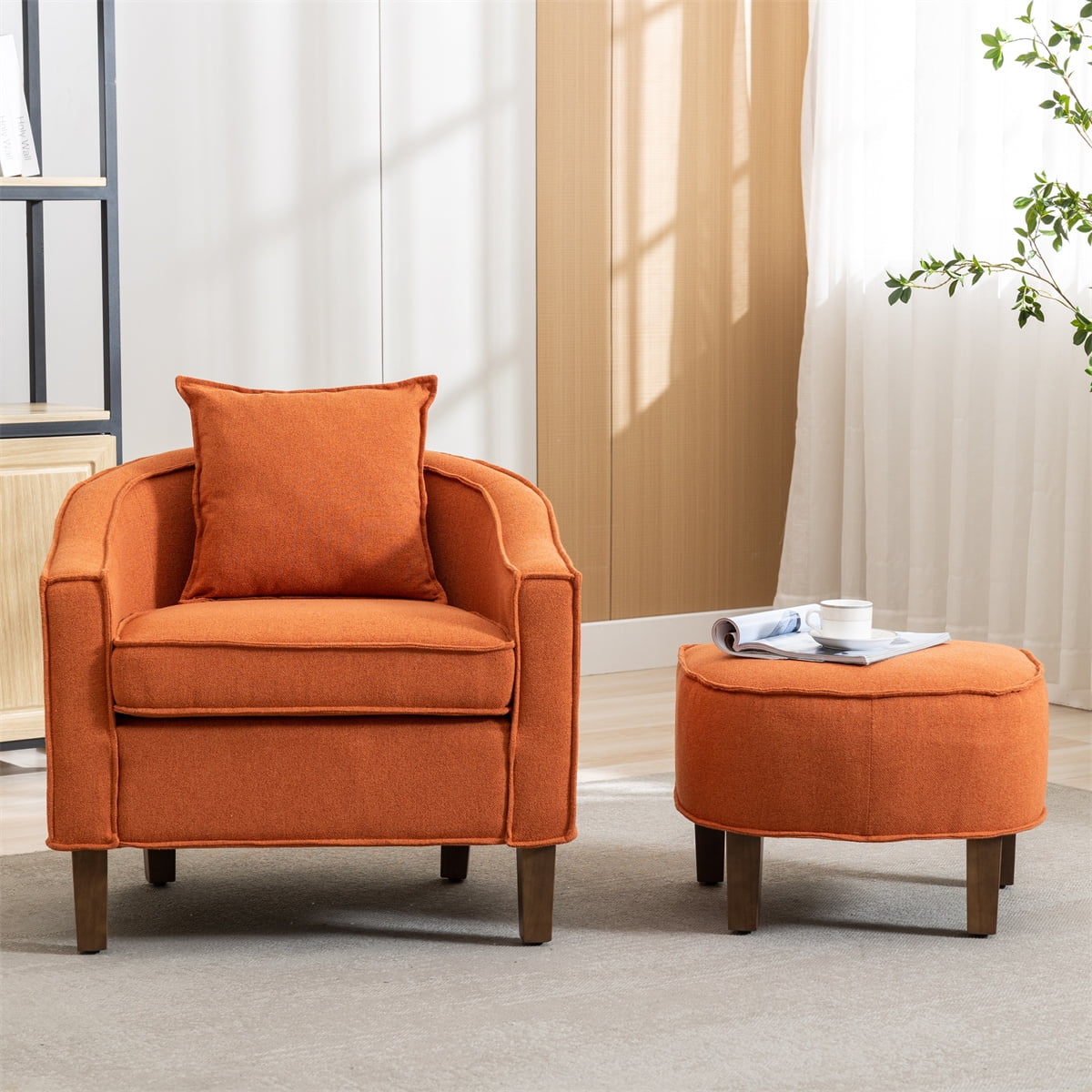 [Sturdy & Stable Structure]: This leisure tub armchair with ottoman set is constructed with a solid wood frame, ensuring good durability and strong support. Simple and elegant wooden supportive legs are not easy to crack, keeping it from standing with great stability even on the concave and convex ground. This accent chair is sturdy and stable enough to hold up larger load bearing. [Comfortable Seating]: This barrel chair set is covered with soft linen or microsuede fabric, giving you comfortable touching. Seat cushion is filled with high-density and high-resilient foam, which is more resilient and will not deform easily. Ergonomic curved backrest can perfectly match your body shape to provide effective support for your back. [Accent Chair with Ottoman]: This accent chair completely comes with an additional matching ottoman to hold your legs with great stability. You can sitting on chair and put your legs on ottoman to relax your body. The ottoman can also be used as a stool for extra guests crowded around the living room. The ottoman could be placed on the chair when not in use. [Modern Design]: With a perfectly designed ottoman to match this club chair, you will be lounging in style. The studded outline of the chair adds the perfect amount of flair to compliment the tufted seat back, plush cushions and black wooden legs. Both the club chair and the ottoman have cushions to promote the maximum amount of comfort while in use. [Easy To Assemble]: The elegant single sofa chair set will be shipped in 1 package, along with an instruction and all necessary hardware. It’s easy to install this armchair by the following instruction. Adults can complete the installation in 10 minutes. If you have any question, please contact us. We will reply in 24 hours.