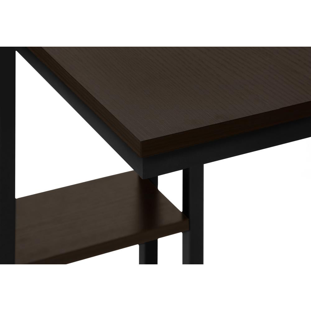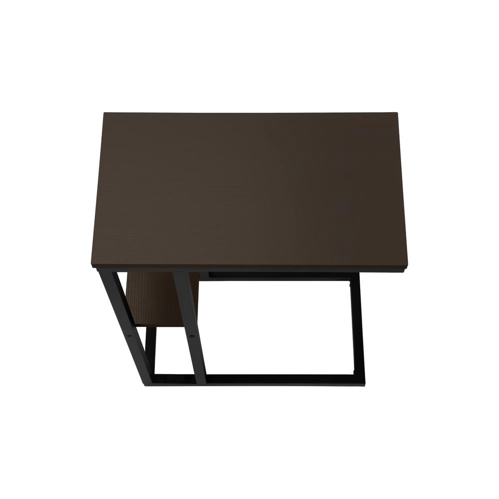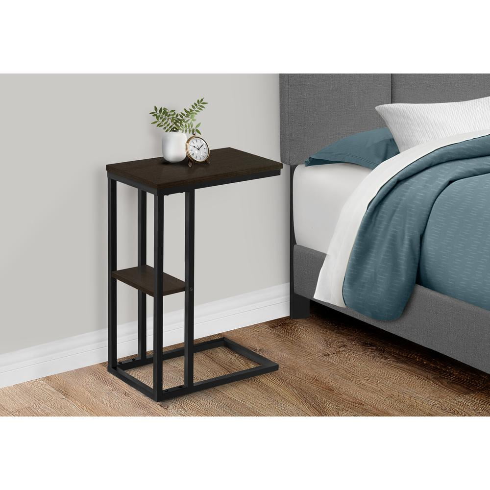 C-shaped accent table with a base that can be slid underneath sofas for convenience Features a dark brown espresso rectangular tabletop and a metal frame with a small secondary shelf Sturdy yet lightweight enough to be moved as needed Assembly required: Illustrated instructions and all hardware are provided for convenience (additional tools may be needed) Product dimensions: 18.25 inches L x 10.25 inches W x 25.25inches H