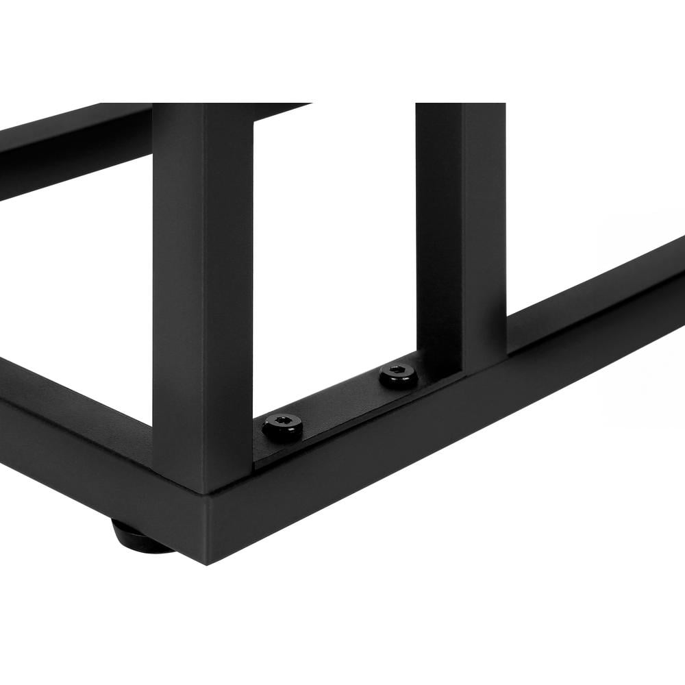 Straight lines and clean angles give this C-shaped accent table an elegantly modern look. The rectangular tabletop in a dark brown espresso finish is supported by a black metal frame with a secondary shelf underneath the table for convenient placement of smaller items. Slide this versatile end table under a sofa or chair to place snacks or mobile devices or use as a side table next to a bed. Features: Materials: Particle board, metal Finish: Espresso C-shaped accent table with a base that can be slid underneath sofas for convenience Features a dark brown espresso rectangular tabletop and a metal frame with a small secondary shelf Sturdy yet lightweight enough to be moved as needed Assembly required: Illustrated instructions and all hardware are provided for convenience (additional tools may be needed) Specifications: Product Dimensions: 25.25″H x 18.25″W x 10.25″D Product Weight: 9 lbs