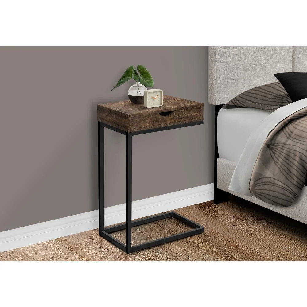 Finish: Brown and Black Material: Particle Board, Laminate, and Metal Boasting spiffy styling; its sturdy black metal base is as elegant as it gets Sleek brown reclaimed driftwood look with a trendy cement look brings a contemporary design to this C shape side table For flexibility, try it as your living room snack table or simply an accent table to dress up your living room decor Includes storage drawer for remotes, coasters or other accessories; protective pads prevent damage