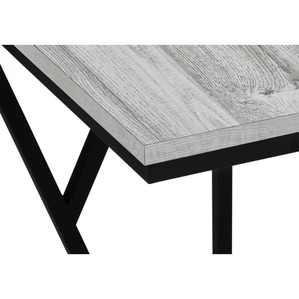 C-shaped accent table with a base that can be slid underneath sofas for convenience Features a smooth, gray wood-look rectangular tabletop and black metal frame with asymmetrical triangle detail Sturdy yet lightweight enough to be moved as needed Assembly required