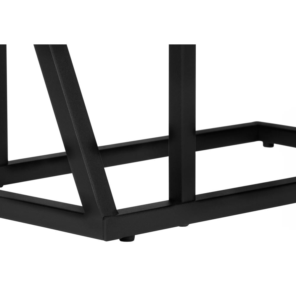Straight lines and clean angles give this C-shaped accent table an elegantly modern look. The rectangular tabletop in a smooth, gray wood-look finish is supported by the black metal frame with intersecting lines that form two asymmetrical triangles. Slide this versatile end table under a sofa or chair to place snacks or mobile devices or use as a side table next to a bed. Features: C-shaped accent table with a base that can be slid underneath sofas for convenience Features a smooth, gray wood-look rectangular tabletop and black metal frame with asymmetrical triangle detail Sturdy yet lightweight enough to be moved as needed Assembly required Specifications: Product Dimensions: 25.25″ H x 10.25″ W x 18.50″ D Product Weight: 8 lbs Assembly Required: Yes