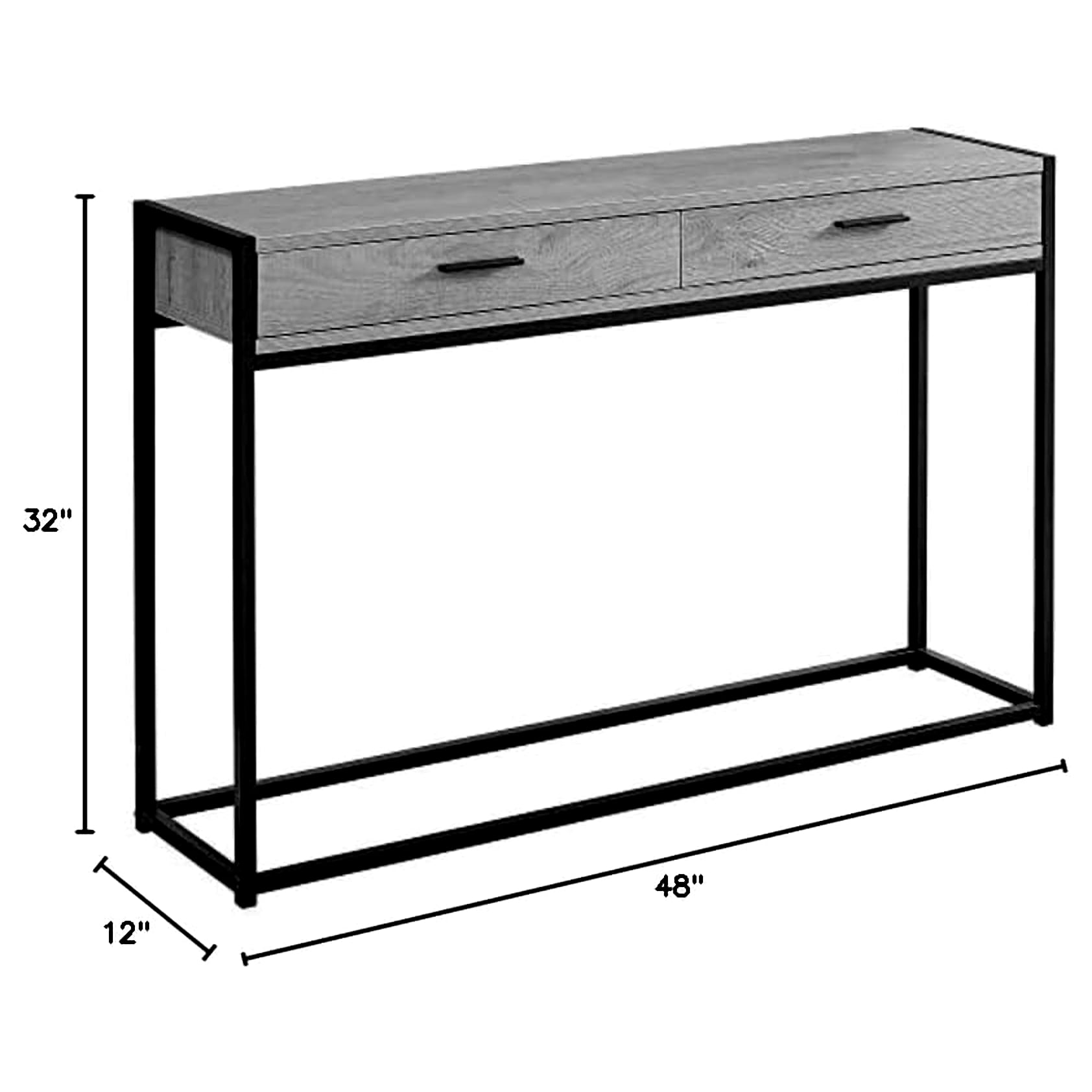 Boost the look of your entryway, hallway, living room or office space with this modern style, rectangular console accent table that contrasts rustic warmth with a chic industrial vibe. Made with high quality MDF material, the smooth laminated grey wood-grain look stands out against the solid black metal square base with its clean minimalist lines. The two handy storage drawers on metal glides are perfect to store keys and paperwork, while the spacious table top can hold books, pictures, decorative objects, or a lamp. This versatile and functional console table will be the most useful furniture piece in your home today! Assembly is required. Features: Finish: Gray and Black Material: MDF, Laminate, Metal 2 large storage drawers on metal glides with a sleek black metal handles Sturdy metal legs in a minimalist style Multi-functional console table ideal even for small spaces Contemporary industrial design contrasts with rustic table top Laminated finish blends well with any decor Specifications: Product Dimensions: 32″ H x 48″ W x 12″ D Product Weight: 42 lbs