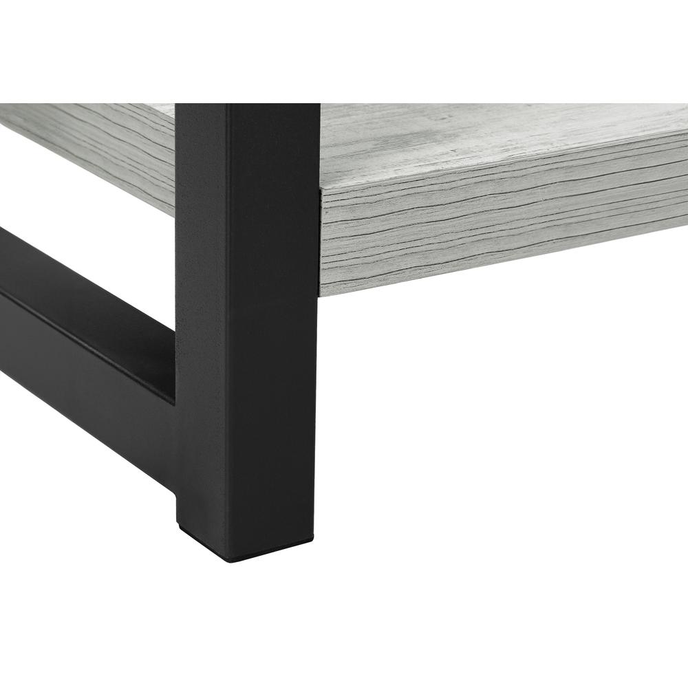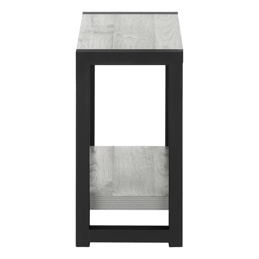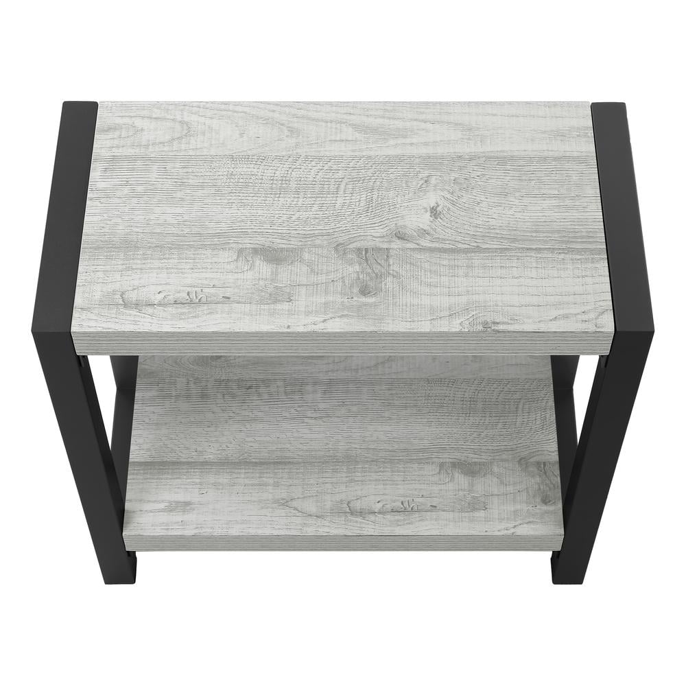 Materials: Particle board, hollow-core, laminate, MDF, metal 2-tier accent table with a thick, rectangular tabletop and fixed lower shelf in a smooth, grey wood-look finish Sturdy metal legs in black provide stability Finished on all sides for flexible placement in living rooms, bedrooms, or any room in need of a side table