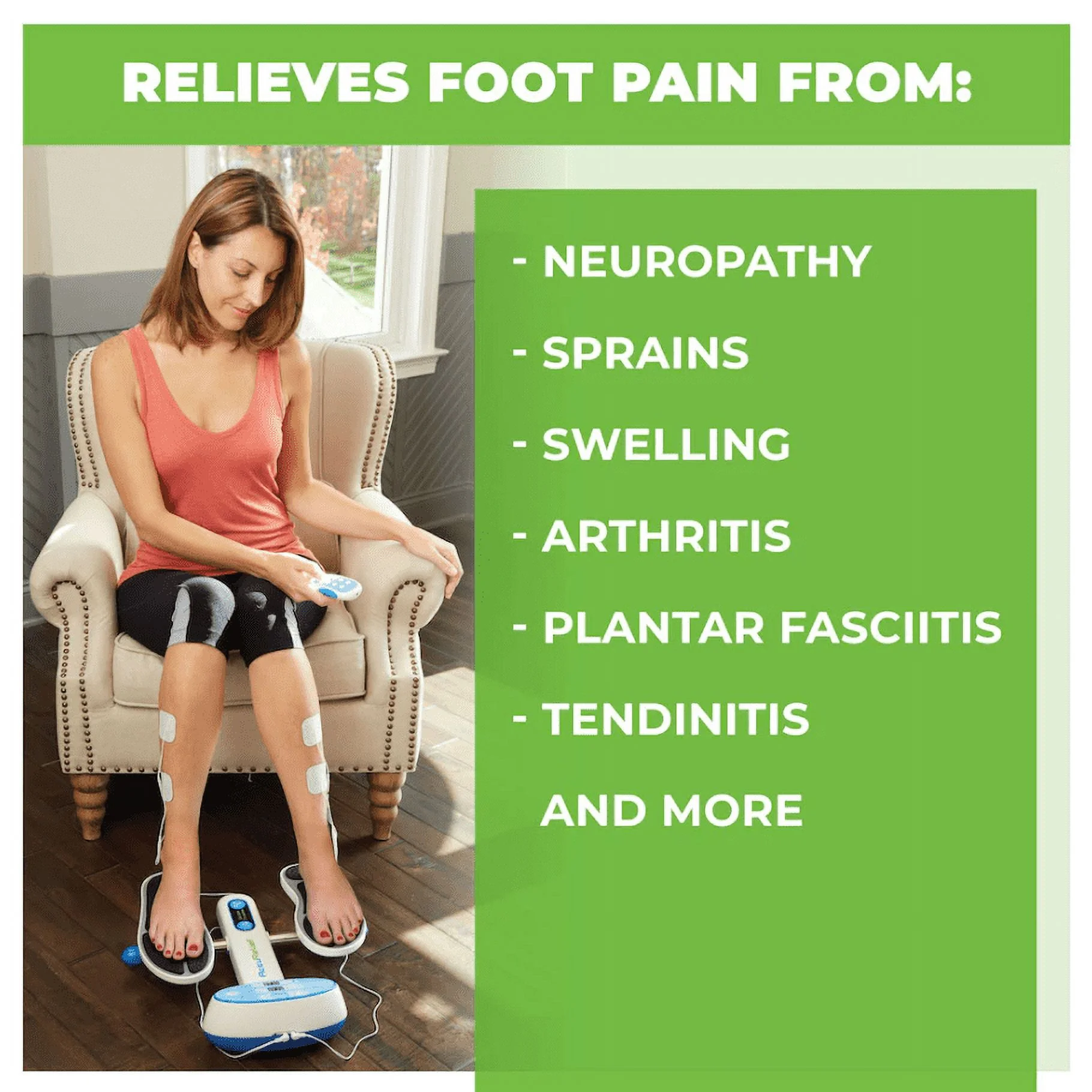 AccuRelief Ultimate Foot Circulator: 3-channel electric stimulator: 1 for foot stimulation and 2 for body stimulation Designed for foot pain concerns from neuropathy, sprains, swelling, arthritis Easy-to-use remote control for electrical stimulation with 15 preset programs to help alleviate muscle pain, tired and sore muscles as well as to assist with increasing blood circulation for swollen ankles and feet Designed for immediate relief Ideal for use when traveling or when at home or work AccuRelief foot circulator (ACRL-5500) is suitable for men and women