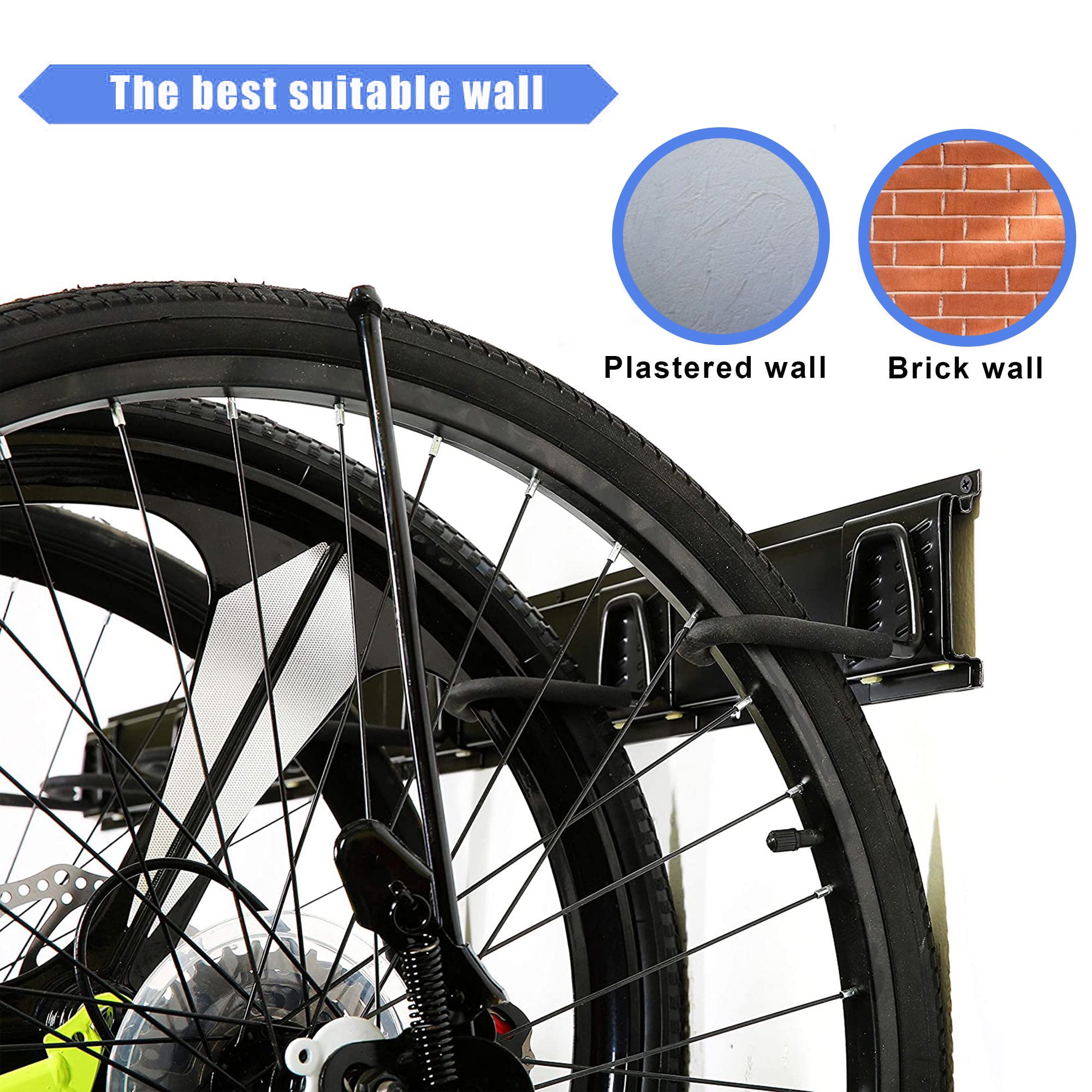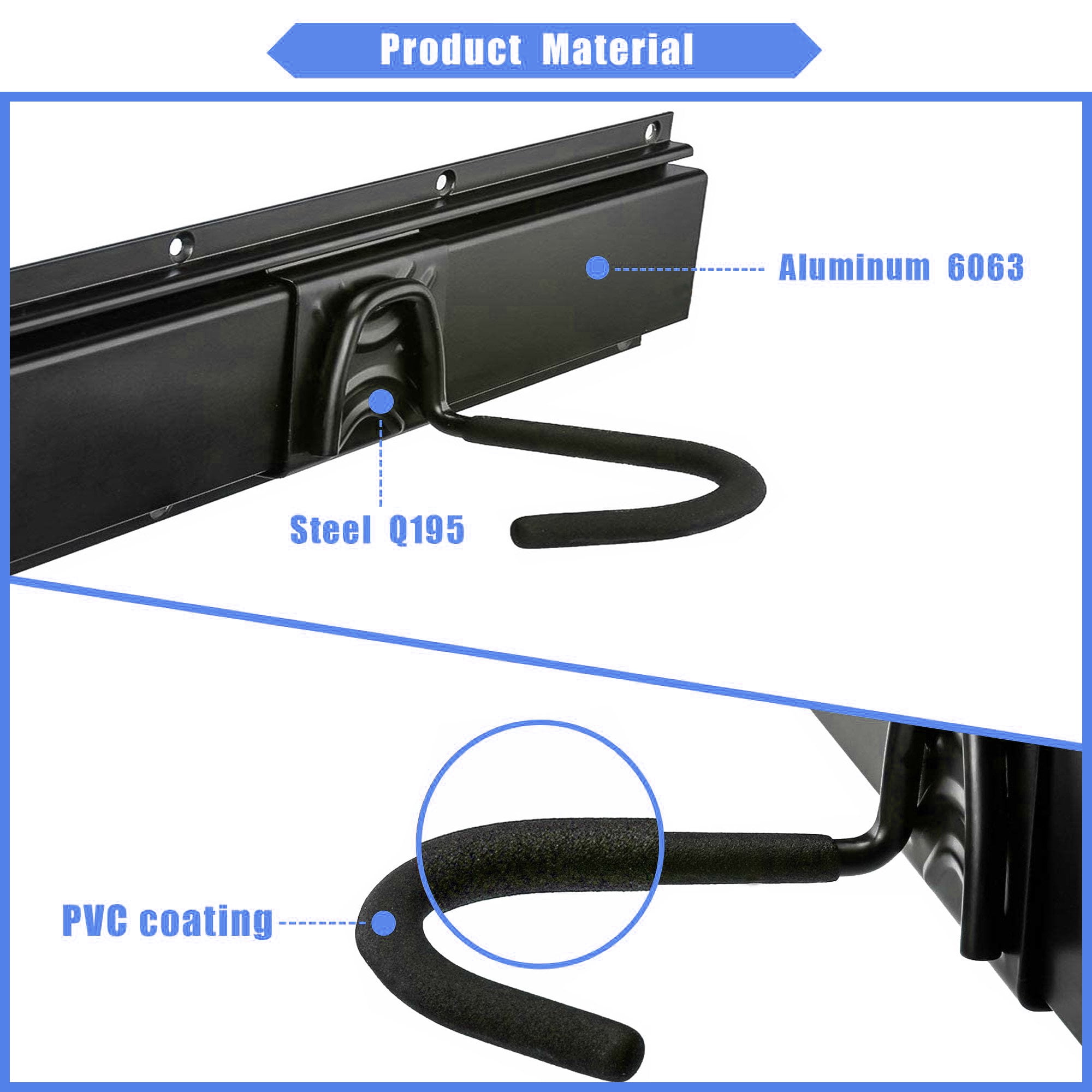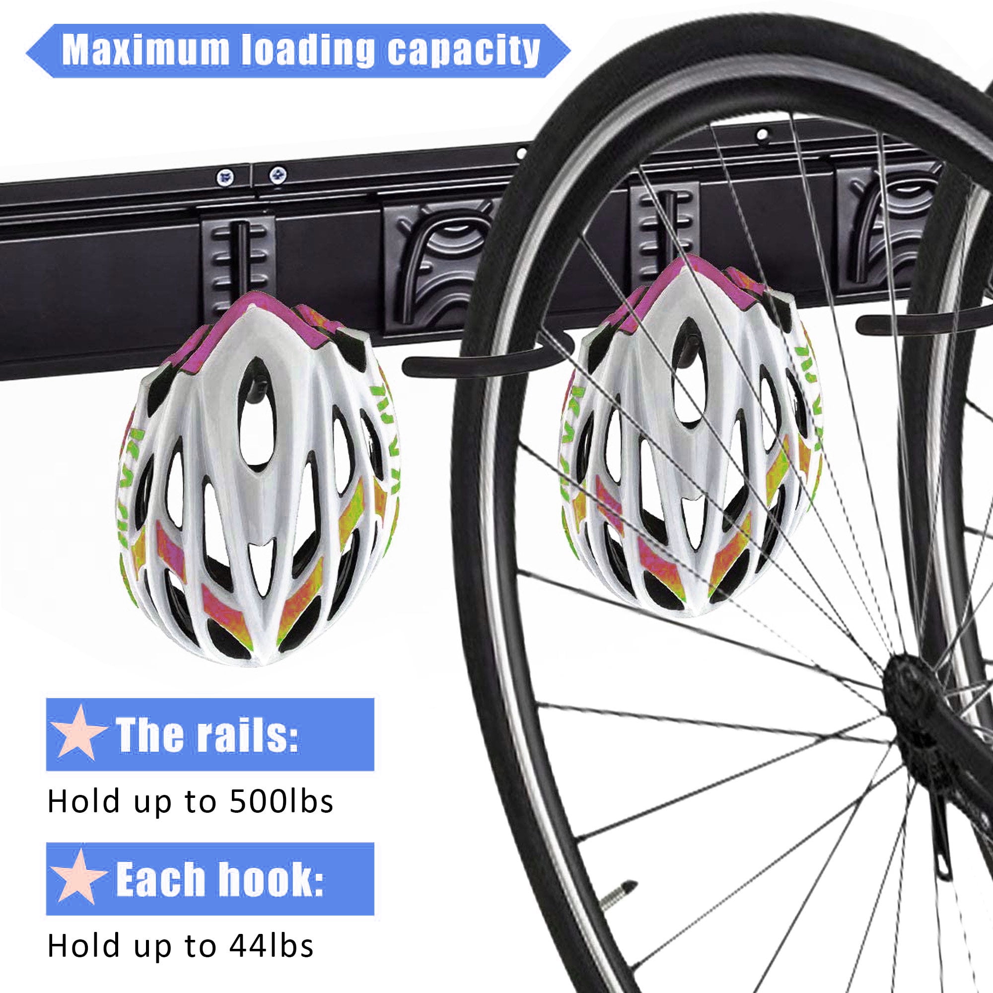 acdancBike Storage Rack Garage Wall Mount Hanger for 6 Bicycles + 3 Helmets, Heavy Duty Tools Storage Hooks Adjustable Home Space Saving, Holds Up to 500lbs. These bike hooks system make the bicycles off the floor to free up some valuable room for your garage or house space. Fits most kinds of bikes: mountain bike, road bike, folding bike, adults bike and kids bike etc. All hooks can easily repositioned anywhere on tracks of the panel when storage needs change. Easy-clicked hooks can install in a snap. Easy to put on or take off the bikes, save your time and energy. This wall mount bike rack is made of high-quality steel. Powder-coated steel for durability-resists of rusting, chipping and cracking. Rubber-coated sleeves prevent the tools from being scratched or from slipping. Bicycle garage rack has pre-drilled holes and can be installed in just a few minutes with included instruction and hardware. The bike storage hanger has 3 tracks and 6 removable bicycle hooks, 3 accessories hook to hang your helmets or other accessories.