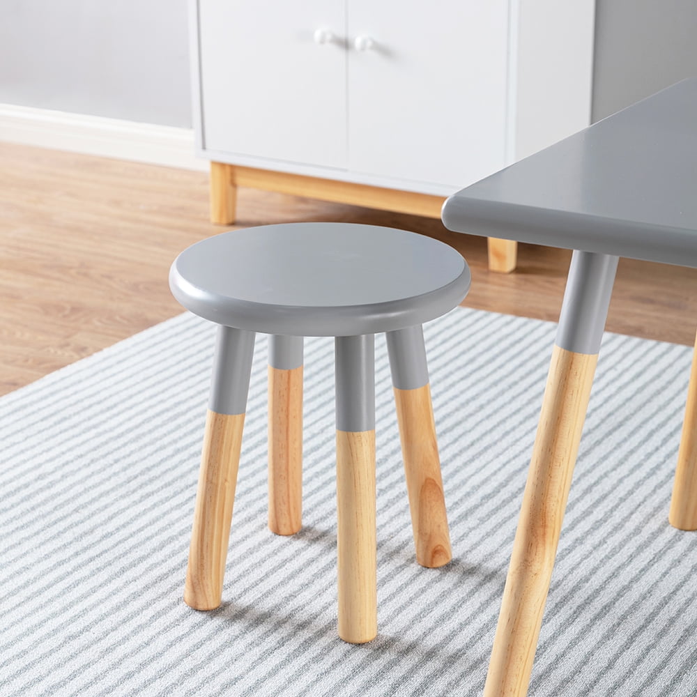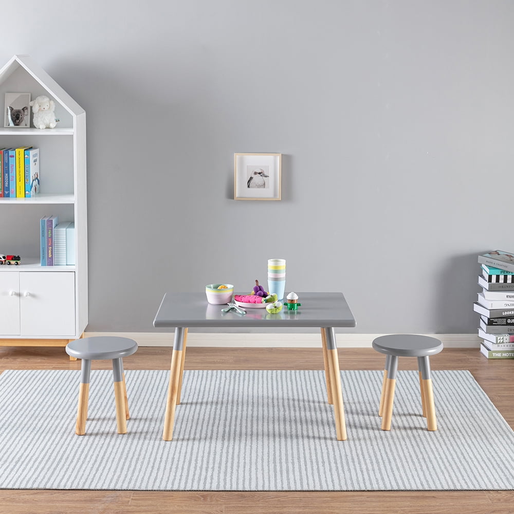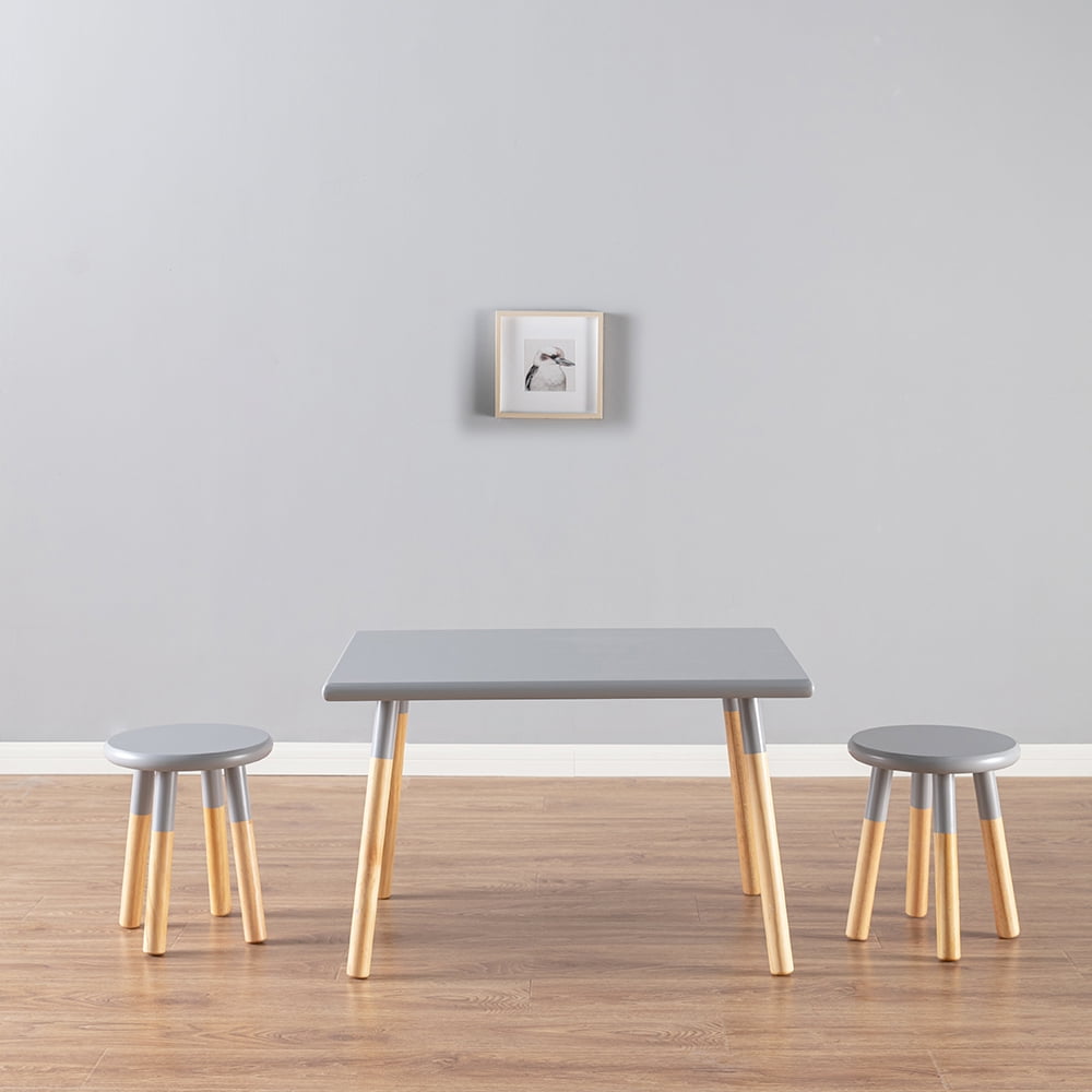 ACESSENTIALS 3-PIECE KIDS TABLE AND CHAIR SET: Includes one table and two coordinating stools to provide a creating, playing and dining space for your toddler and their friends SPACIOUS TABLE SURFACE: Great for crafting, reading, solving puzzles, eating, homework and more DURABLE WOOD CONSTRUCTION: Durable pine wood tabletop and solid wood legs provide stable construction for worry-free playtime COLOR: Gray EASY ASSEMBLY
