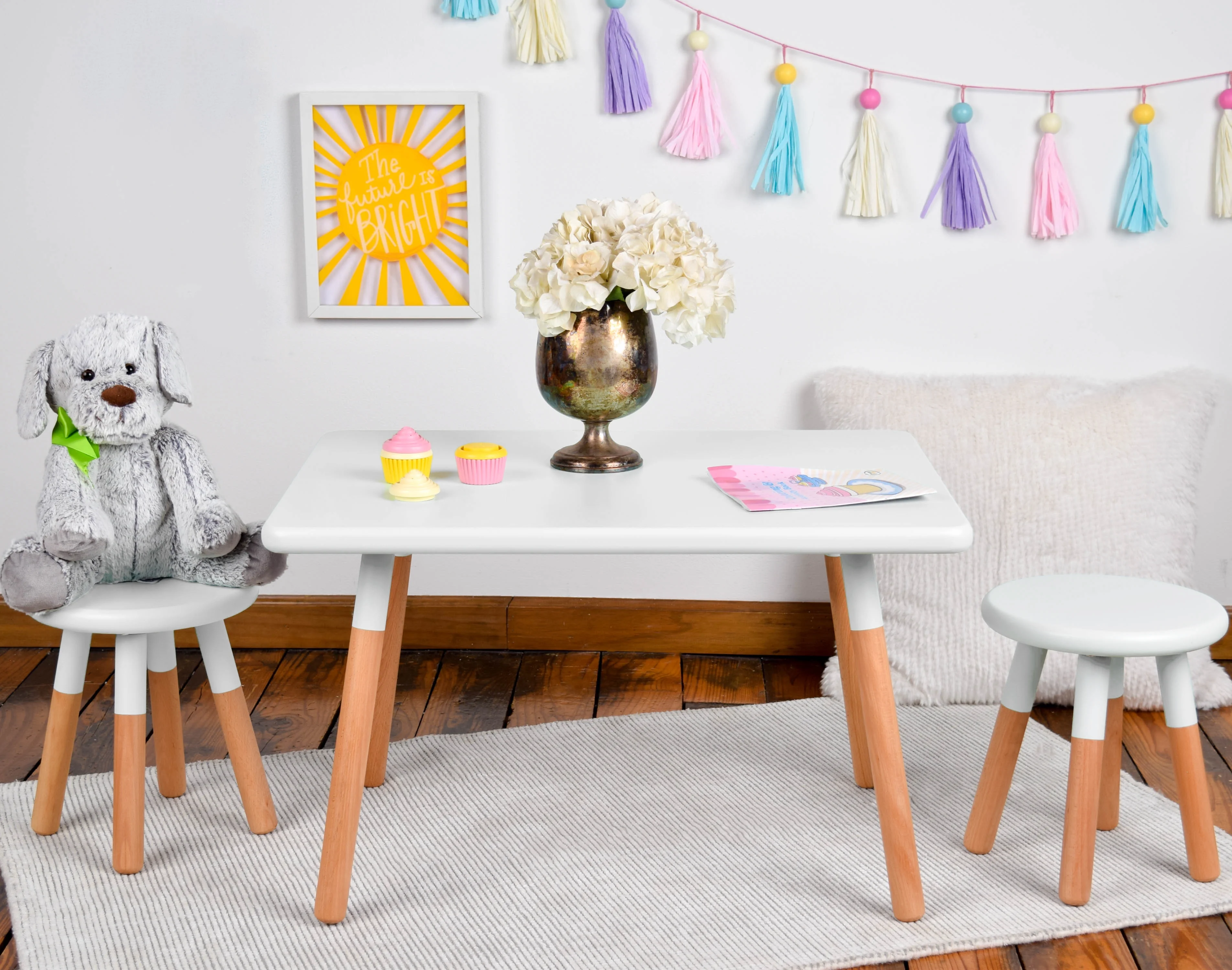 Add a touch of freshness to your child’s playroom. This kids set, sold with one spacious table and two stools, is constructed of MDF made from beech wood and is dipped in a clean, white paint. This is an ideal place for tea parties, craft time, board games, and endless other activities. Assembly required. Available in six fun colors.