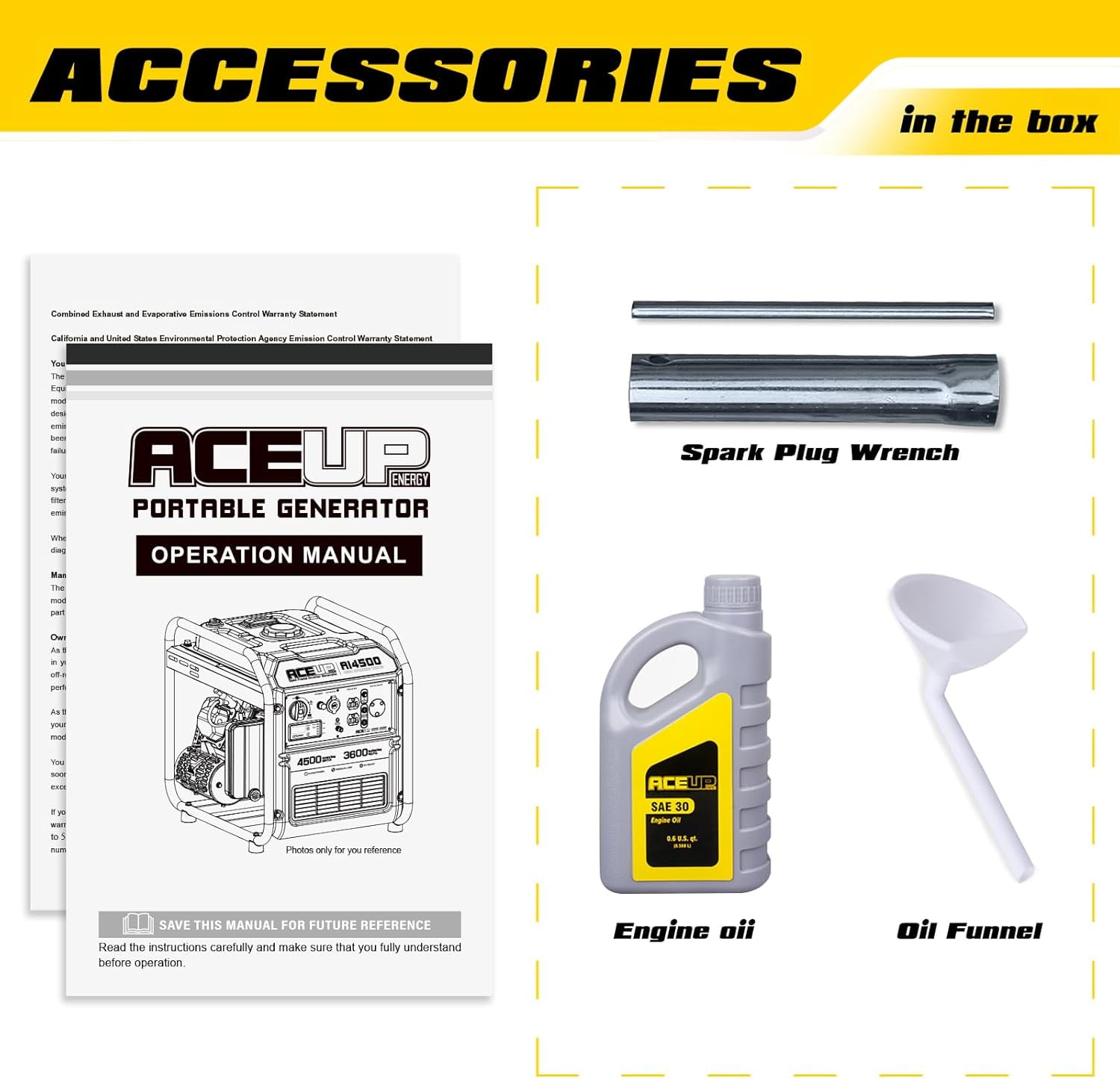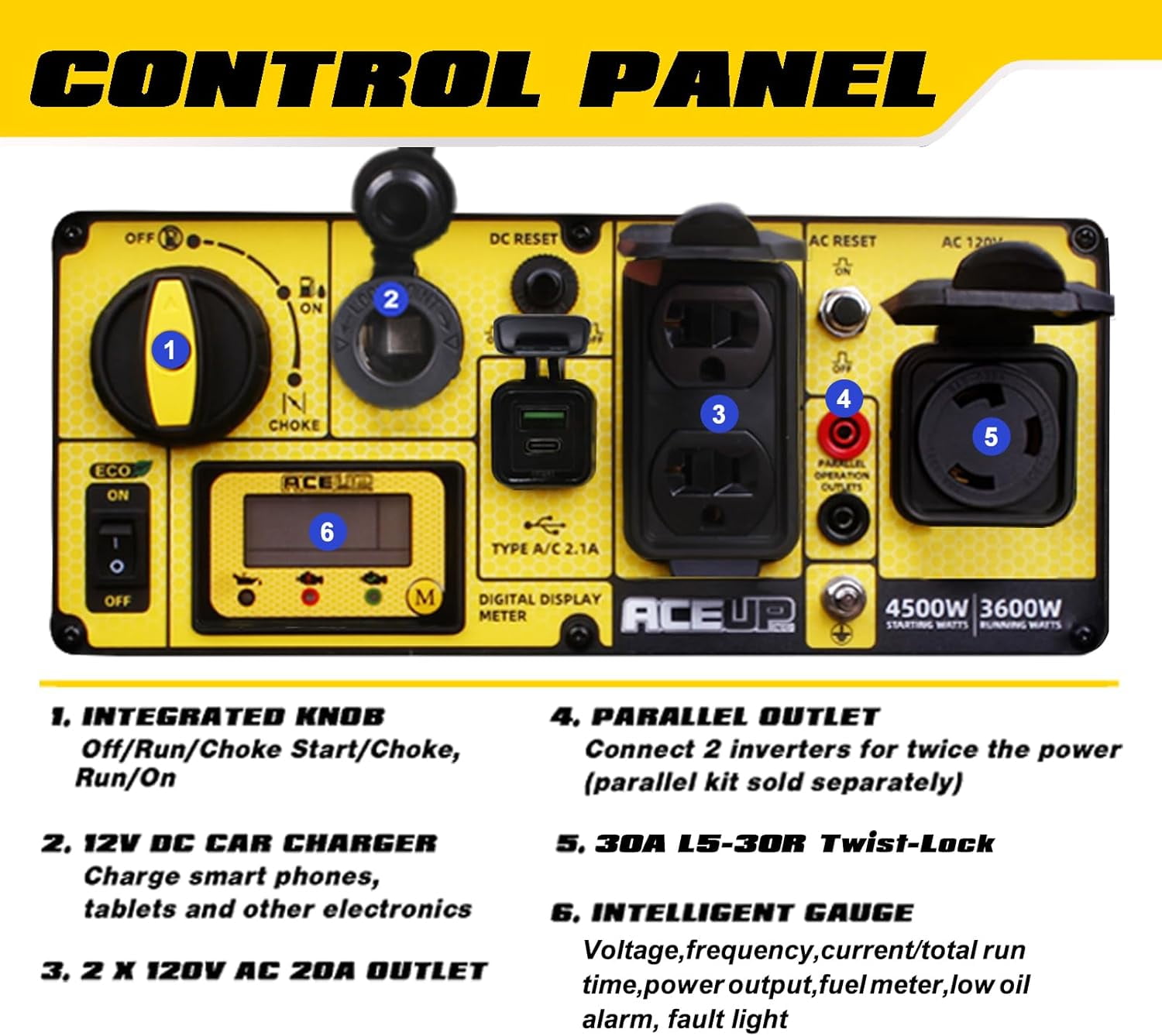 223cc 4-stroke OHV engine produces 4500 peak watts and 3600 rated watts with recoil start for up to 10 hours at quarter-load on 2.65 gallon, 60Hz Intelligent gauge keeps track of voltage ,run-time and hertz and track power output, plus feature low oil led and economic mode to save fuel and reduce volume Includes 120V AC two 20A outlets and one 30A Twist-Lock, one 12V DC 8.3A outlet, Type A/C ports; Parallel ready to connect 2 generators for twice the power (parallel kit sold separately) Aceup Energy’s inverter technology produces the clean power required by a variety of sensitive electronics, such as phones, laptops and other outdoor electronics 5-in-1 Knob:fuel on/shut-off,engine on/off,choke;When turning off the engine, the fuel switch is turned off at the same time, which avoids the risk All portable generators are functionally tested in the factory to guarantee quality; EPA compliant; Backed by a 1 year limited and free lifetime technical guidance from experts Intelligent Gauge .Eight mode digital meter for displaying voltage, frequency,session run time, total run time,poweroutput, low oil alarm, fault light , normal operation light. V.Hz.H- Display voltage(V), frequency(Hz) and total run time(H) of the generator. Percentage of power output. Percentage of gasoline Low Oil indicator – When ON, engine will shut down and not run. Check oil level. Fault indicator -indicate overload, short circuit. Check load. Running Indicator – indicate normal operation. If the fault light is on, please make sure there is no overload. Then press and hold M for 3 seconds to reset, andit will run again. NOTICE: The break-in period will last about 25 hours of use. DO NOT exceed 75% of the generator’s rated capacity during this period. NOTICE: To avoid engine problems,the fuel system should be emptied before storage of 30 days or longer. NOTICE:All engine functionally tested in the factory and may contain minimum residual oil or fuel odor, which is a normal phenomenon. Our brand is Aceup Energy, all products made in our own factory with more than 20 years experience