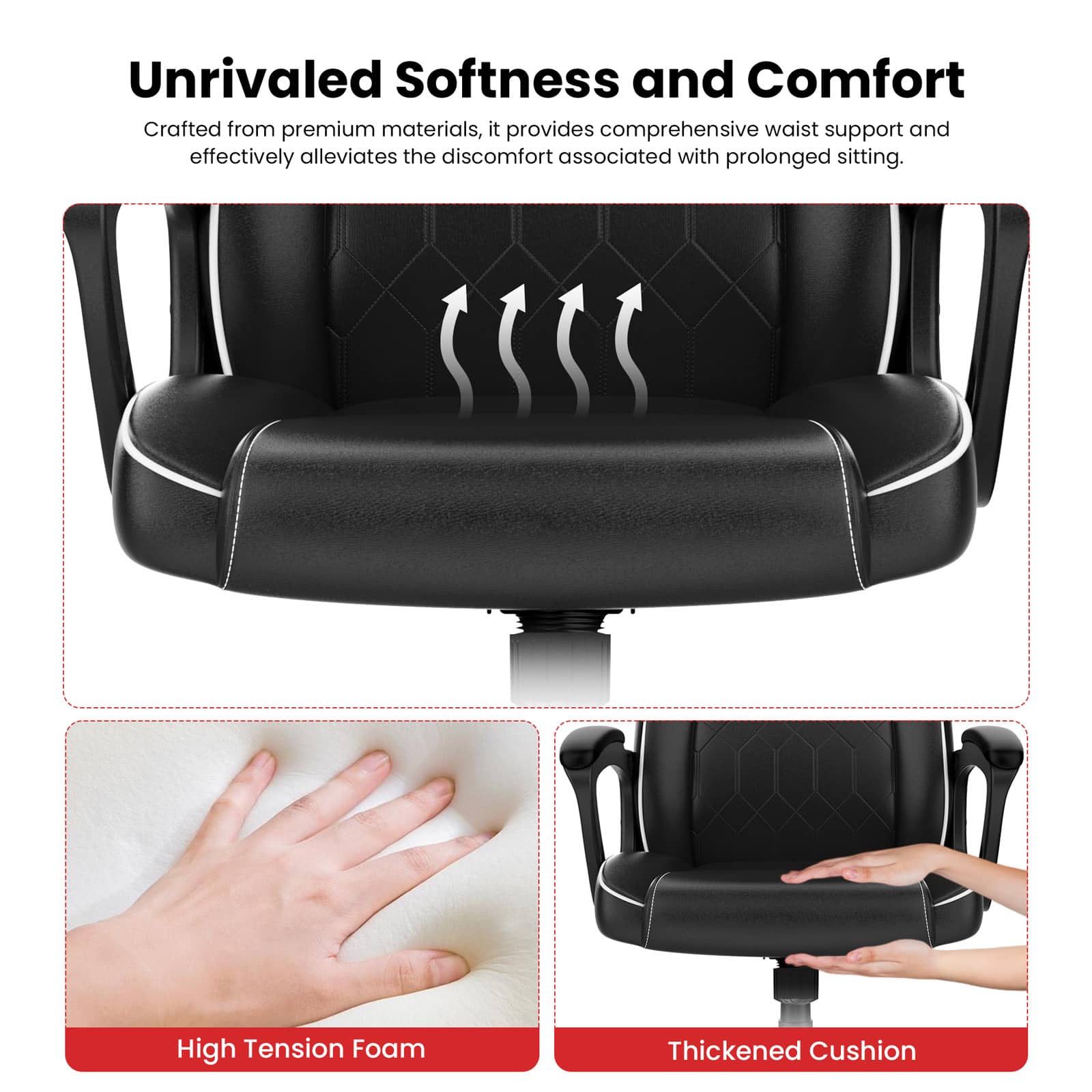 The raised backrest is tailored to conform seamlessly to the natural curve of various body types and offers comprehensive waist support, ensuring optimal support for most users. The generously sized seat cushion, made from premium materials, effectively reduces discomfort associated with sedentary lifestyles, allowing users to sit for extended periods easily.