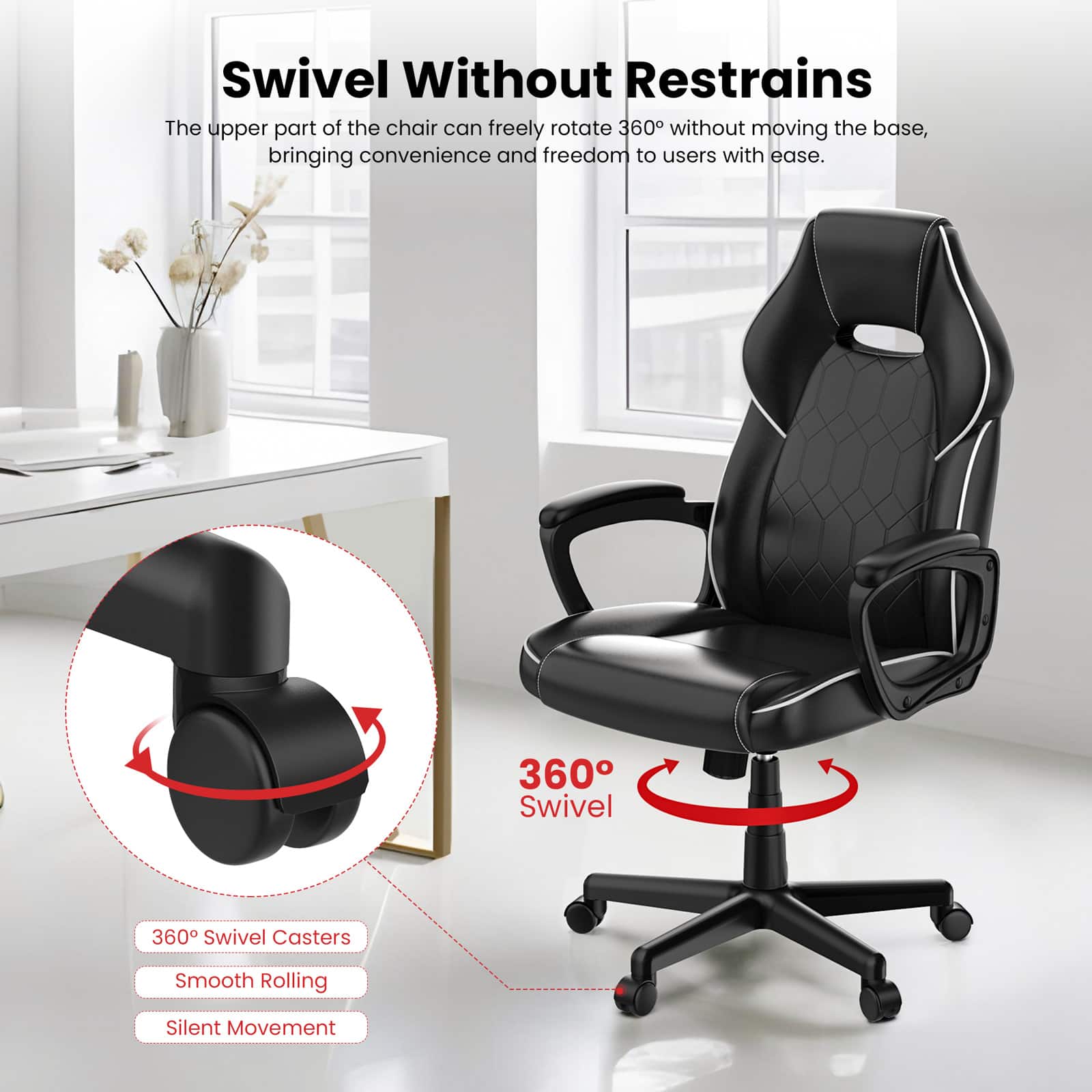 Getting the most comfortable viewing angle quickly for immersive gameplay by rotating the chair 360° without rolling the casters. The 360° rolling casters allow for easy and seamless movement across various types of flooring without causing any noise disruptions, enhancing your mobility and multitasking.
