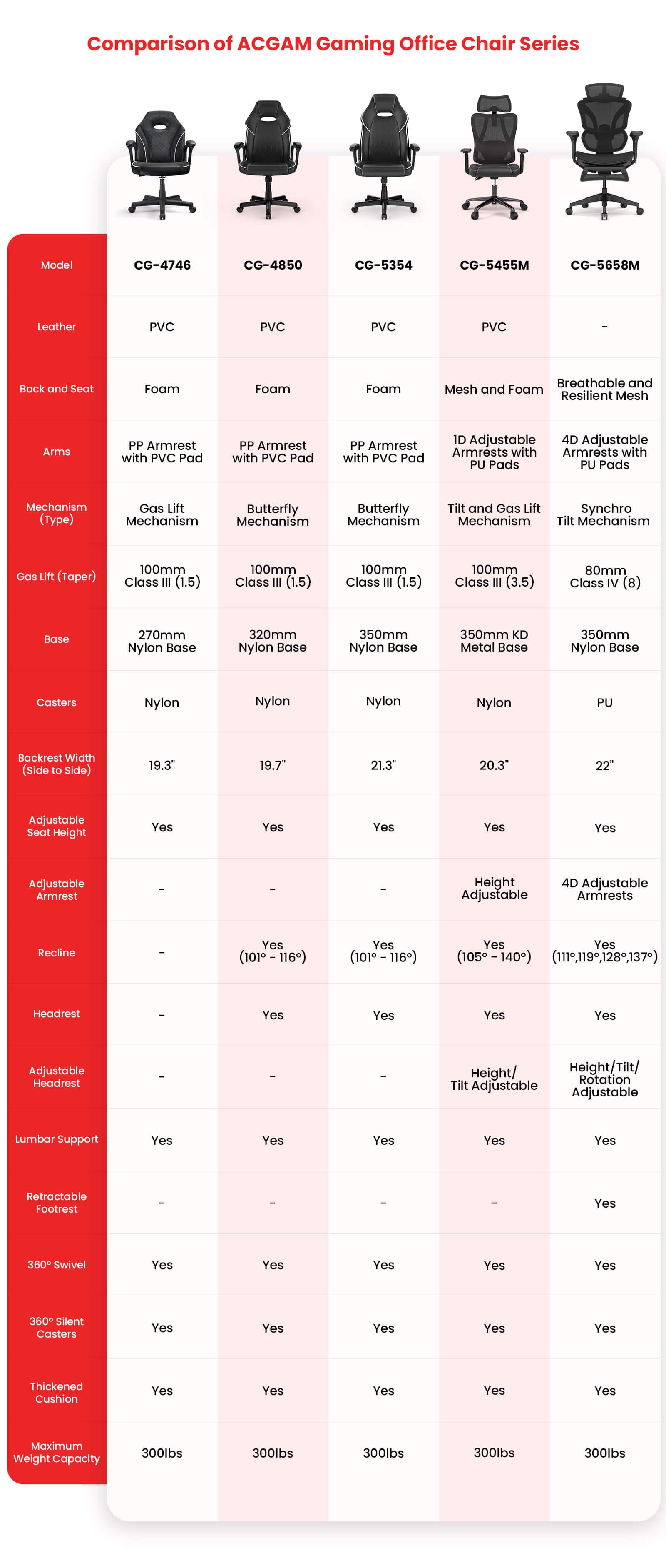The ACGAM CG-5658M ergonomic gaming chair features an 80mm Class 4 gas lift that provides a smooth, quiet height adjustment with superior durability. The rugged construction and robust 5-point base ensure a secure and stable seat for long-term use. Its 360° swivel design lets you reach different areas without straining or twisting your body, and 360° rolling casters allow for smooth and silent movement.