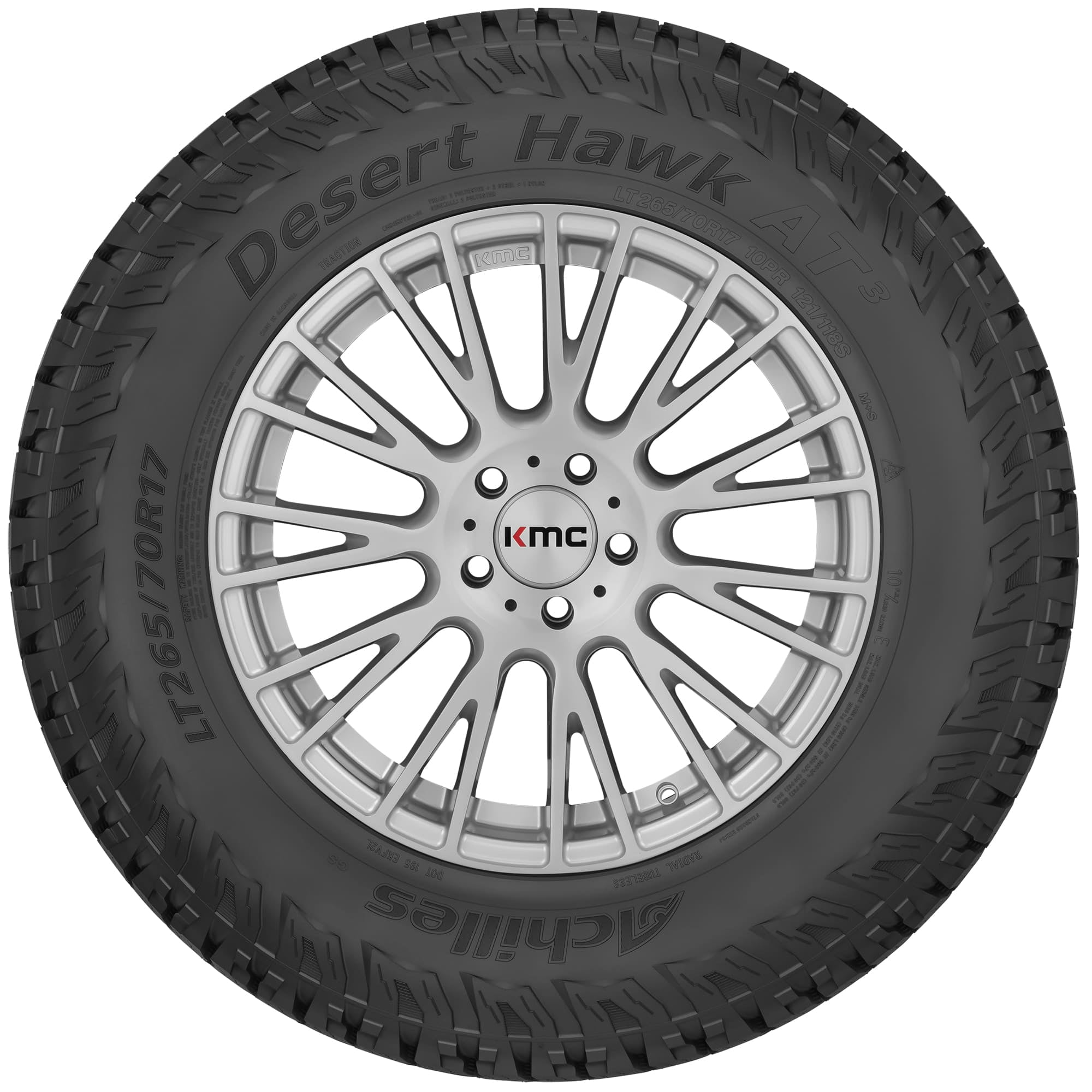 Achilles Desert Hawk AT3 275/65R18 116T OVERVIEW The Achilles Desert Hawk AT3 is an all-terrain tire that is designed for use on light trucks. With an aggressive tread pattern, the Desert Hawk AT3 ensures outstanding traction and stability on various surfaces, from loose sand and gravel to muddy trails, without compromising comfort on the highway. In addition, the Desert Hawk AT3 has a robust construction with reinforced sidewalls that provide extra protection against punctures and abrasions in harsh off-road conditions.