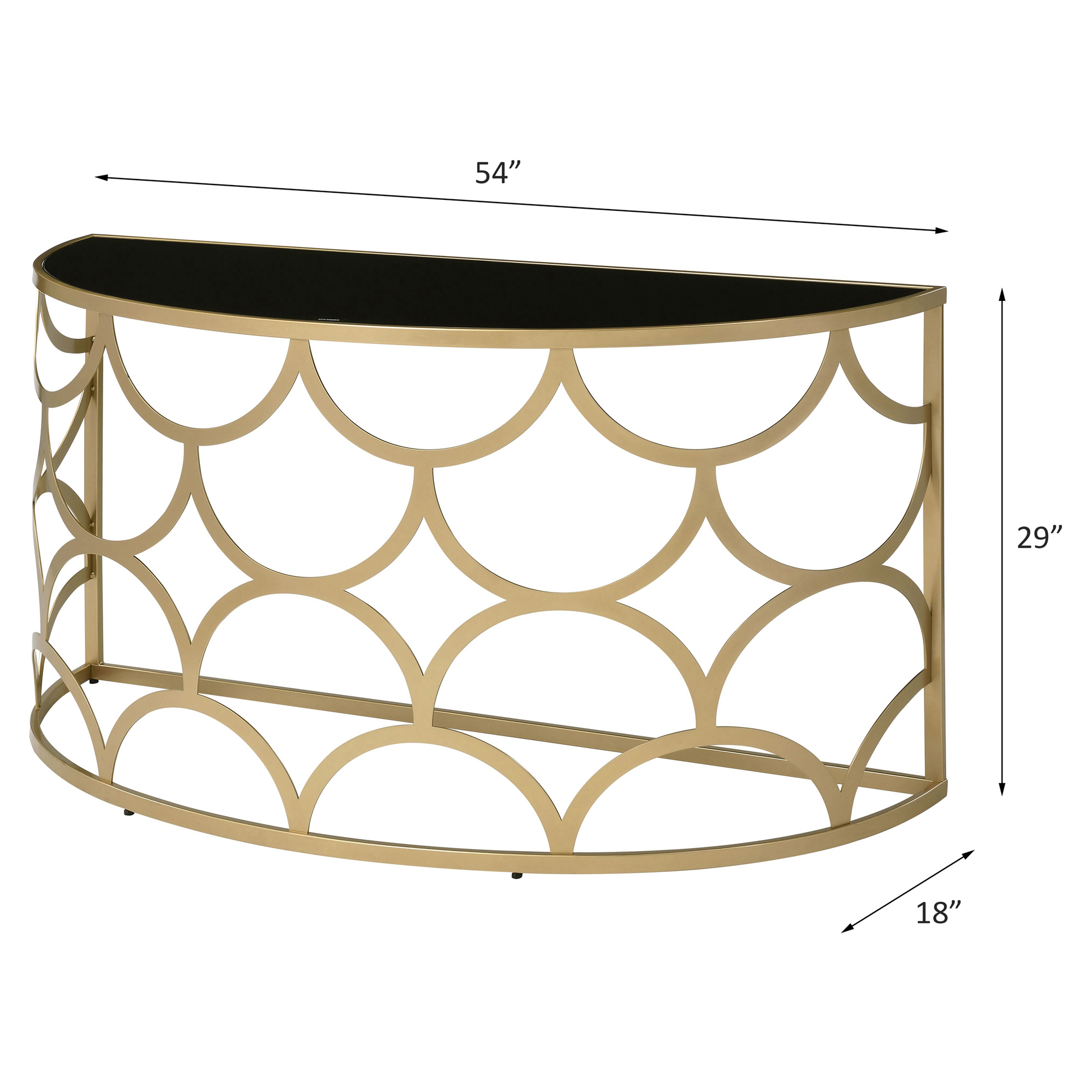 Half moon glass table top 8mm tempered glass top Metal base: Gold finish Assembly required Weight capacity: 66 lbs