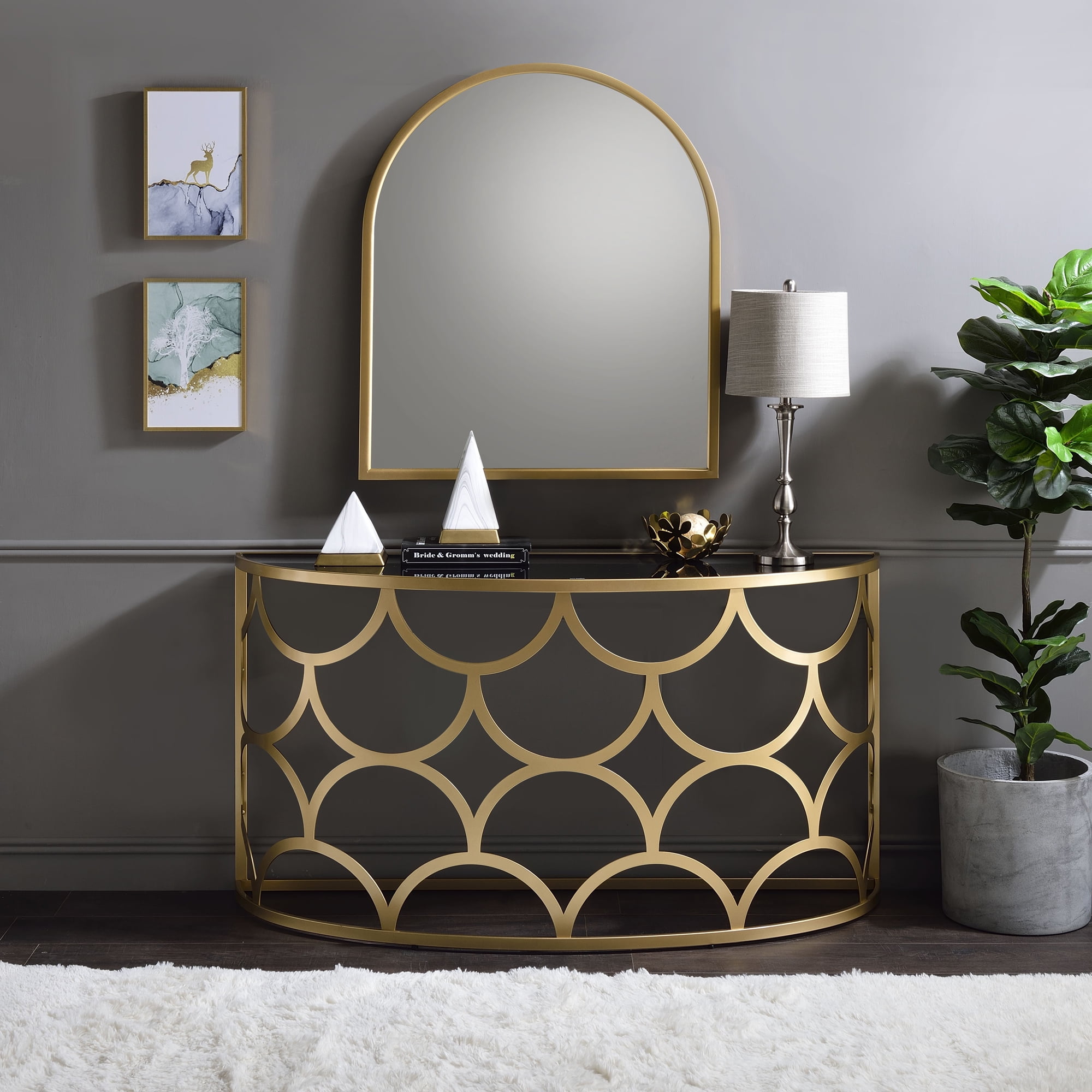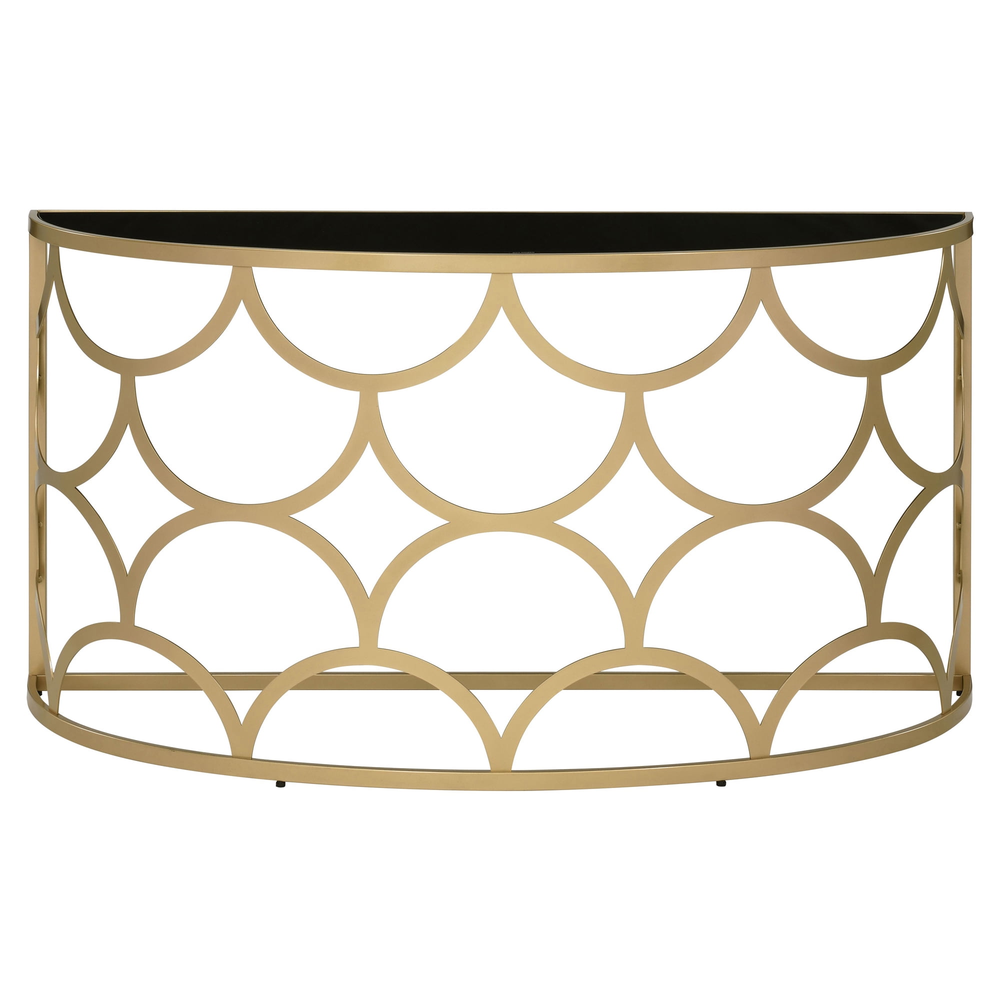The sleek console table has timeless fashion and eye-catching appeal. It’s metal base works perfectly with gold finish, showcasing a striking geometric silhouette in modern style. It features a tempered glass top in half-moon shape that provide elegance and practicality for your space. Accent any setting with this classic occasional piece. Let the Altus Console Table become a stunning centerpiece for your living area.