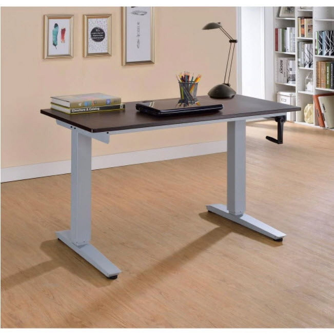 Rectangular writing desk Adjustable Height “T” metal base Wooden table Top Silver powder coating metal tube Product dimensions:24.00″ L x 46.50″ W x 48.00″ H Product Weight:80.00 lb Color:Espresso Click here to view the assembly guide