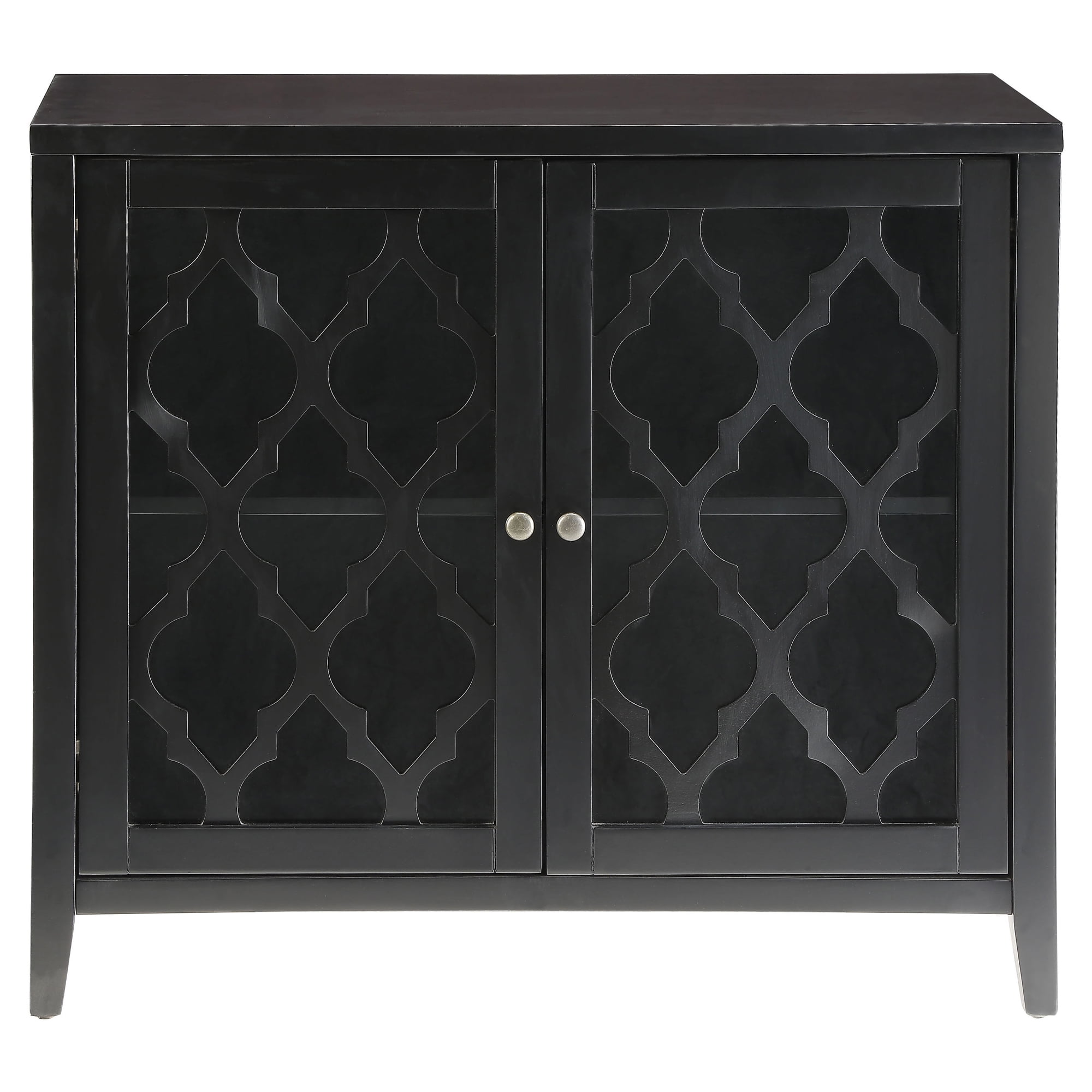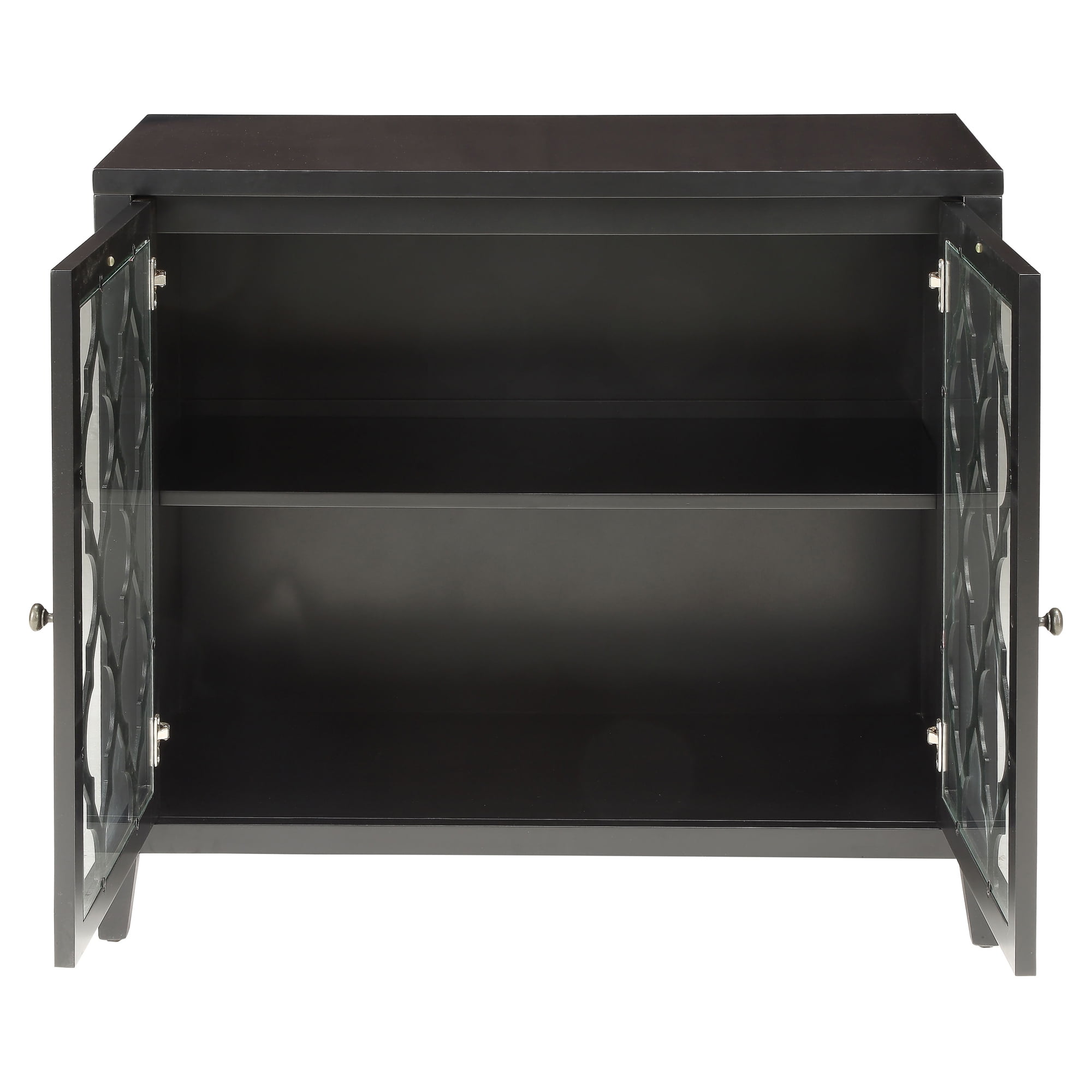 Glass doors With shelf inside Wooden tapered leg Knobs door handle Floor clearance: 4″ Number of shelves: 1 Top shelf dimension: 31″W x 13″D x 10″H Bottom shelf dimension: 31″W x 13″D x 12″H Number of doors: 2 Assembly required Click here to view the assembly guide