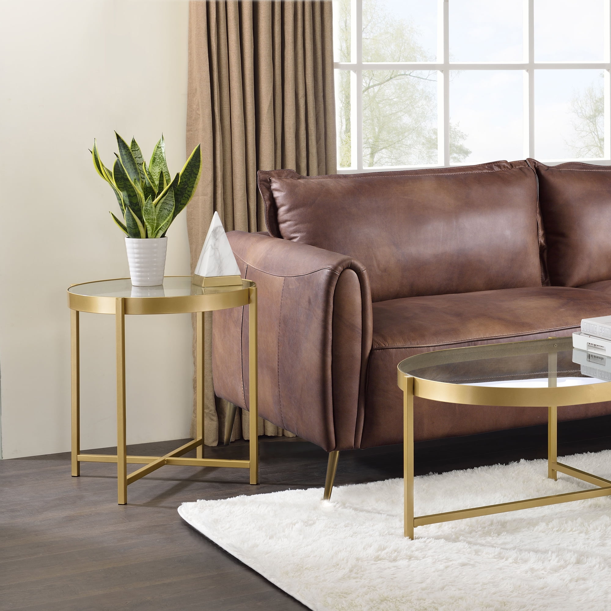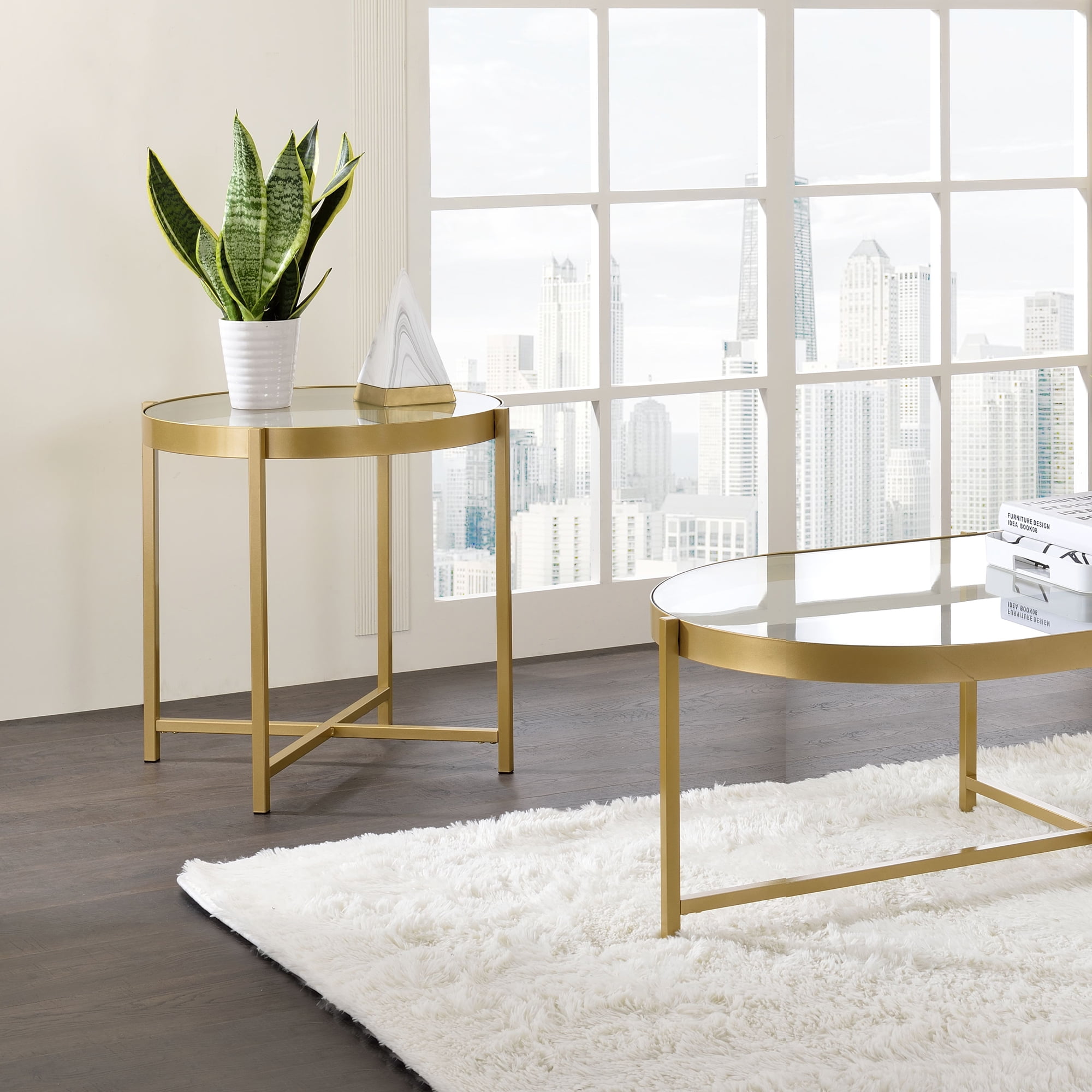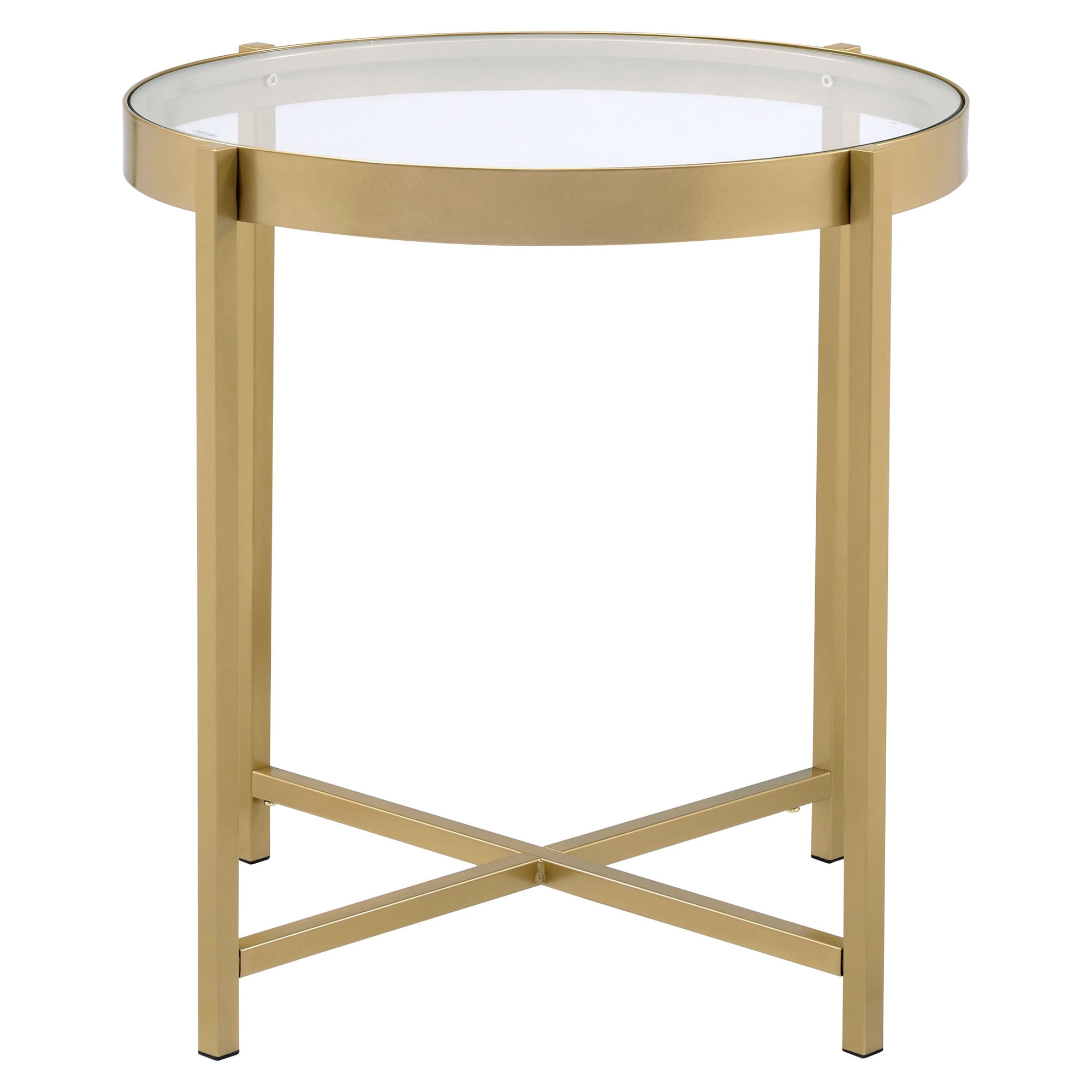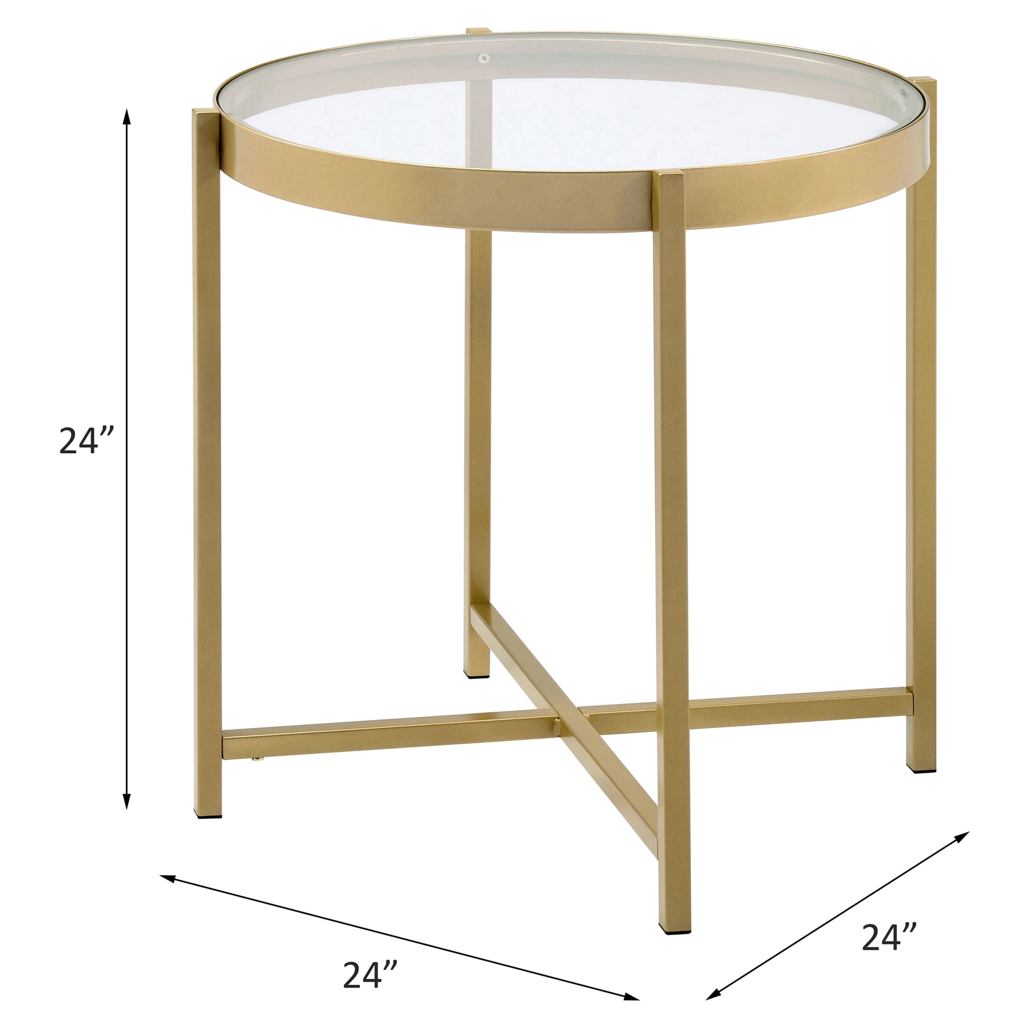 Simple design exhibits a real sense of style. The Charrot End Table has a tempered glass top with round shape design to give you a clean, spacious table top space. The lustrous gold finish showcases it’s cross metal base and metal trim for a clean-lined, elegant look. A perfect pick for modern aesthetics. This beautiful statement piece can anchor a room with it’s high-end contemporary design.