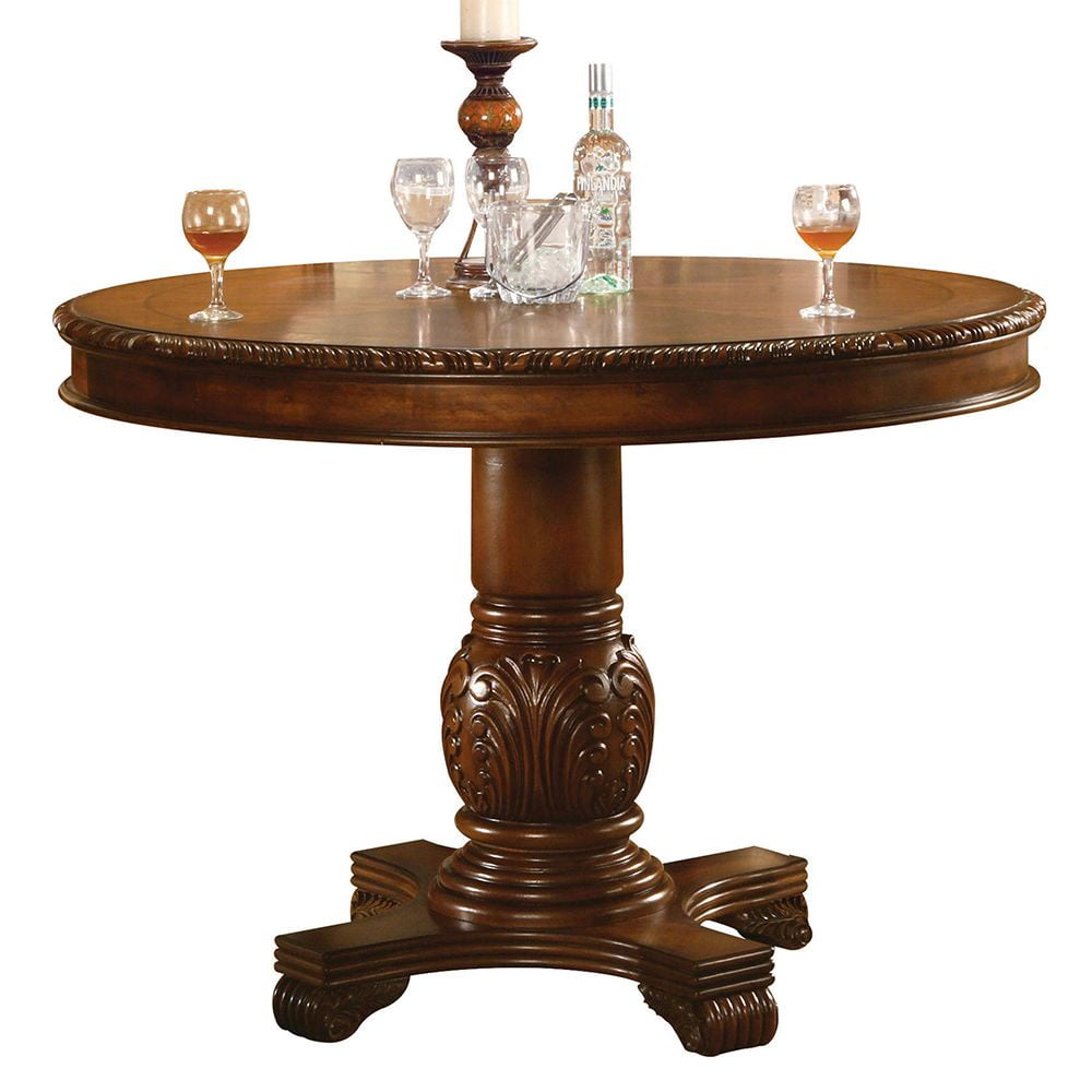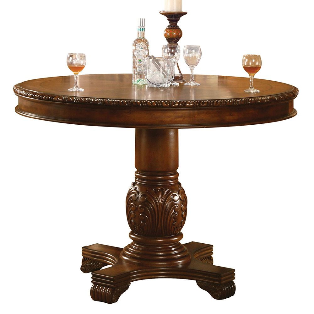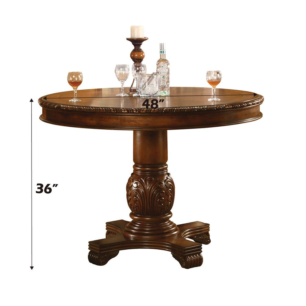 Chateau De Ville Cherry Counter Height Table The Chateau de Ville Traditional Dining Collection features elegant styling decorative carvings and a combination of hardwood and veneers. The pedestal dining table, upholstered chairs are all accented by decorative base and shell motifs. Matching Hutch & Buffet reflects all carefully selected design features as the dining collection. This collection will be the showpiece of your dining room environment. Wooden Top with Grooved Trim (NO Extension) Wooden Pedestal with Raised Floral Motifs Wood Queen Anne Leg Matching Hutch & Buffet with Light Function – Material: Wood, Poly Resin, Veneer (Wood), Composite Wood – Item Depth: 48 – Item Height: 48 – Item Width: 36 – Item Weight: 108 – General Color: Brown