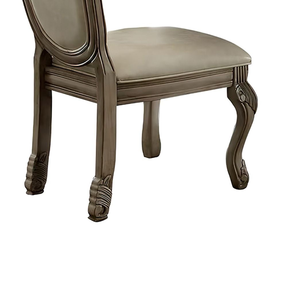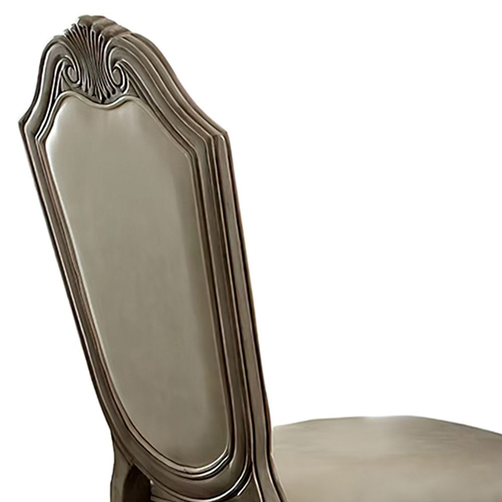 Elegant Design: The Chateau De Ville Side Chair features a classic and elegant design, perfect for adding a touch of sophistication to any dining space. High-Quality Finish: The chair comes with a beautiful PU (polyurethane) finish combined with an antique white finish on the wood, creating a stunning contrast that enhances its overall aesthetic appeal. Comfortable Upholstered Seat: The chair’s seat is upholstered in a durable and soft material, providing a comfortable seating experience during meal times. The upholstery is designed with a solid pattern, adding a touch of refinement to the chair’s appearance. Armless Chair with High Backrest: The chair is designed without arms, allowing for easy movement and providing a spacious seating arrangement. The high backrest offers excellent support and promotes good posture while seated. Padded Seat and Back: Both the seat and back of the chair are generously padded with PU cushioning, ensuring optimal comfort during extended periods of sitting. The cushioning provides a plush feel and helps reduce fatigue. Stylish Arched Backrest: The chair features an arched backrest with decorative element in wood trim with raised motifs. This design detail adds an element of elegance and visual interest to the chair’s overall appearance.